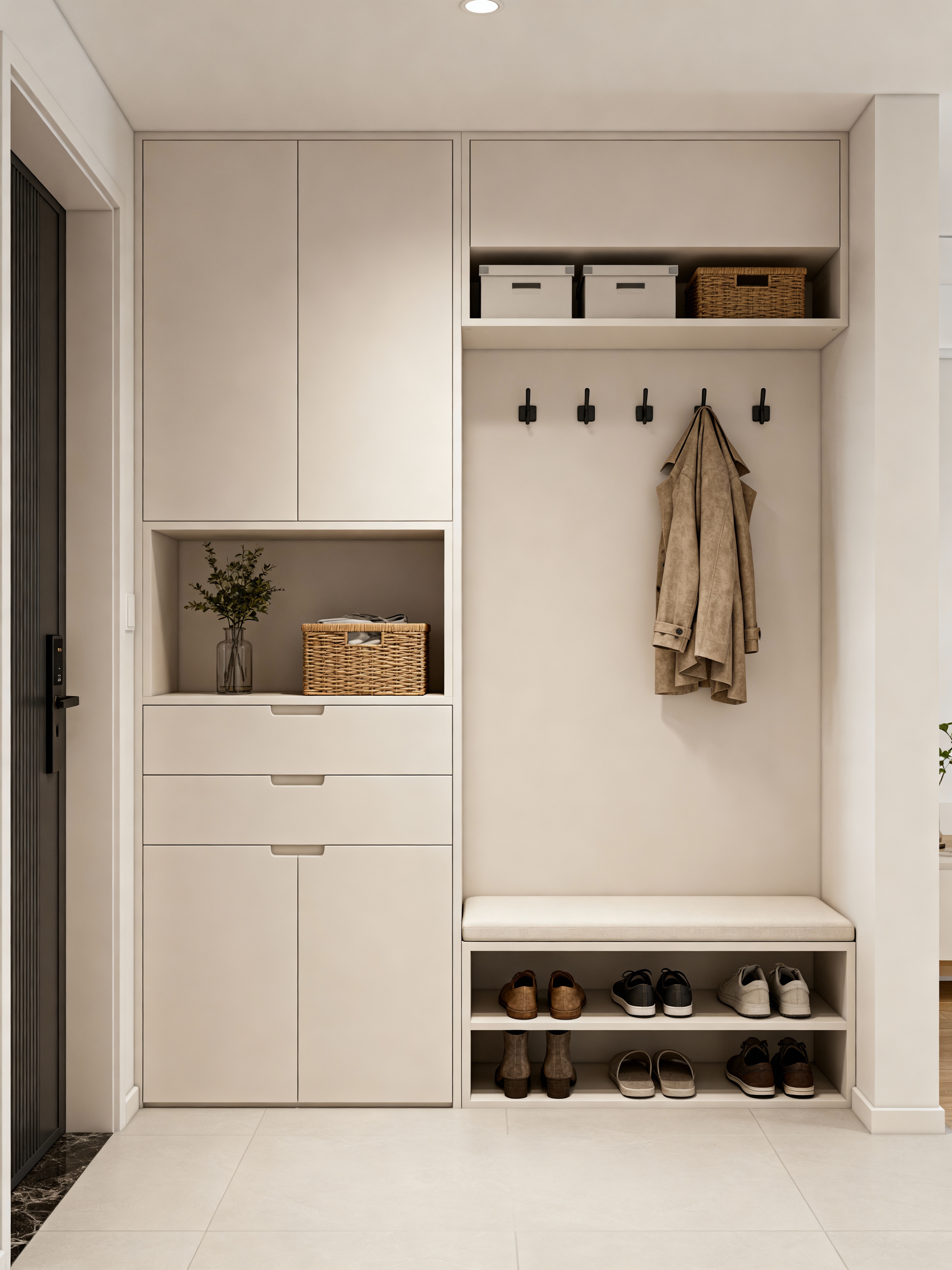 drop zone with simple style with shelves for shoes and storage drawers and cabinets and cubbies and storage baskets and a bench and high up storage and wall hooks for coats. . with essential pieces and uncluttered space and clean design and streamlined look and pure simplicity and calm atmosphere and functional furniture and minimal decor