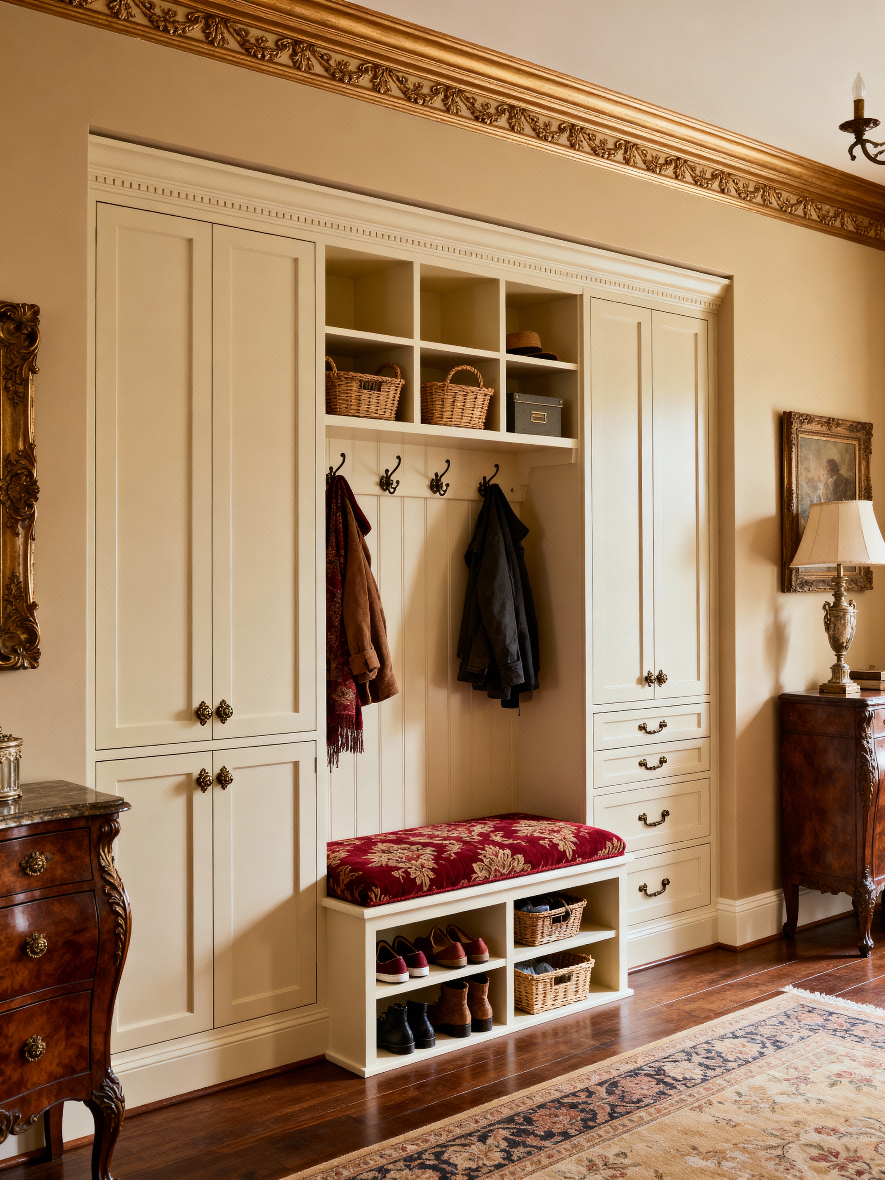 drop zone with traditional style with cabinets and cubbies and a bench and shelves for shoes and storage baskets and storage drawers and wall hooks for coats and lockers. . with refined atmosphere and antique pieces and formal furniture and warm colors and timeless design and ornate details and crown molding and rich fabrics