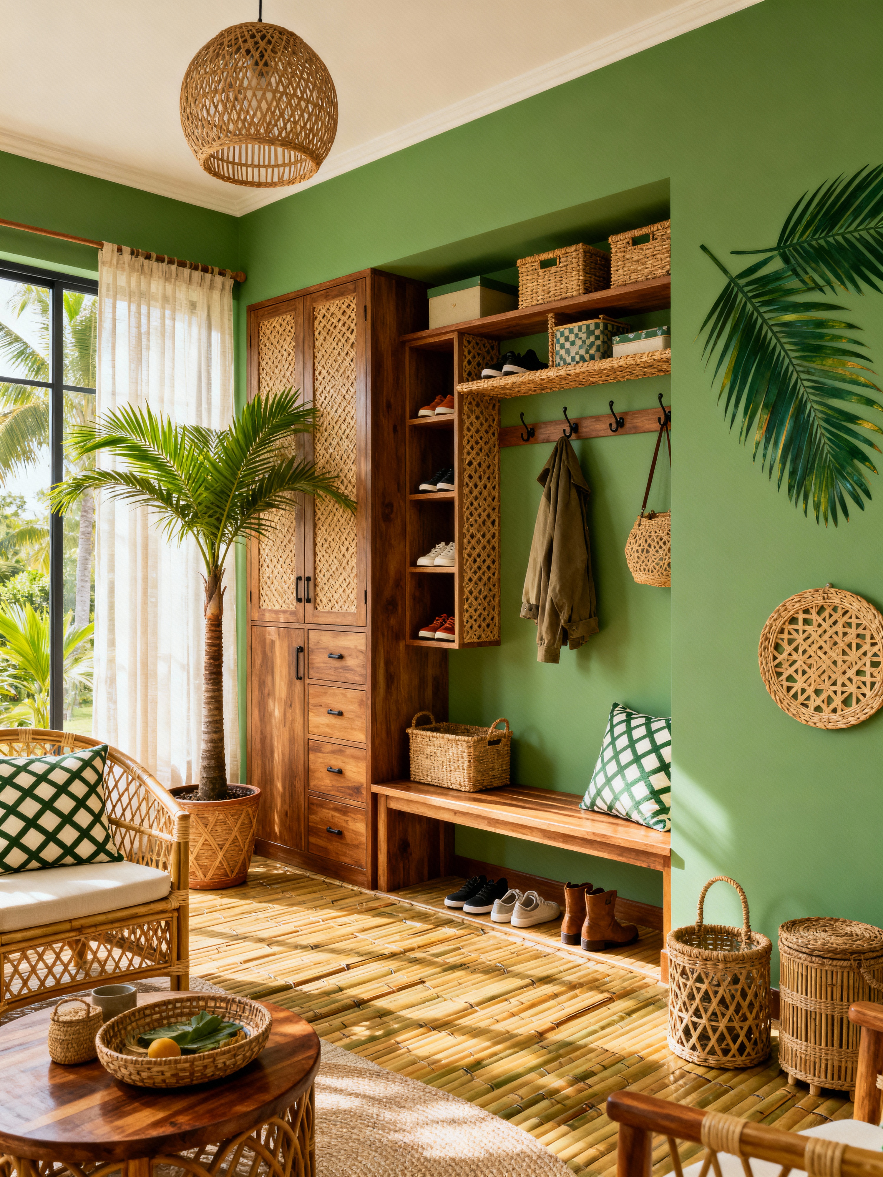 drop zone with tropical style with a bench and shelves for shoes and cubbies and cabinets and storage baskets and storage drawers and lockers and wall hooks for coats. . with rattan and palm trees and lattice prints and teak and wicker and cane motifs and palm leaves and bamboo