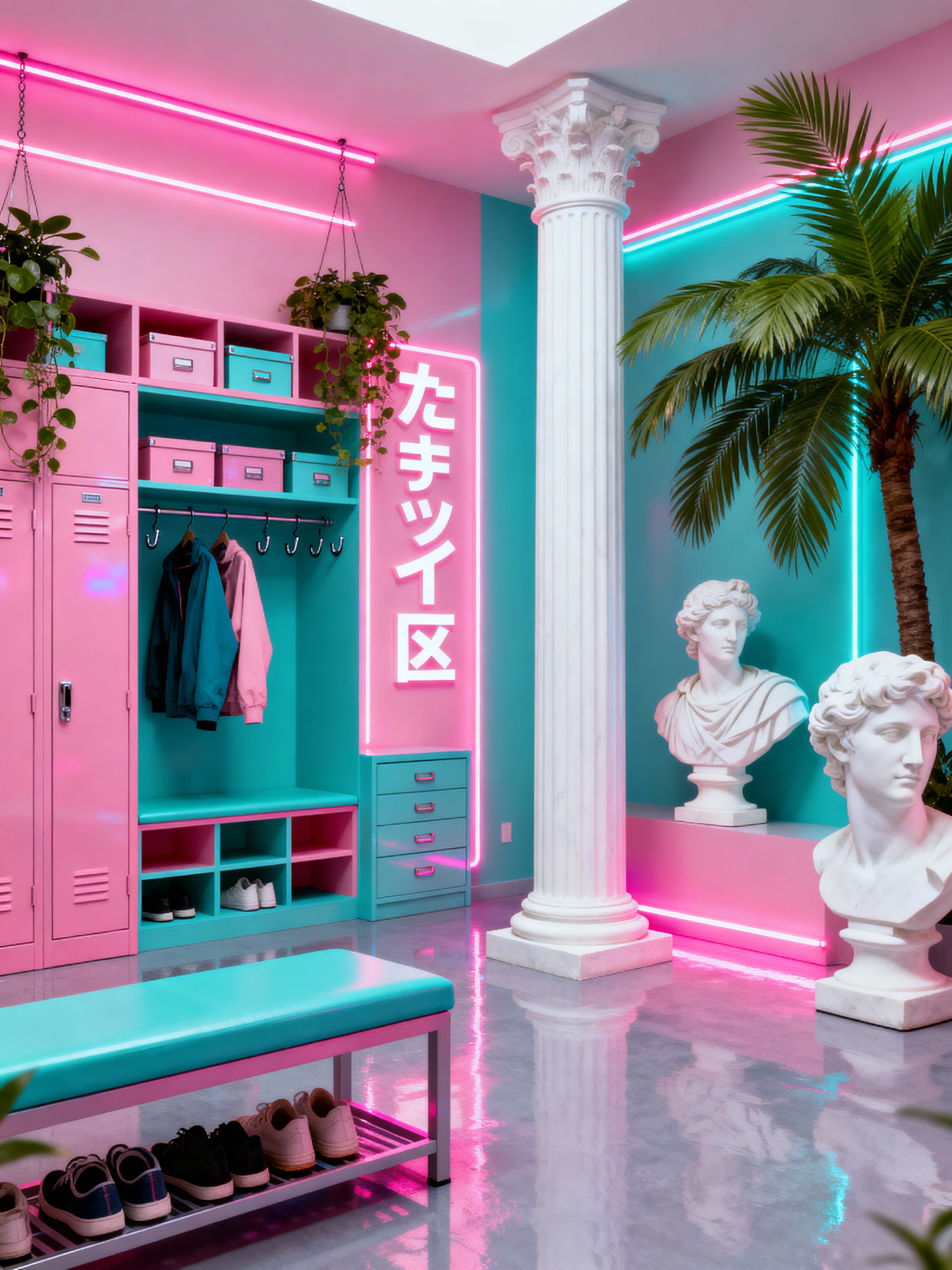 drop zone with vaporwave style with lockers and cabinets and cubbies and wall hooks for coats and high up storage and storage drawers and a bench and shelves for shoes. . with hanging plants and palm trees and bright pink and neon glow and japanese letters on wall and palm trees and white roman statues, white roman sculptures, white roman columns, white roman pillars in the center of the room, and teal colors