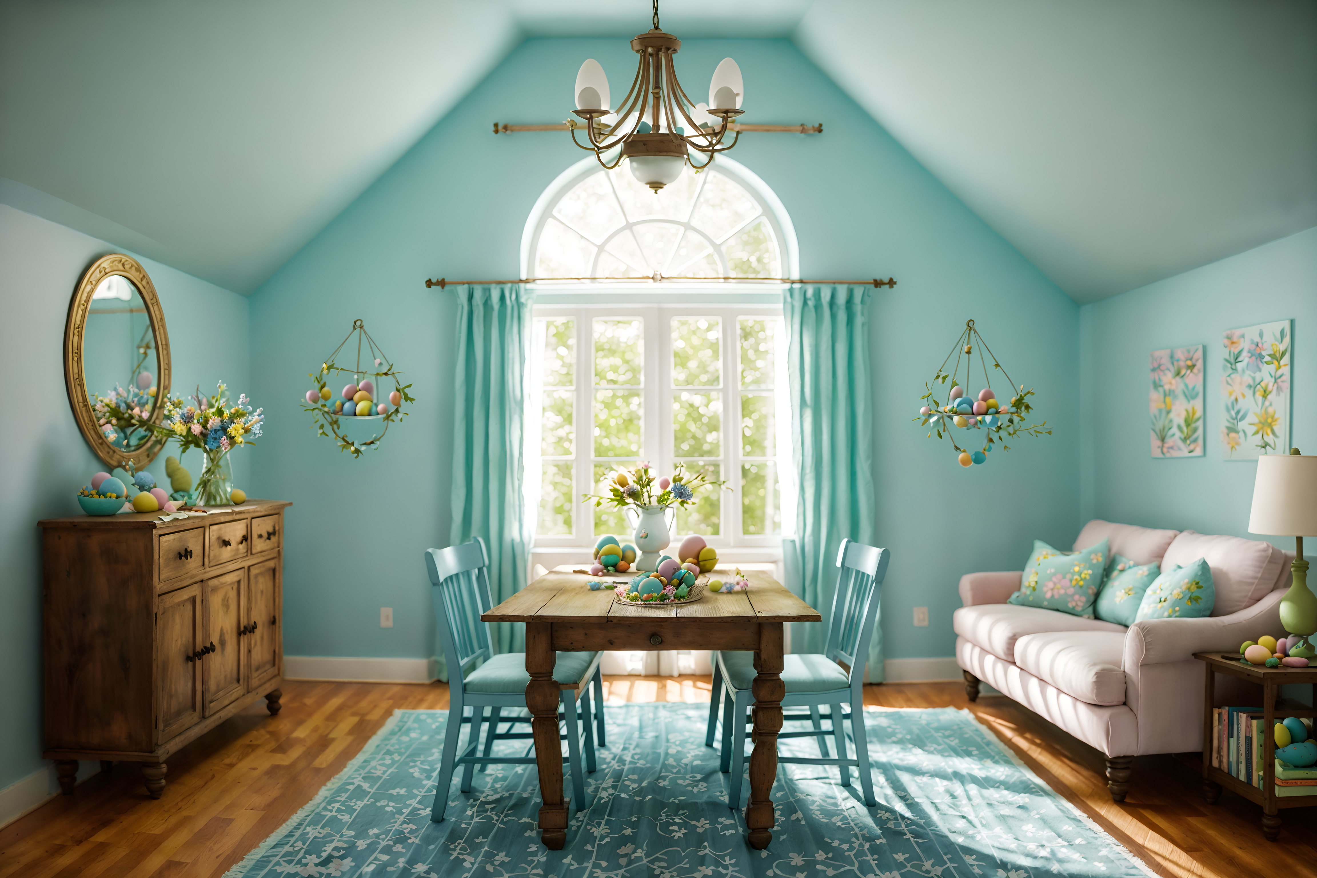 photo from pinterest of easter-style interior designed (attic interior) . with spring decorations and easter decorations and light blue colors and flowers on table and colorful easter eggs and spring decorations. . cinematic photo, highly detailed, cinematic lighting, ultra-detailed, ultrarealistic, photorealism, 8k. trending on pinterest. easter interior design style. masterpiece, cinematic light, ultrarealistic+, photorealistic+, 8k, raw photo, realistic, sharp focus on eyes, (symmetrical eyes), (intact eyes), hyperrealistic, highest quality, best quality, , highly detailed, masterpiece, best quality, extremely detailed 8k wallpaper, masterpiece, best quality, ultra-detailed, best shadow, detailed background, detailed face, detailed eyes, high contrast, best illumination, detailed face, dulux, caustic, dynamic angle, detailed glow. dramatic lighting. highly detailed, insanely detailed hair, symmetrical, intricate details, professionally retouched, 8k high definition. strong bokeh. award winning photo.