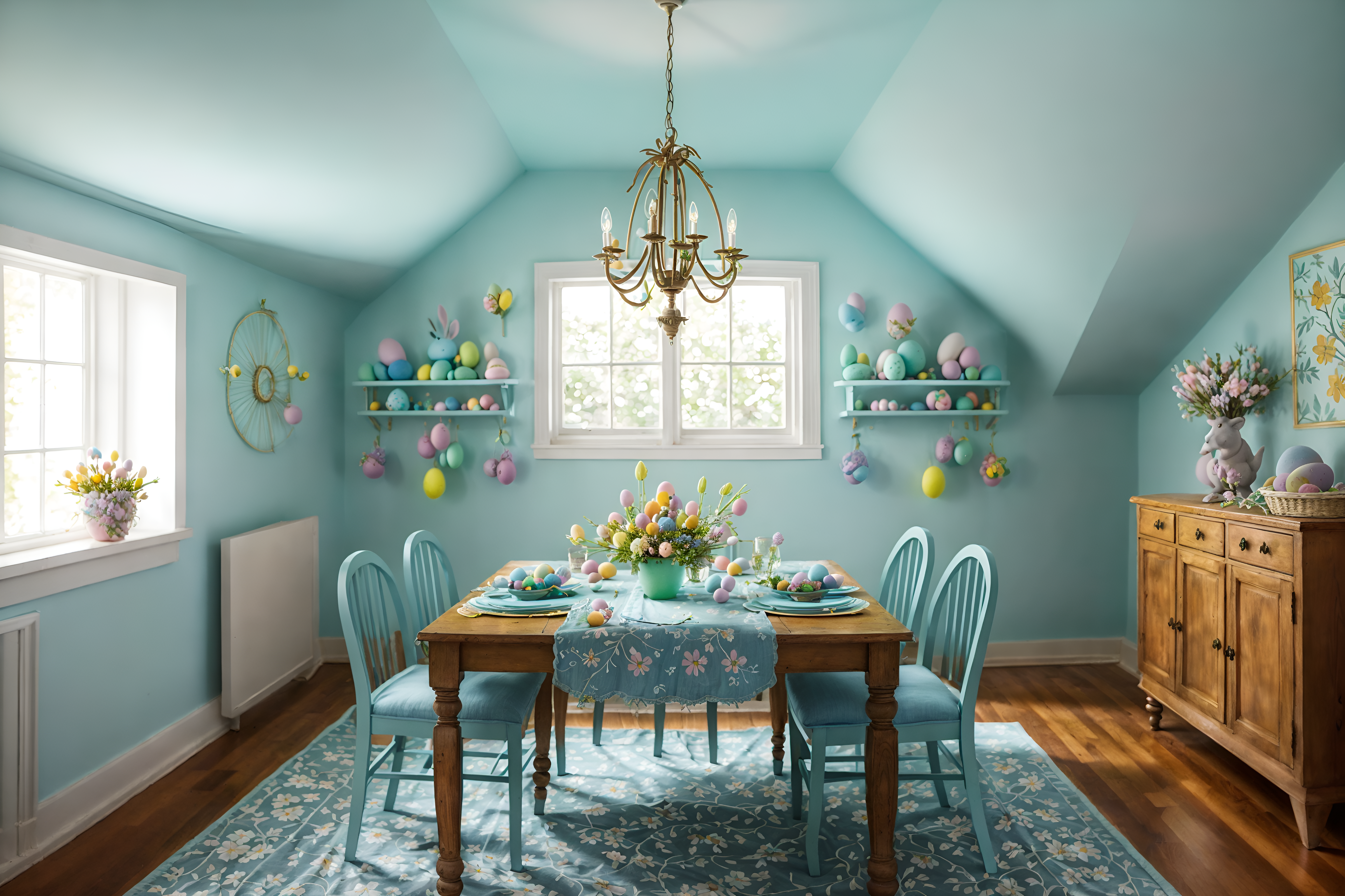 photo from pinterest of easter-style interior designed (attic interior) . with spring decorations and easter decorations and light blue colors and flowers on table and colorful easter eggs and spring decorations. . cinematic photo, highly detailed, cinematic lighting, ultra-detailed, ultrarealistic, photorealism, 8k. trending on pinterest. easter interior design style. masterpiece, cinematic light, ultrarealistic+, photorealistic+, 8k, raw photo, realistic, sharp focus on eyes, (symmetrical eyes), (intact eyes), hyperrealistic, highest quality, best quality, , highly detailed, masterpiece, best quality, extremely detailed 8k wallpaper, masterpiece, best quality, ultra-detailed, best shadow, detailed background, detailed face, detailed eyes, high contrast, best illumination, detailed face, dulux, caustic, dynamic angle, detailed glow. dramatic lighting. highly detailed, insanely detailed hair, symmetrical, intricate details, professionally retouched, 8k high definition. strong bokeh. award winning photo.