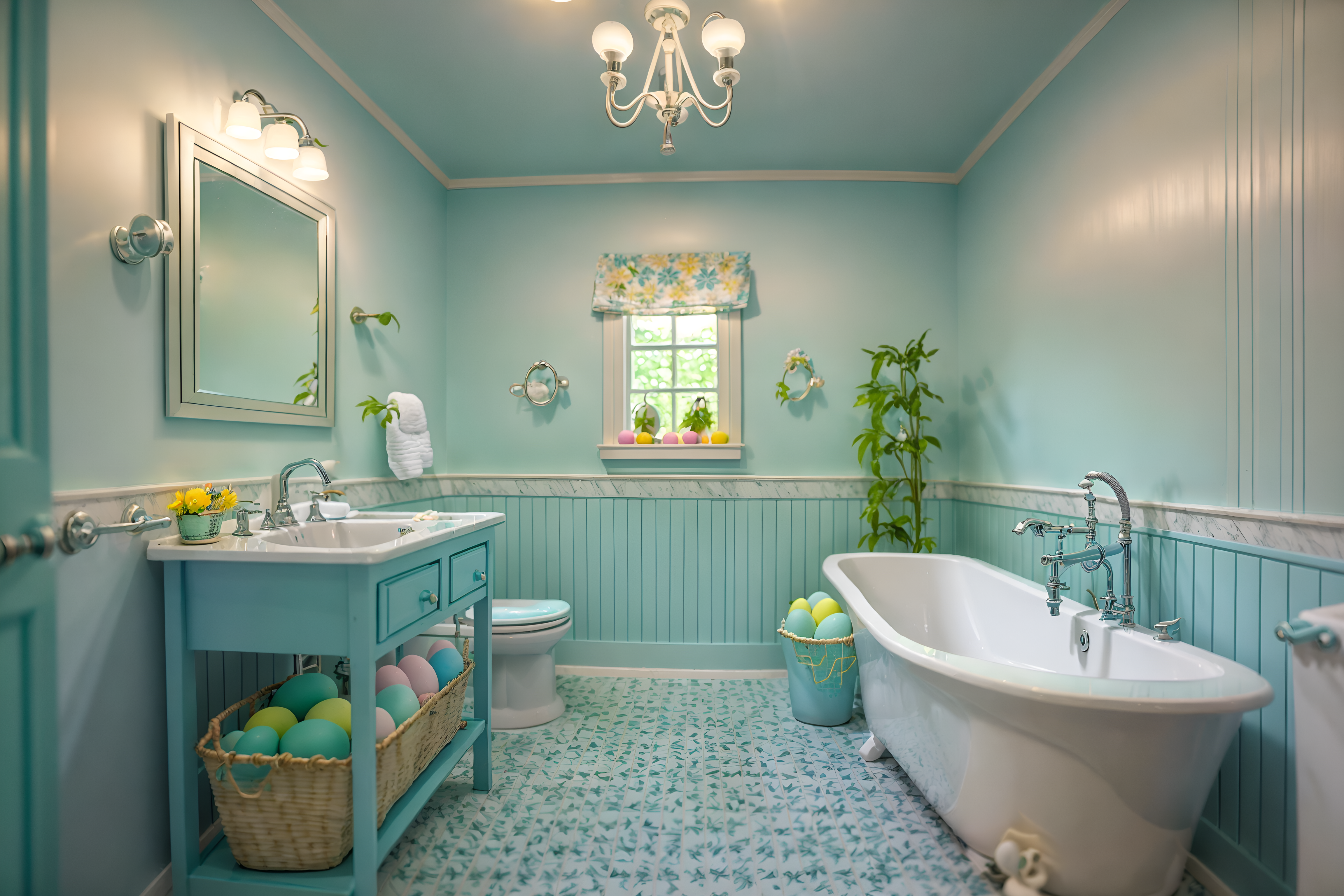 easter bathroomsinterior decorate this bathroom with easter style. . . with bath rail and bathtub and plant and bathroom cabinet and shower and waste basket and bathroom sink with faucet and mirror. . with spring decorations and colorful easter eggs and light blue colors and flowers on table and easter decorations and spring decorations. . .