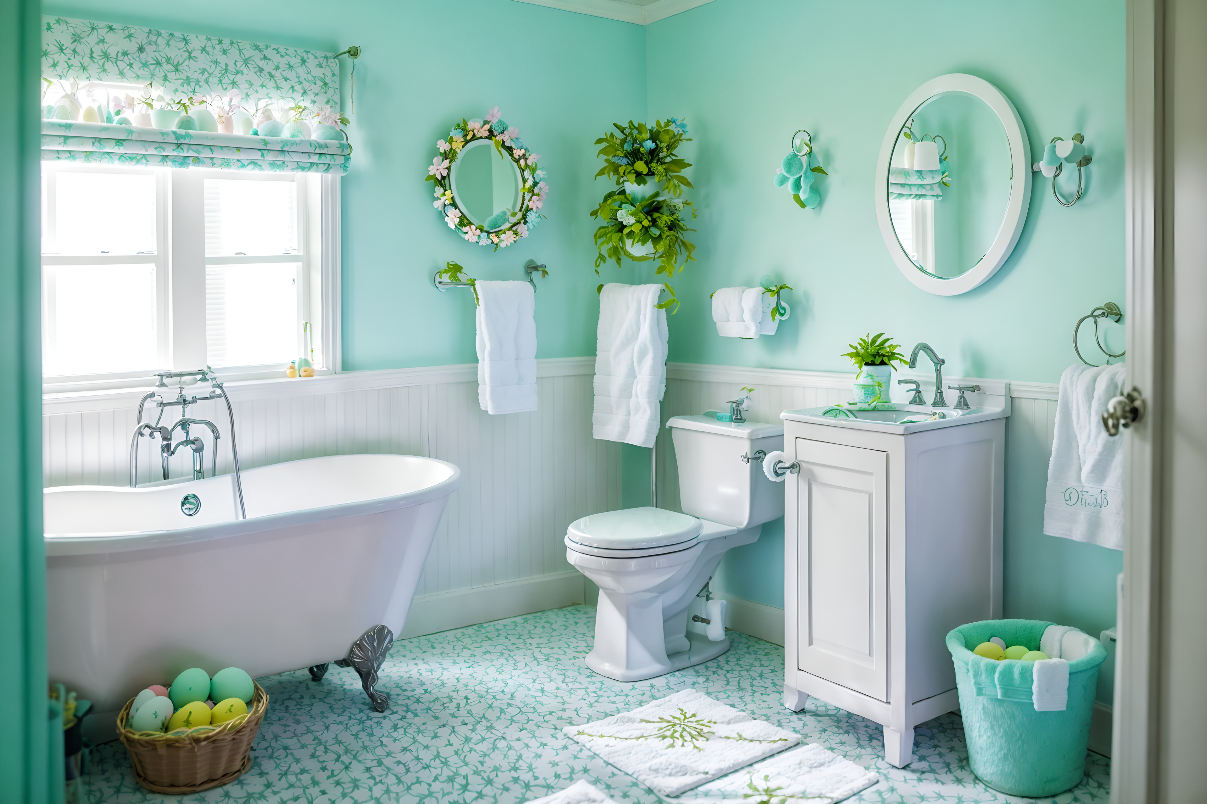 easter bathroomsinterior decorate this bathroom with easter style. . . with bath rail and bathtub and plant and bathroom cabinet and shower and waste basket and bathroom sink with faucet and mirror. . with spring decorations and colorful easter eggs and light blue colors and flowers on table and easter decorations and spring decorations. . .