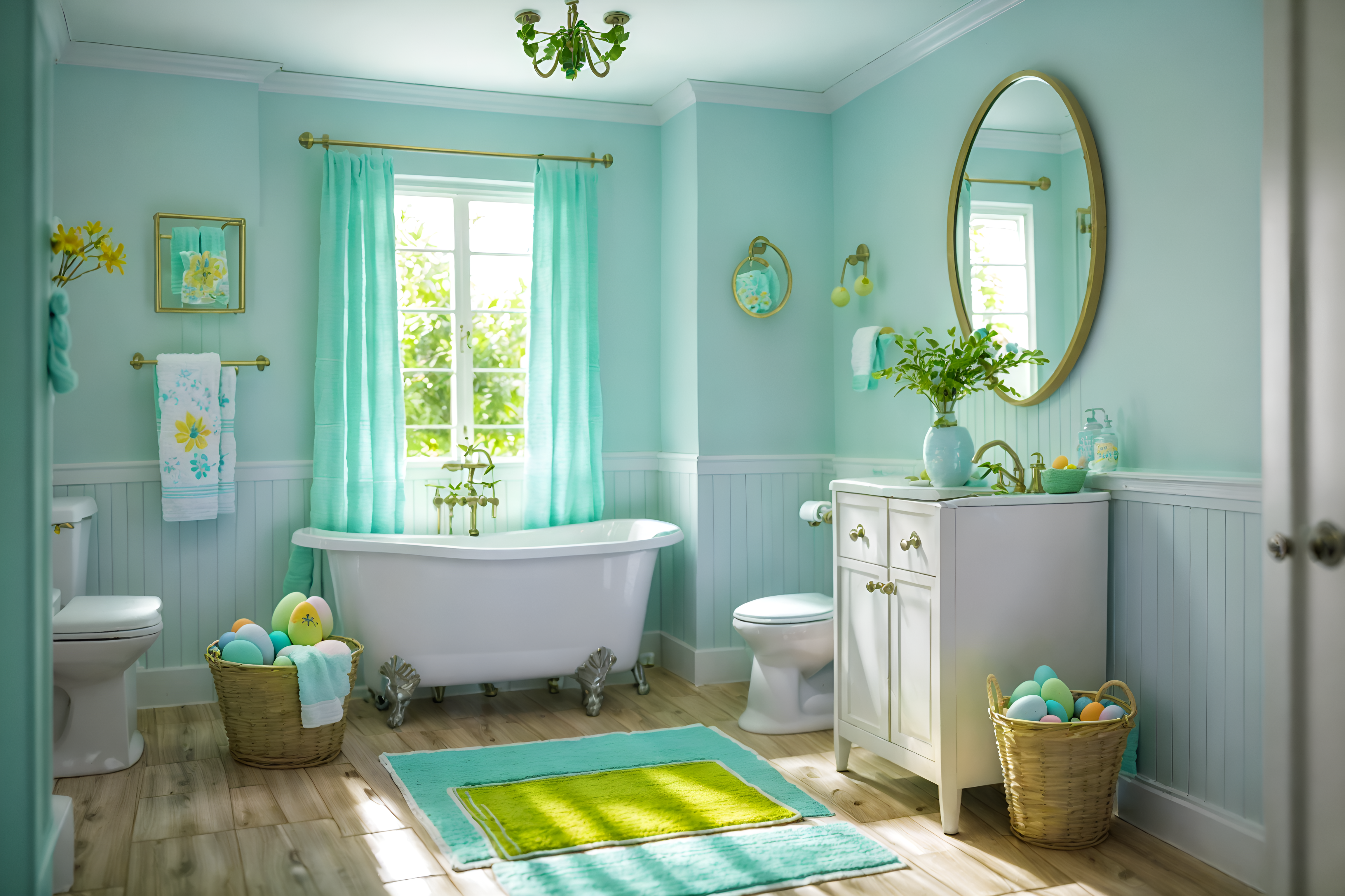 photo from pinterest of easter-style interior designed (bathroom interior) with toilet seat and mirror and bathroom cabinet and waste basket and bath towel and bath rail and bathtub and plant. . with spring decorations and easter decorations and colorful easter eggs and light blue colors and flowers on table and spring decorations. . cinematic photo, highly detailed, cinematic lighting, ultra-detailed, ultrarealistic, photorealism, 8k. trending on pinterest. easter interior design style. masterpiece, cinematic light, ultrarealistic+, photorealistic+, 8k, raw photo, realistic, sharp focus on eyes, (symmetrical eyes), (intact eyes), hyperrealistic, highest quality, best quality, , highly detailed, masterpiece, best quality, extremely detailed 8k wallpaper, masterpiece, best quality, ultra-detailed, best shadow, detailed background, detailed face, detailed eyes, high contrast, best illumination, detailed face, dulux, caustic, dynamic angle, detailed glow. dramatic lighting. highly detailed, insanely detailed hair, symmetrical, intricate details, professionally retouched, 8k high definition. strong bokeh. award winning photo.