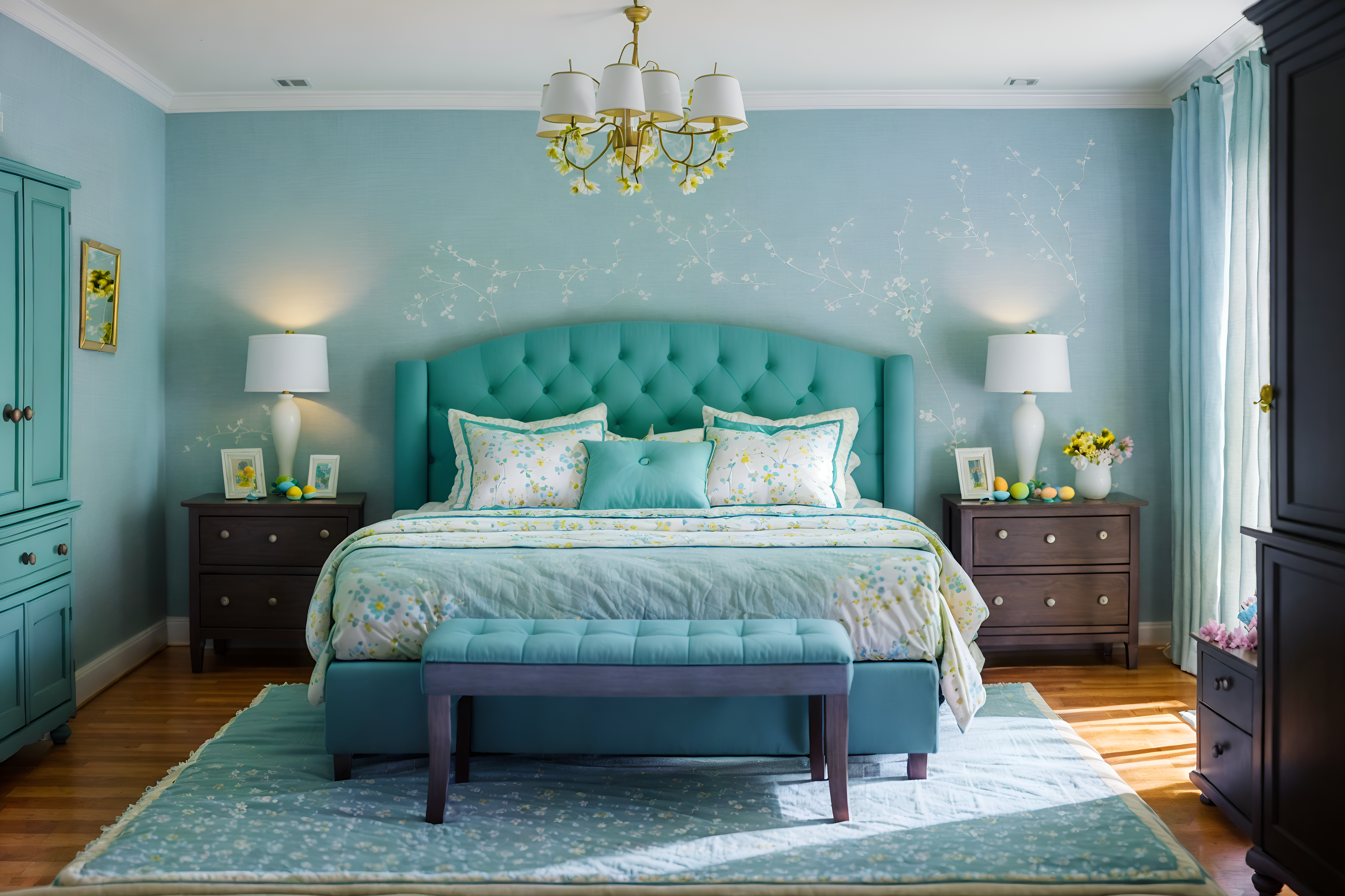 photo from pinterest of easter-style interior designed (bedroom interior) with accent chair and storage bench or ottoman and bed and night light and headboard and dresser closet and bedside table or night stand and mirror. . with flowers on table and spring decorations and light blue colors and easter decorations and colorful easter eggs and flowers on table. . cinematic photo, highly detailed, cinematic lighting, ultra-detailed, ultrarealistic, photorealism, 8k. trending on pinterest. easter interior design style. masterpiece, cinematic light, ultrarealistic+, photorealistic+, 8k, raw photo, realistic, sharp focus on eyes, (symmetrical eyes), (intact eyes), hyperrealistic, highest quality, best quality, , highly detailed, masterpiece, best quality, extremely detailed 8k wallpaper, masterpiece, best quality, ultra-detailed, best shadow, detailed background, detailed face, detailed eyes, high contrast, best illumination, detailed face, dulux, caustic, dynamic angle, detailed glow. dramatic lighting. highly detailed, insanely detailed hair, symmetrical, intricate details, professionally retouched, 8k high definition. strong bokeh. award winning photo.