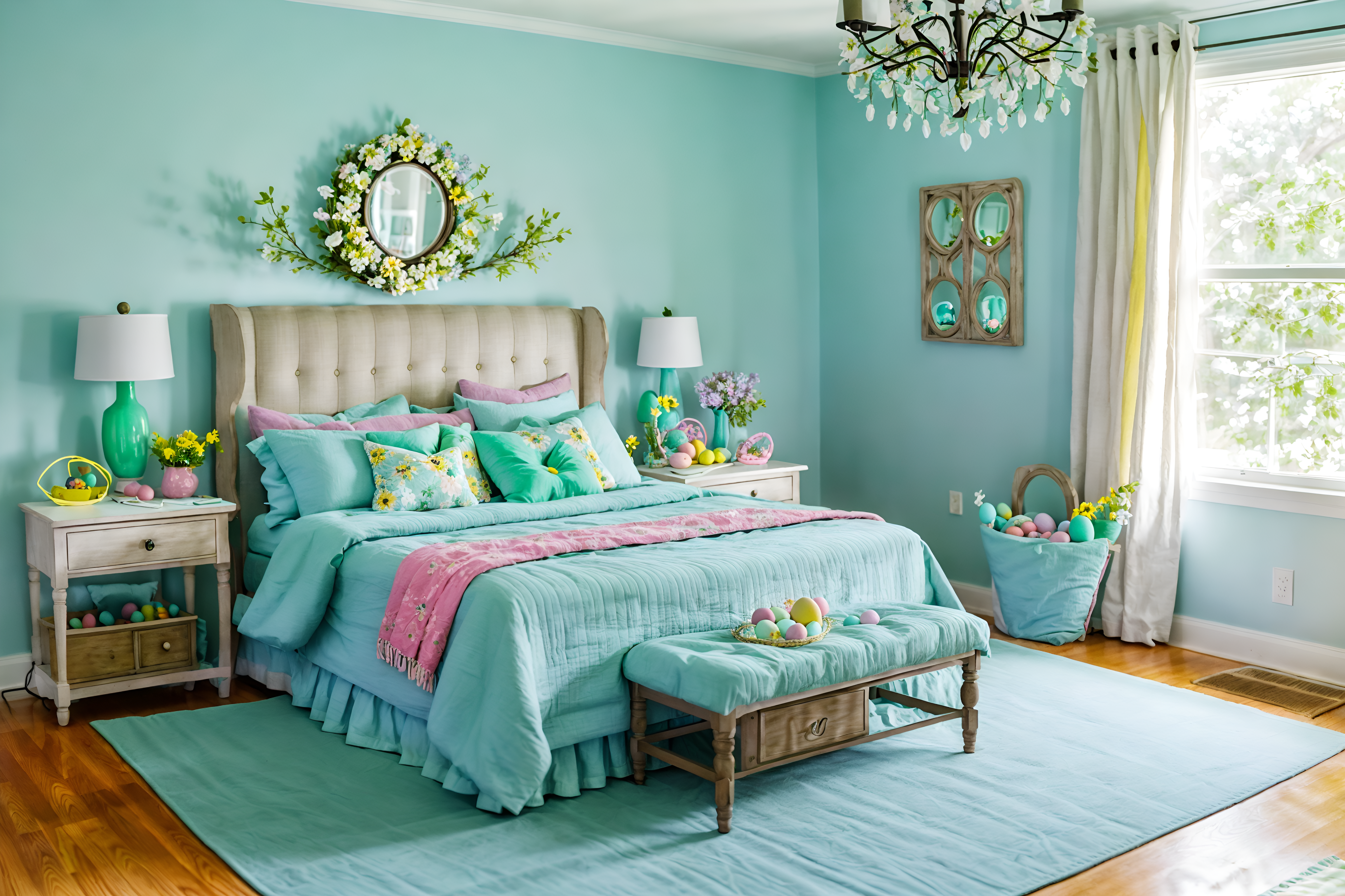 photo from pinterest of easter-style interior designed (bedroom interior) with accent chair and storage bench or ottoman and bed and night light and headboard and dresser closet and bedside table or night stand and mirror. . with flowers on table and spring decorations and light blue colors and easter decorations and colorful easter eggs and flowers on table. . cinematic photo, highly detailed, cinematic lighting, ultra-detailed, ultrarealistic, photorealism, 8k. trending on pinterest. easter interior design style. masterpiece, cinematic light, ultrarealistic+, photorealistic+, 8k, raw photo, realistic, sharp focus on eyes, (symmetrical eyes), (intact eyes), hyperrealistic, highest quality, best quality, , highly detailed, masterpiece, best quality, extremely detailed 8k wallpaper, masterpiece, best quality, ultra-detailed, best shadow, detailed background, detailed face, detailed eyes, high contrast, best illumination, detailed face, dulux, caustic, dynamic angle, detailed glow. dramatic lighting. highly detailed, insanely detailed hair, symmetrical, intricate details, professionally retouched, 8k high definition. strong bokeh. award winning photo.