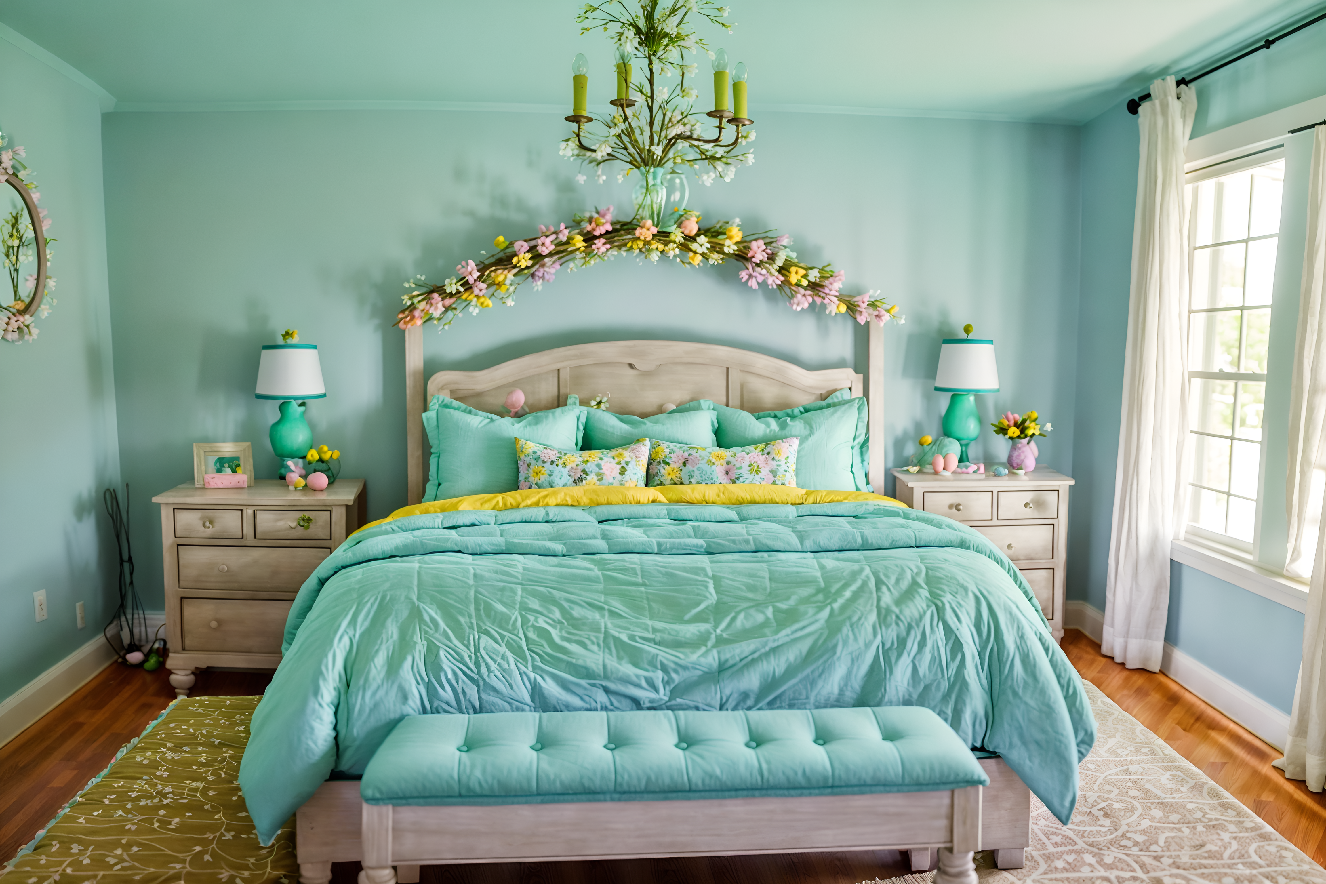 photo from pinterest of easter-style interior designed (bedroom interior) with accent chair and storage bench or ottoman and bed and night light and headboard and dresser closet and bedside table or night stand and mirror. . with flowers on table and spring decorations and light blue colors and easter decorations and colorful easter eggs and flowers on table. . cinematic photo, highly detailed, cinematic lighting, ultra-detailed, ultrarealistic, photorealism, 8k. trending on pinterest. easter interior design style. masterpiece, cinematic light, ultrarealistic+, photorealistic+, 8k, raw photo, realistic, sharp focus on eyes, (symmetrical eyes), (intact eyes), hyperrealistic, highest quality, best quality, , highly detailed, masterpiece, best quality, extremely detailed 8k wallpaper, masterpiece, best quality, ultra-detailed, best shadow, detailed background, detailed face, detailed eyes, high contrast, best illumination, detailed face, dulux, caustic, dynamic angle, detailed glow. dramatic lighting. highly detailed, insanely detailed hair, symmetrical, intricate details, professionally retouched, 8k high definition. strong bokeh. award winning photo.