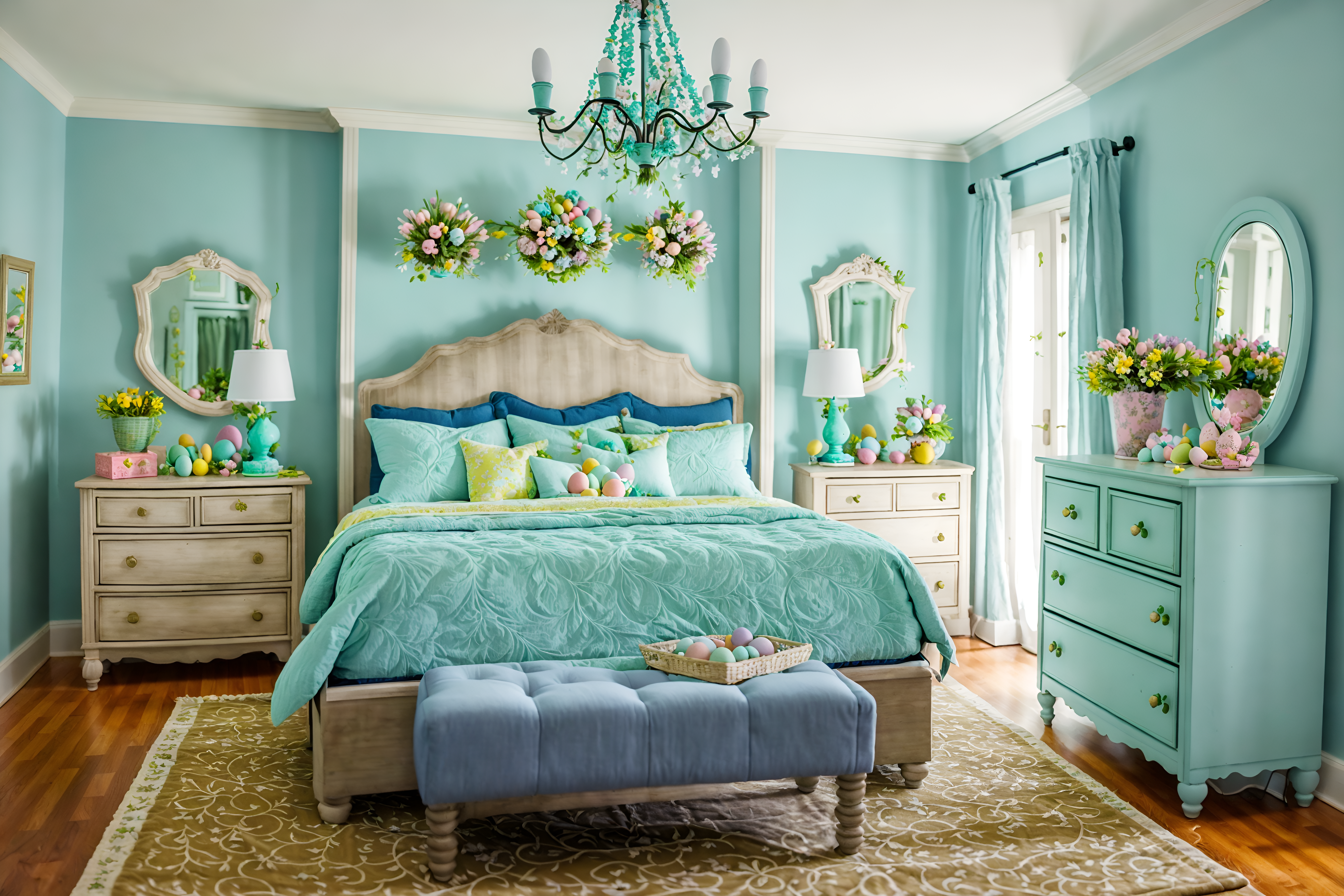 photo from pinterest of easter-style interior designed (bedroom interior) with accent chair and storage bench or ottoman and bed and night light and headboard and dresser closet and bedside table or night stand and mirror. . with flowers on table and spring decorations and light blue colors and easter decorations and colorful easter eggs and flowers on table. . cinematic photo, highly detailed, cinematic lighting, ultra-detailed, ultrarealistic, photorealism, 8k. trending on pinterest. easter interior design style. masterpiece, cinematic light, ultrarealistic+, photorealistic+, 8k, raw photo, realistic, sharp focus on eyes, (symmetrical eyes), (intact eyes), hyperrealistic, highest quality, best quality, , highly detailed, masterpiece, best quality, extremely detailed 8k wallpaper, masterpiece, best quality, ultra-detailed, best shadow, detailed background, detailed face, detailed eyes, high contrast, best illumination, detailed face, dulux, caustic, dynamic angle, detailed glow. dramatic lighting. highly detailed, insanely detailed hair, symmetrical, intricate details, professionally retouched, 8k high definition. strong bokeh. award winning photo.