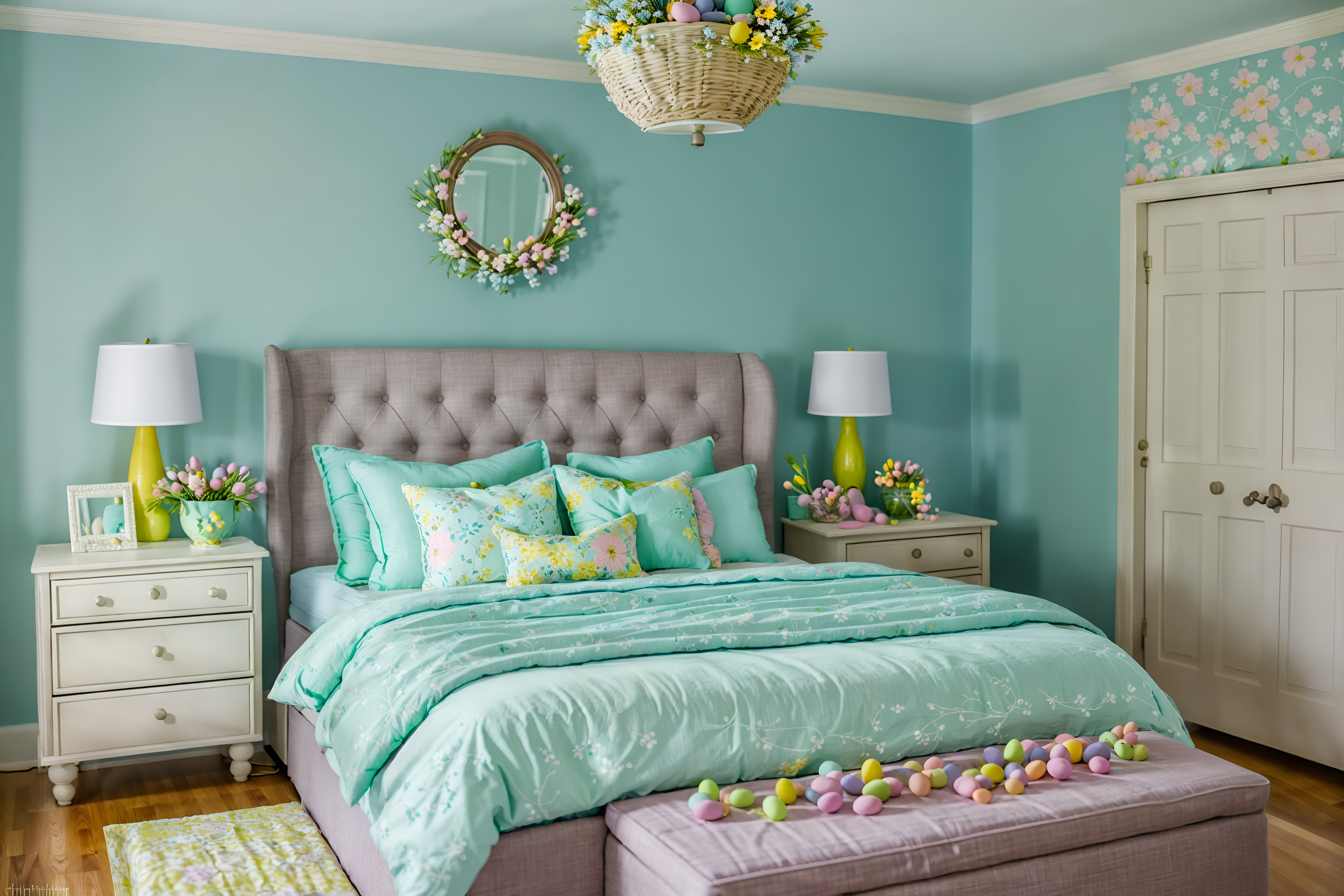 easter bedroomsinterior decorate this bedroom with easter style. . . with mirror and accent chair and plant and dresser closet and headboard and storage bench or ottoman and bed and bedside table or night stand. . with flowers on table and easter decorations and colorful easter eggs and light blue colors and spring decorations and flowers on table. . .