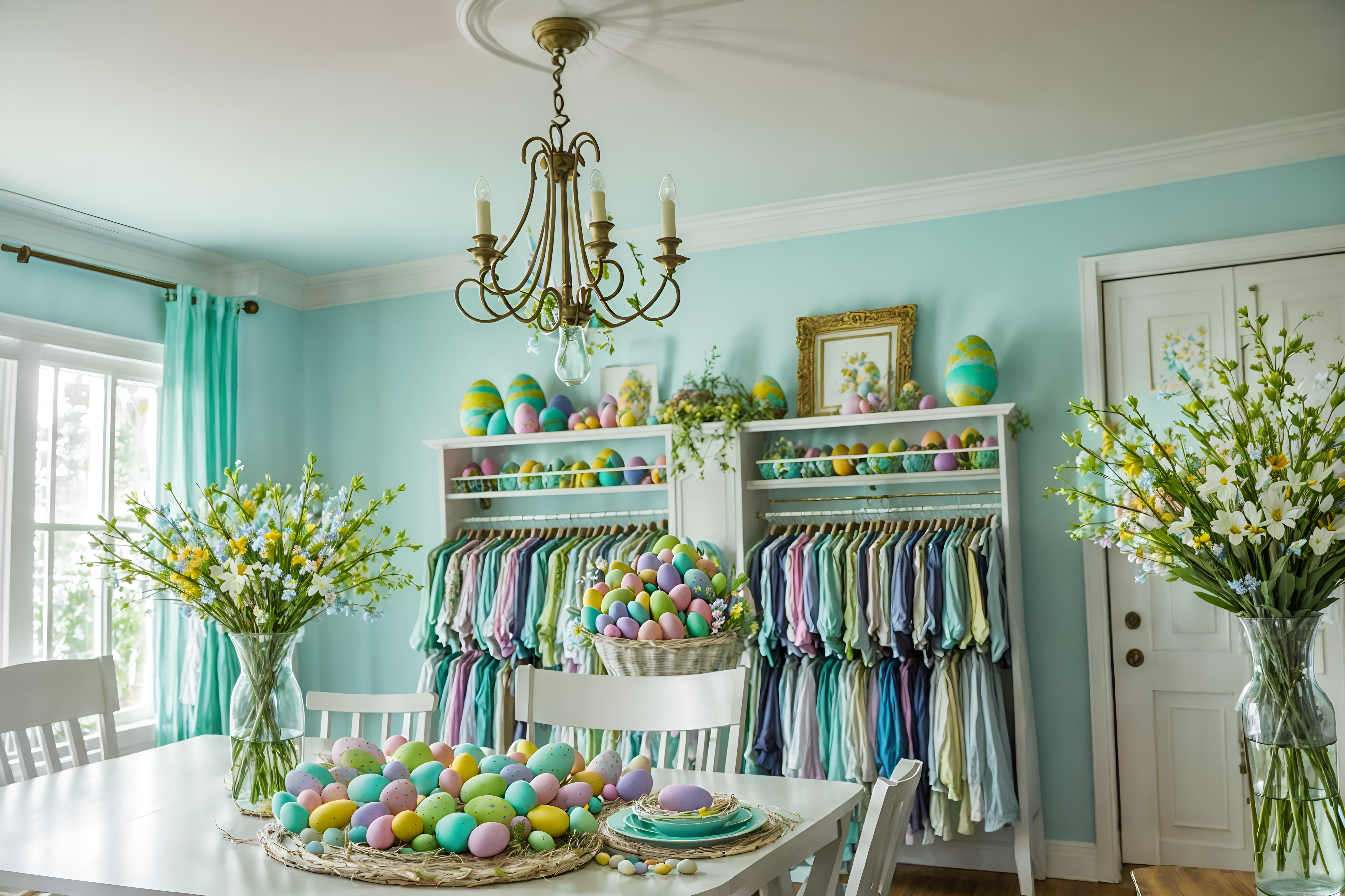 photo from pinterest of easter-style interior designed (clothing store interior) . with flowers on table and light blue colors and spring decorations and colorful easter eggs and easter decorations and flowers on table. . cinematic photo, highly detailed, cinematic lighting, ultra-detailed, ultrarealistic, photorealism, 8k. trending on pinterest. easter interior design style. masterpiece, cinematic light, ultrarealistic+, photorealistic+, 8k, raw photo, realistic, sharp focus on eyes, (symmetrical eyes), (intact eyes), hyperrealistic, highest quality, best quality, , highly detailed, masterpiece, best quality, extremely detailed 8k wallpaper, masterpiece, best quality, ultra-detailed, best shadow, detailed background, detailed face, detailed eyes, high contrast, best illumination, detailed face, dulux, caustic, dynamic angle, detailed glow. dramatic lighting. highly detailed, insanely detailed hair, symmetrical, intricate details, professionally retouched, 8k high definition. strong bokeh. award winning photo.