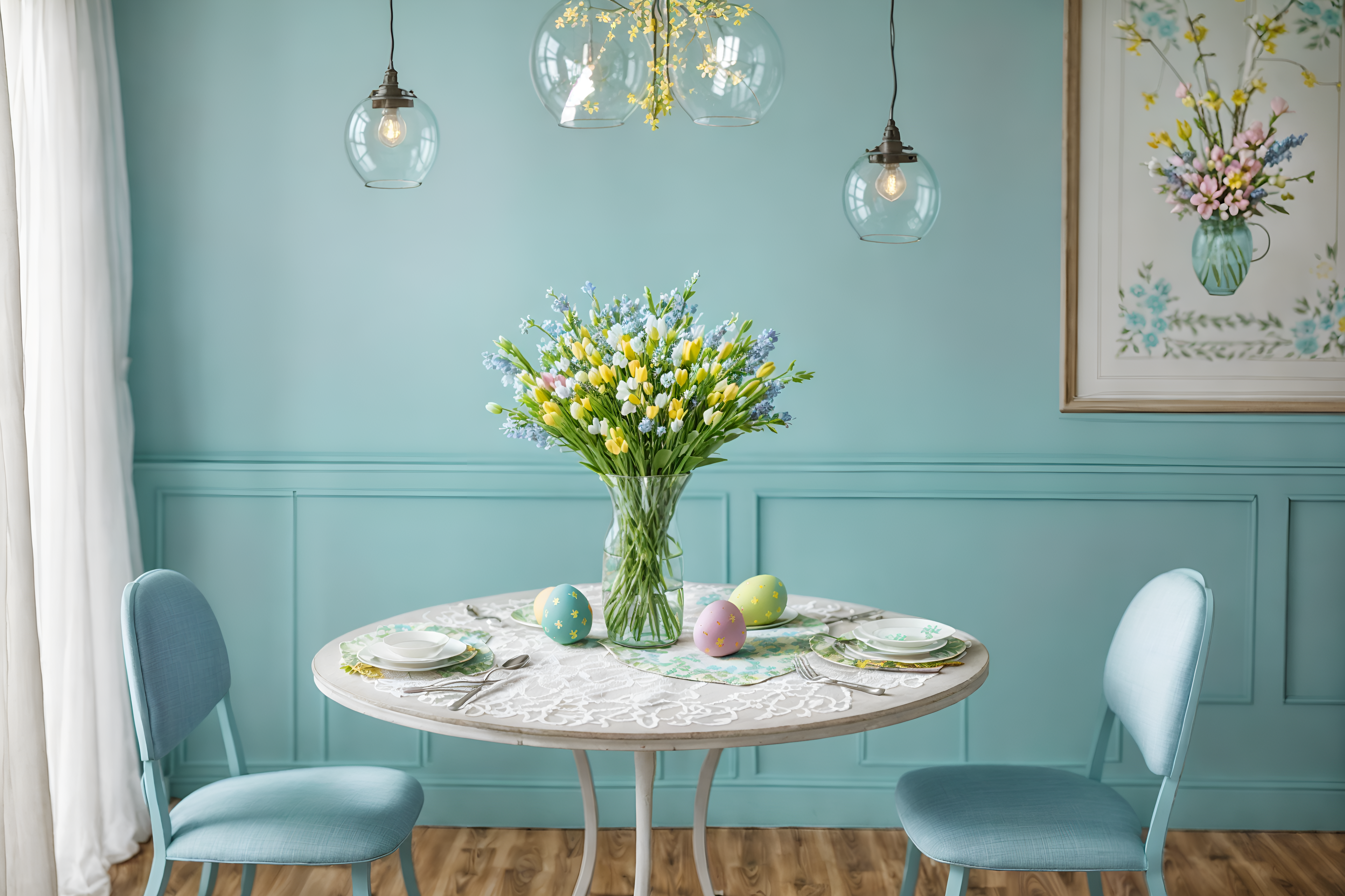 photo from pinterest of easter-style interior designed (clothing store interior) . with flowers on table and light blue colors and spring decorations and colorful easter eggs and easter decorations and flowers on table. . cinematic photo, highly detailed, cinematic lighting, ultra-detailed, ultrarealistic, photorealism, 8k. trending on pinterest. easter interior design style. masterpiece, cinematic light, ultrarealistic+, photorealistic+, 8k, raw photo, realistic, sharp focus on eyes, (symmetrical eyes), (intact eyes), hyperrealistic, highest quality, best quality, , highly detailed, masterpiece, best quality, extremely detailed 8k wallpaper, masterpiece, best quality, ultra-detailed, best shadow, detailed background, detailed face, detailed eyes, high contrast, best illumination, detailed face, dulux, caustic, dynamic angle, detailed glow. dramatic lighting. highly detailed, insanely detailed hair, symmetrical, intricate details, professionally retouched, 8k high definition. strong bokeh. award winning photo.