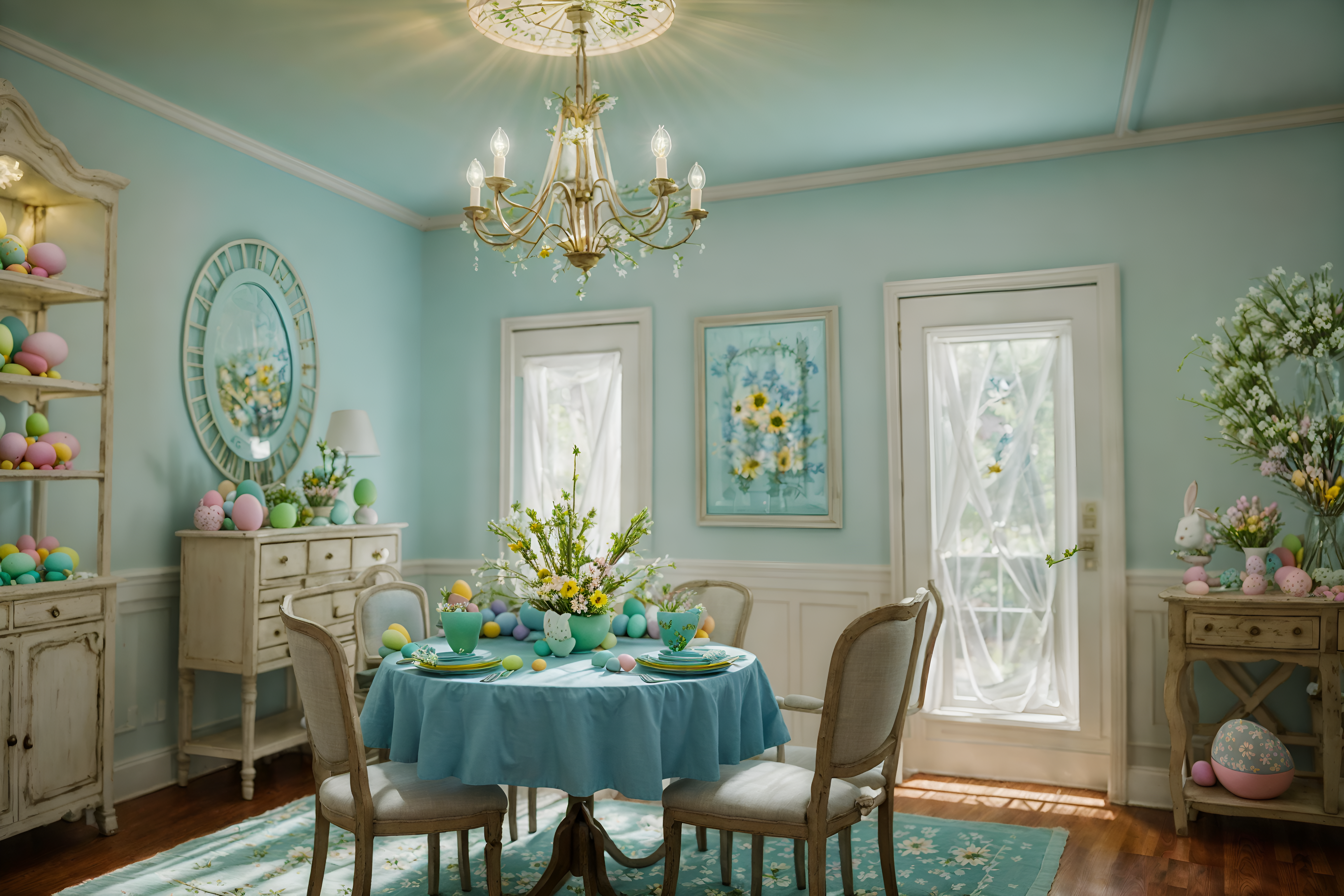 photo from pinterest of easter-style interior designed (clothing store interior) . with flowers on table and light blue colors and spring decorations and colorful easter eggs and easter decorations and flowers on table. . cinematic photo, highly detailed, cinematic lighting, ultra-detailed, ultrarealistic, photorealism, 8k. trending on pinterest. easter interior design style. masterpiece, cinematic light, ultrarealistic+, photorealistic+, 8k, raw photo, realistic, sharp focus on eyes, (symmetrical eyes), (intact eyes), hyperrealistic, highest quality, best quality, , highly detailed, masterpiece, best quality, extremely detailed 8k wallpaper, masterpiece, best quality, ultra-detailed, best shadow, detailed background, detailed face, detailed eyes, high contrast, best illumination, detailed face, dulux, caustic, dynamic angle, detailed glow. dramatic lighting. highly detailed, insanely detailed hair, symmetrical, intricate details, professionally retouched, 8k high definition. strong bokeh. award winning photo.