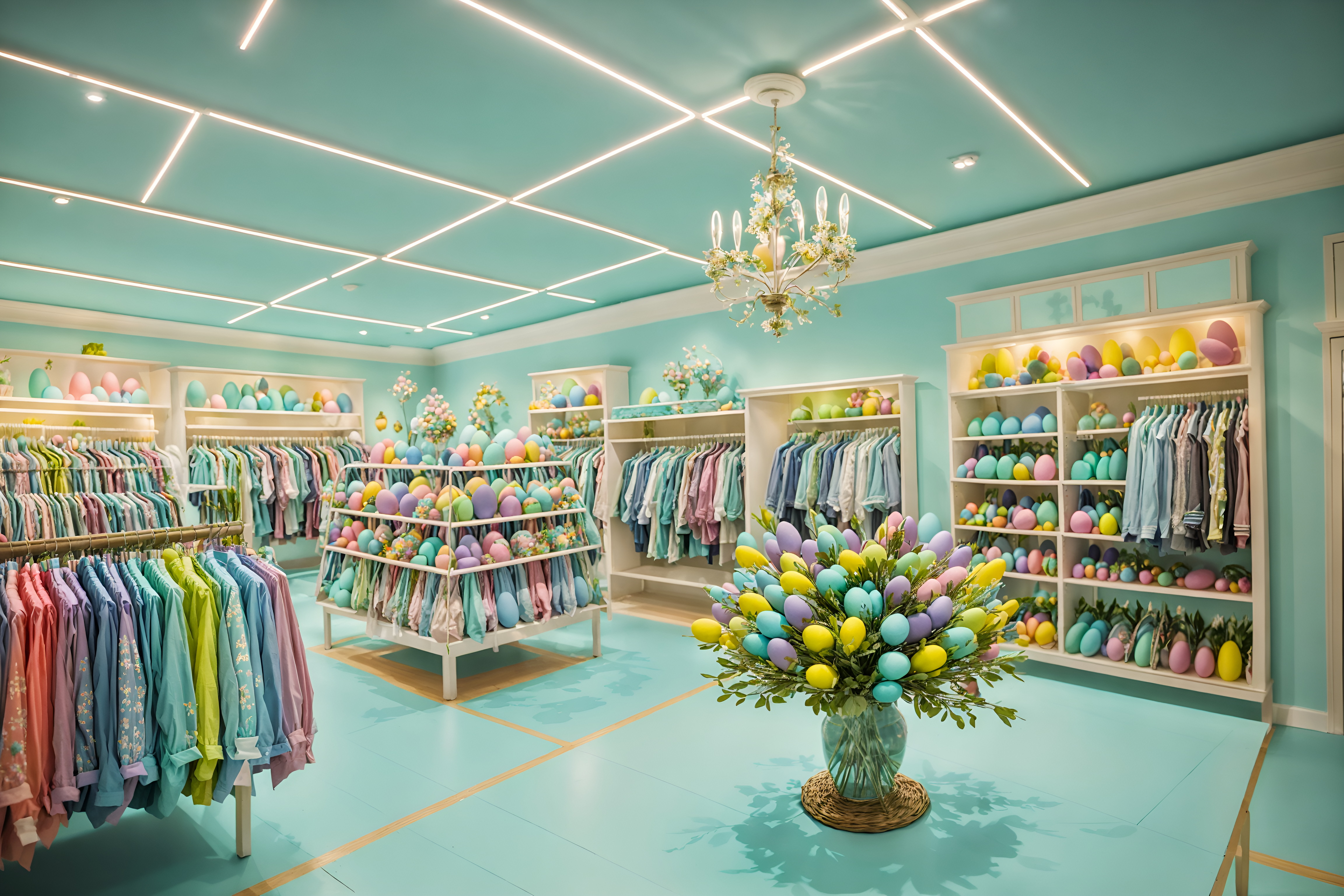 photo from pinterest of easter-style interior designed (clothing store interior) . with light blue colors and easter decorations and colorful easter eggs and spring decorations and flowers on table and light blue colors. . cinematic photo, highly detailed, cinematic lighting, ultra-detailed, ultrarealistic, photorealism, 8k. trending on pinterest. easter interior design style. masterpiece, cinematic light, ultrarealistic+, photorealistic+, 8k, raw photo, realistic, sharp focus on eyes, (symmetrical eyes), (intact eyes), hyperrealistic, highest quality, best quality, , highly detailed, masterpiece, best quality, extremely detailed 8k wallpaper, masterpiece, best quality, ultra-detailed, best shadow, detailed background, detailed face, detailed eyes, high contrast, best illumination, detailed face, dulux, caustic, dynamic angle, detailed glow. dramatic lighting. highly detailed, insanely detailed hair, symmetrical, intricate details, professionally retouched, 8k high definition. strong bokeh. award winning photo.