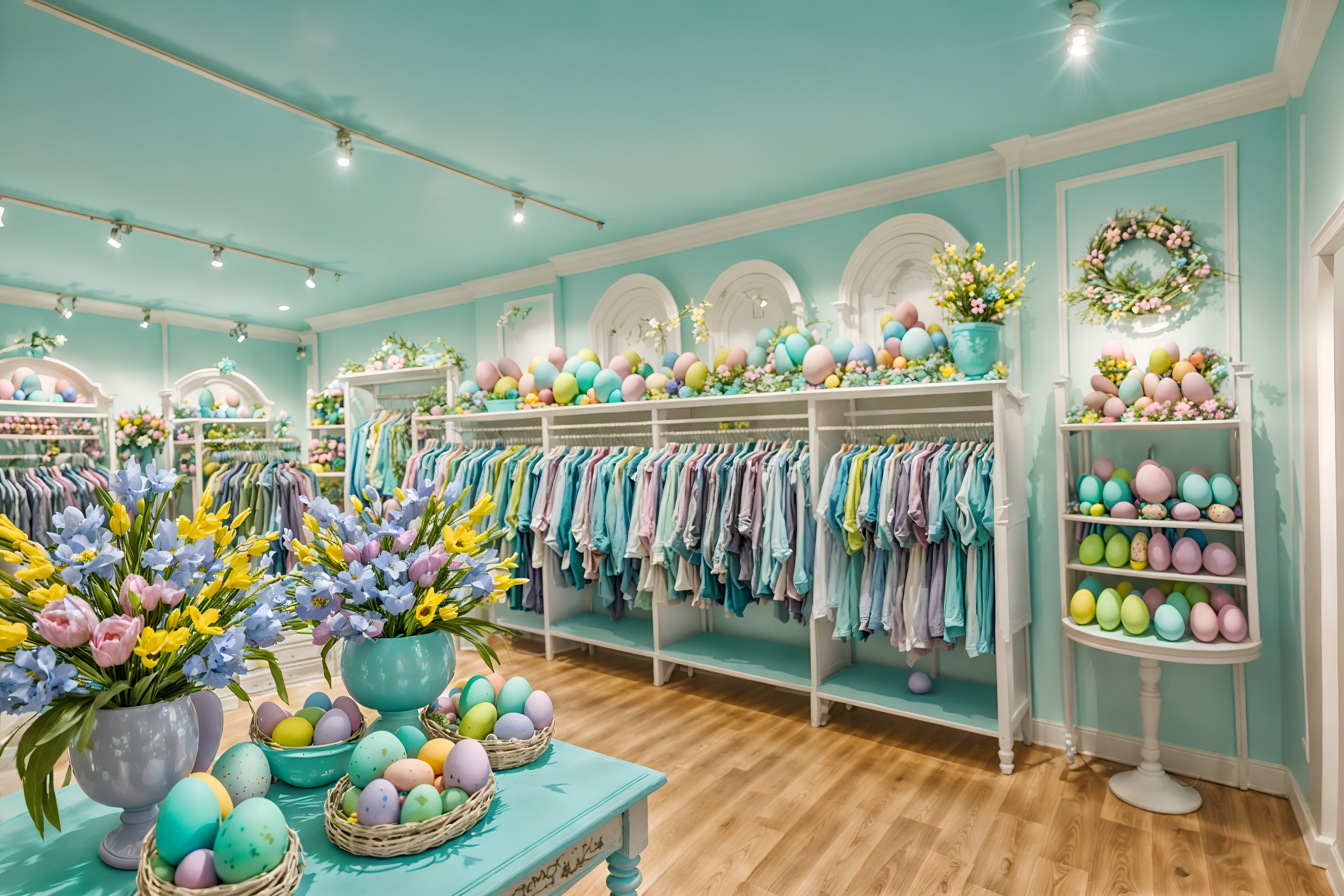 photo from pinterest of easter-style interior designed (clothing store interior) . with light blue colors and easter decorations and colorful easter eggs and spring decorations and flowers on table and light blue colors. . cinematic photo, highly detailed, cinematic lighting, ultra-detailed, ultrarealistic, photorealism, 8k. trending on pinterest. easter interior design style. masterpiece, cinematic light, ultrarealistic+, photorealistic+, 8k, raw photo, realistic, sharp focus on eyes, (symmetrical eyes), (intact eyes), hyperrealistic, highest quality, best quality, , highly detailed, masterpiece, best quality, extremely detailed 8k wallpaper, masterpiece, best quality, ultra-detailed, best shadow, detailed background, detailed face, detailed eyes, high contrast, best illumination, detailed face, dulux, caustic, dynamic angle, detailed glow. dramatic lighting. highly detailed, insanely detailed hair, symmetrical, intricate details, professionally retouched, 8k high definition. strong bokeh. award winning photo.