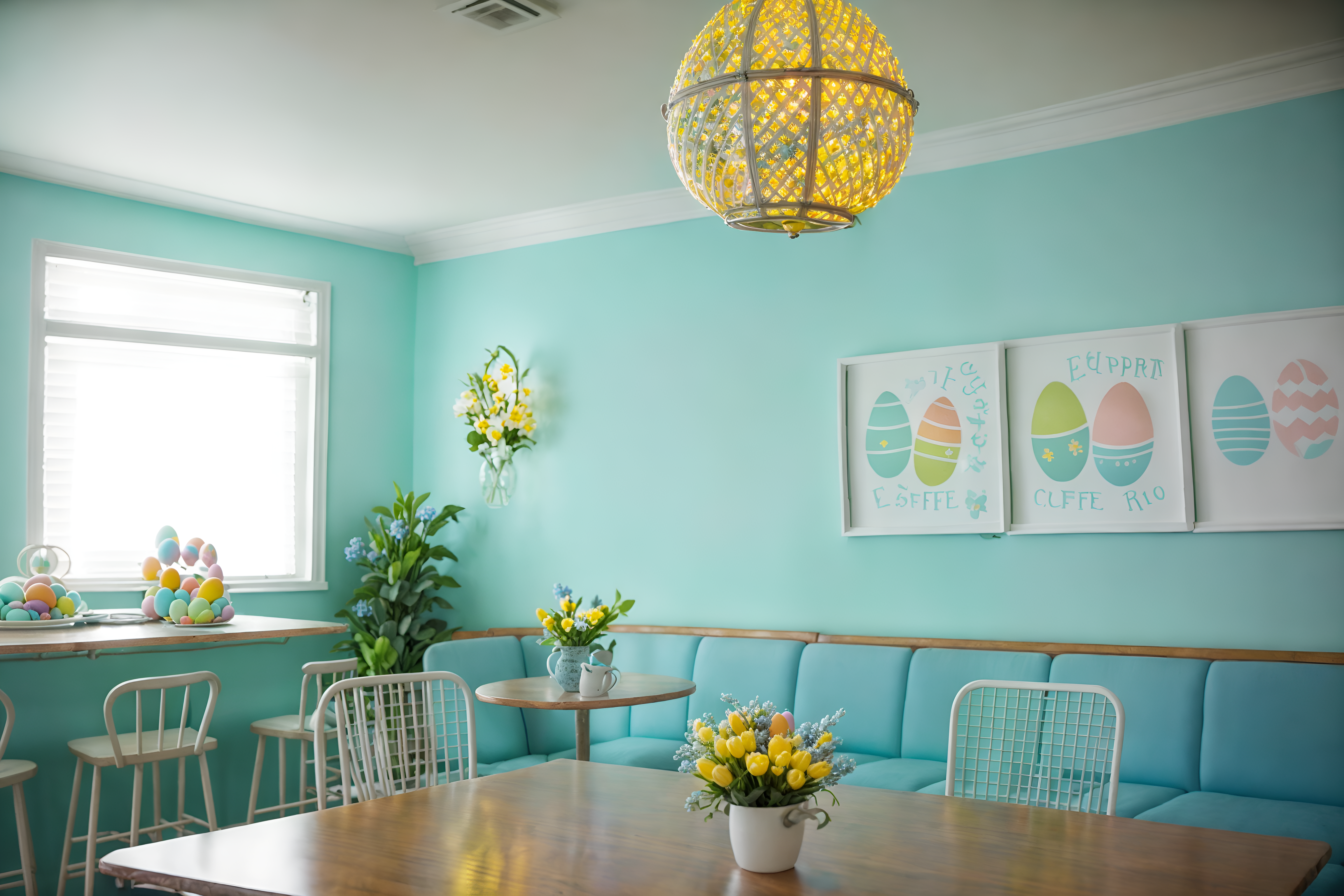 photo from pinterest of easter-style interior designed (coffee shop interior) . with light blue colors and colorful easter eggs and easter decorations and spring decorations and flowers on table and light blue colors. . cinematic photo, highly detailed, cinematic lighting, ultra-detailed, ultrarealistic, photorealism, 8k. trending on pinterest. easter interior design style. masterpiece, cinematic light, ultrarealistic+, photorealistic+, 8k, raw photo, realistic, sharp focus on eyes, (symmetrical eyes), (intact eyes), hyperrealistic, highest quality, best quality, , highly detailed, masterpiece, best quality, extremely detailed 8k wallpaper, masterpiece, best quality, ultra-detailed, best shadow, detailed background, detailed face, detailed eyes, high contrast, best illumination, detailed face, dulux, caustic, dynamic angle, detailed glow. dramatic lighting. highly detailed, insanely detailed hair, symmetrical, intricate details, professionally retouched, 8k high definition. strong bokeh. award winning photo.