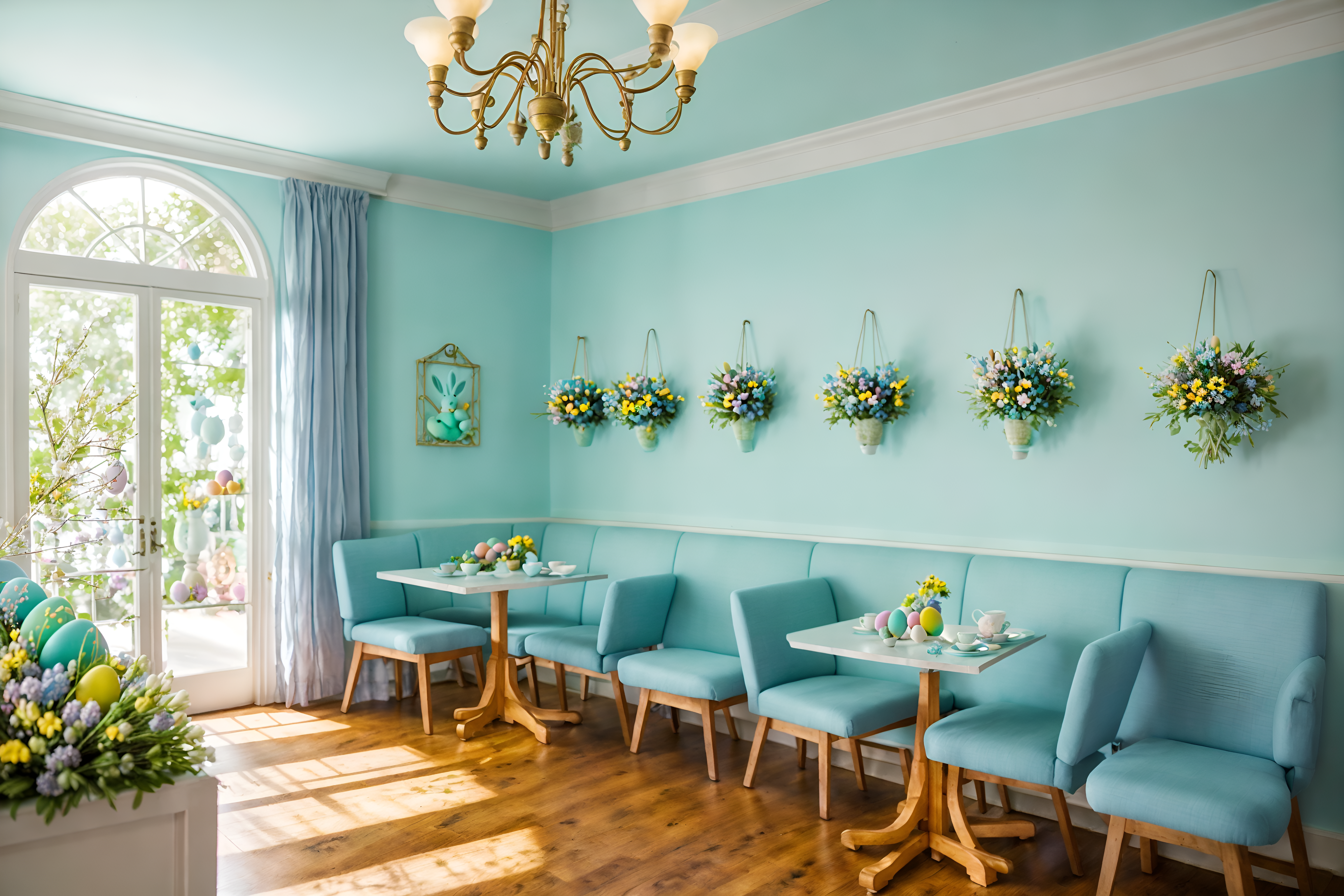 photo from pinterest of easter-style interior designed (coffee shop interior) . with light blue colors and spring decorations and easter decorations and flowers on table and colorful easter eggs and light blue colors. . cinematic photo, highly detailed, cinematic lighting, ultra-detailed, ultrarealistic, photorealism, 8k. trending on pinterest. easter interior design style. masterpiece, cinematic light, ultrarealistic+, photorealistic+, 8k, raw photo, realistic, sharp focus on eyes, (symmetrical eyes), (intact eyes), hyperrealistic, highest quality, best quality, , highly detailed, masterpiece, best quality, extremely detailed 8k wallpaper, masterpiece, best quality, ultra-detailed, best shadow, detailed background, detailed face, detailed eyes, high contrast, best illumination, detailed face, dulux, caustic, dynamic angle, detailed glow. dramatic lighting. highly detailed, insanely detailed hair, symmetrical, intricate details, professionally retouched, 8k high definition. strong bokeh. award winning photo.