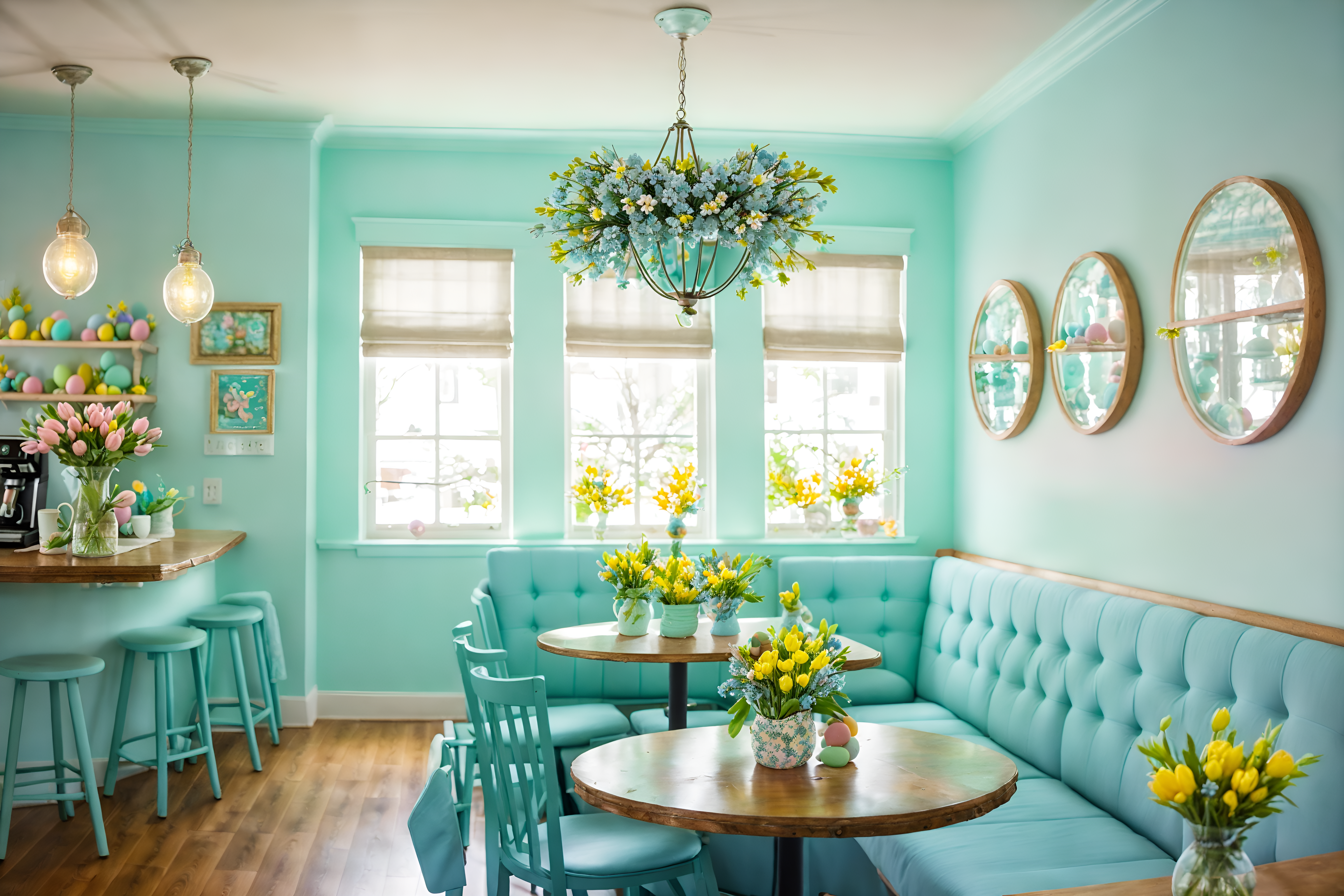 photo from pinterest of easter-style interior designed (coffee shop interior) . with light blue colors and spring decorations and easter decorations and flowers on table and colorful easter eggs and light blue colors. . cinematic photo, highly detailed, cinematic lighting, ultra-detailed, ultrarealistic, photorealism, 8k. trending on pinterest. easter interior design style. masterpiece, cinematic light, ultrarealistic+, photorealistic+, 8k, raw photo, realistic, sharp focus on eyes, (symmetrical eyes), (intact eyes), hyperrealistic, highest quality, best quality, , highly detailed, masterpiece, best quality, extremely detailed 8k wallpaper, masterpiece, best quality, ultra-detailed, best shadow, detailed background, detailed face, detailed eyes, high contrast, best illumination, detailed face, dulux, caustic, dynamic angle, detailed glow. dramatic lighting. highly detailed, insanely detailed hair, symmetrical, intricate details, professionally retouched, 8k high definition. strong bokeh. award winning photo.