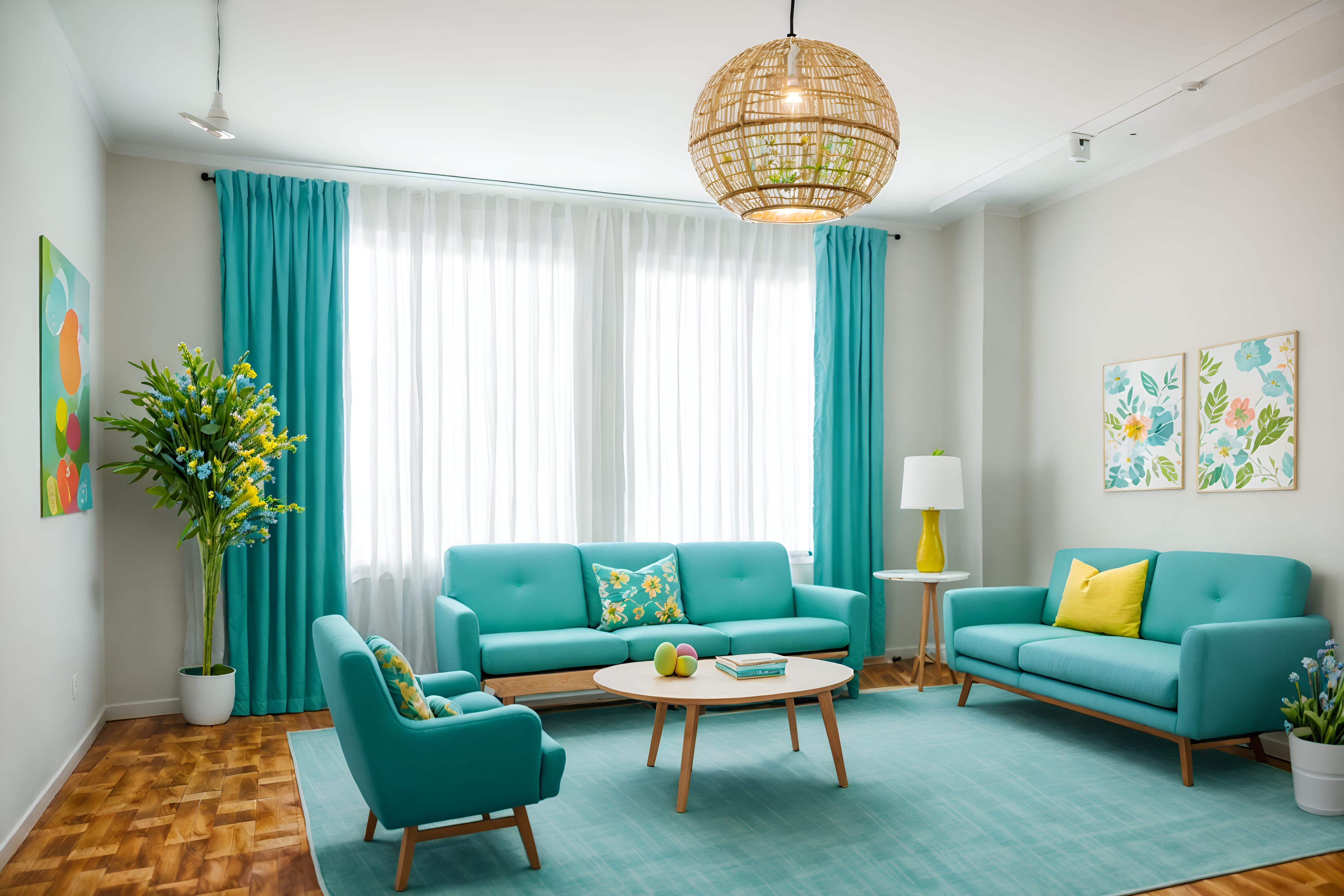 photo from pinterest of easter-style interior designed (coworking space interior) with seating area with sofa and office desks and lounge chairs and office chairs and seating area with sofa. . with light blue colors and flowers on table and spring decorations and easter decorations and colorful easter eggs and light blue colors. . cinematic photo, highly detailed, cinematic lighting, ultra-detailed, ultrarealistic, photorealism, 8k. trending on pinterest. easter interior design style. masterpiece, cinematic light, ultrarealistic+, photorealistic+, 8k, raw photo, realistic, sharp focus on eyes, (symmetrical eyes), (intact eyes), hyperrealistic, highest quality, best quality, , highly detailed, masterpiece, best quality, extremely detailed 8k wallpaper, masterpiece, best quality, ultra-detailed, best shadow, detailed background, detailed face, detailed eyes, high contrast, best illumination, detailed face, dulux, caustic, dynamic angle, detailed glow. dramatic lighting. highly detailed, insanely detailed hair, symmetrical, intricate details, professionally retouched, 8k high definition. strong bokeh. award winning photo.