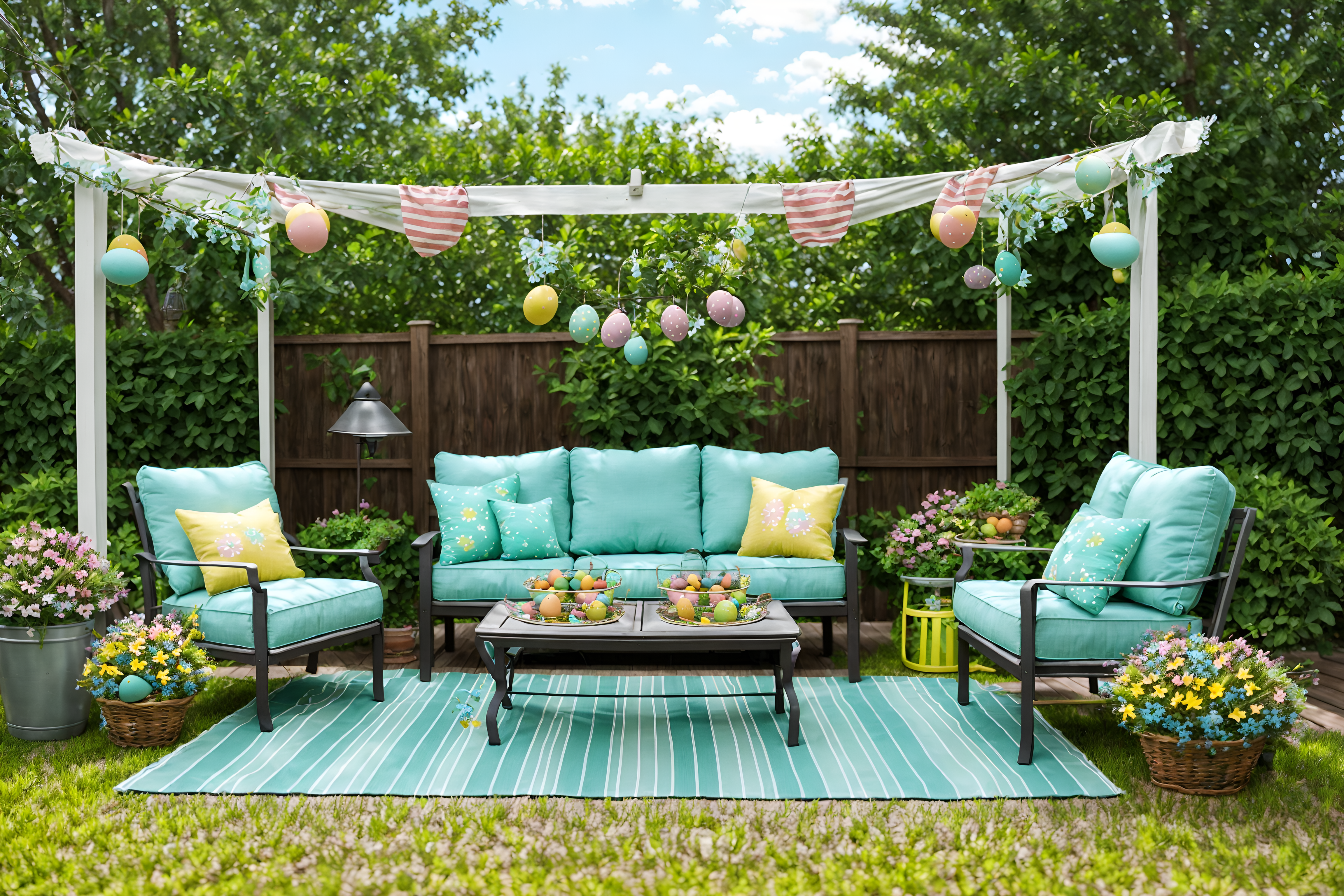 photo from pinterest of easter-style designed (outdoor patio ) with patio couch with pillows and deck with deck chairs and barbeque or grill and grass and plant and patio couch with pillows. . with easter decorations and flowers on table and spring decorations and light blue colors and colorful easter eggs and easter decorations. . cinematic photo, highly detailed, cinematic lighting, ultra-detailed, ultrarealistic, photorealism, 8k. trending on pinterest. easter design style. masterpiece, cinematic light, ultrarealistic+, photorealistic+, 8k, raw photo, realistic, sharp focus on eyes, (symmetrical eyes), (intact eyes), hyperrealistic, highest quality, best quality, , highly detailed, masterpiece, best quality, extremely detailed 8k wallpaper, masterpiece, best quality, ultra-detailed, best shadow, detailed background, detailed face, detailed eyes, high contrast, best illumination, detailed face, dulux, caustic, dynamic angle, detailed glow. dramatic lighting. highly detailed, insanely detailed hair, symmetrical, intricate details, professionally retouched, 8k high definition. strong bokeh. award winning photo.
