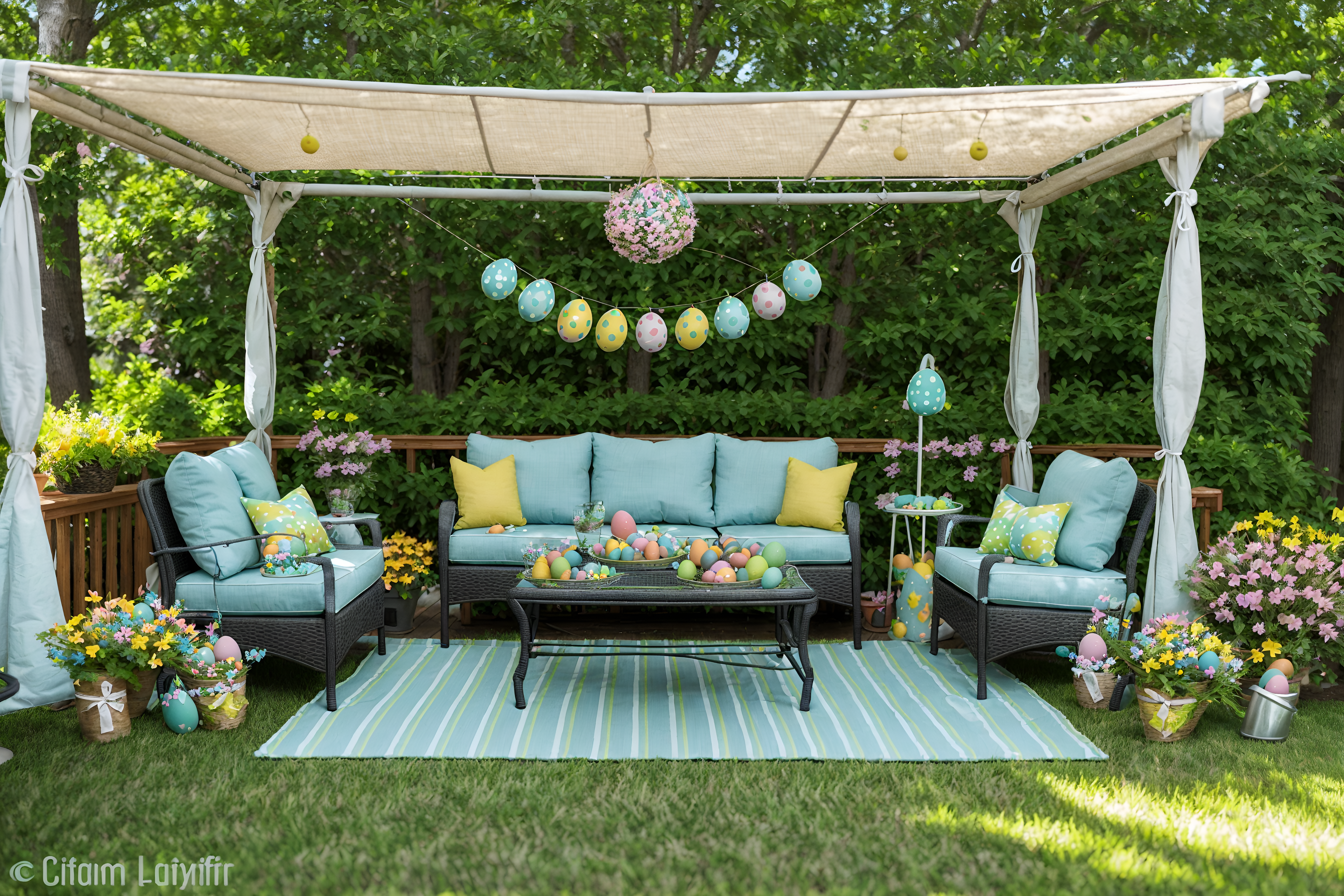 photo from pinterest of easter-style designed (outdoor patio ) with patio couch with pillows and deck with deck chairs and barbeque or grill and grass and plant and patio couch with pillows. . with easter decorations and flowers on table and spring decorations and light blue colors and colorful easter eggs and easter decorations. . cinematic photo, highly detailed, cinematic lighting, ultra-detailed, ultrarealistic, photorealism, 8k. trending on pinterest. easter design style. masterpiece, cinematic light, ultrarealistic+, photorealistic+, 8k, raw photo, realistic, sharp focus on eyes, (symmetrical eyes), (intact eyes), hyperrealistic, highest quality, best quality, , highly detailed, masterpiece, best quality, extremely detailed 8k wallpaper, masterpiece, best quality, ultra-detailed, best shadow, detailed background, detailed face, detailed eyes, high contrast, best illumination, detailed face, dulux, caustic, dynamic angle, detailed glow. dramatic lighting. highly detailed, insanely detailed hair, symmetrical, intricate details, professionally retouched, 8k high definition. strong bokeh. award winning photo.