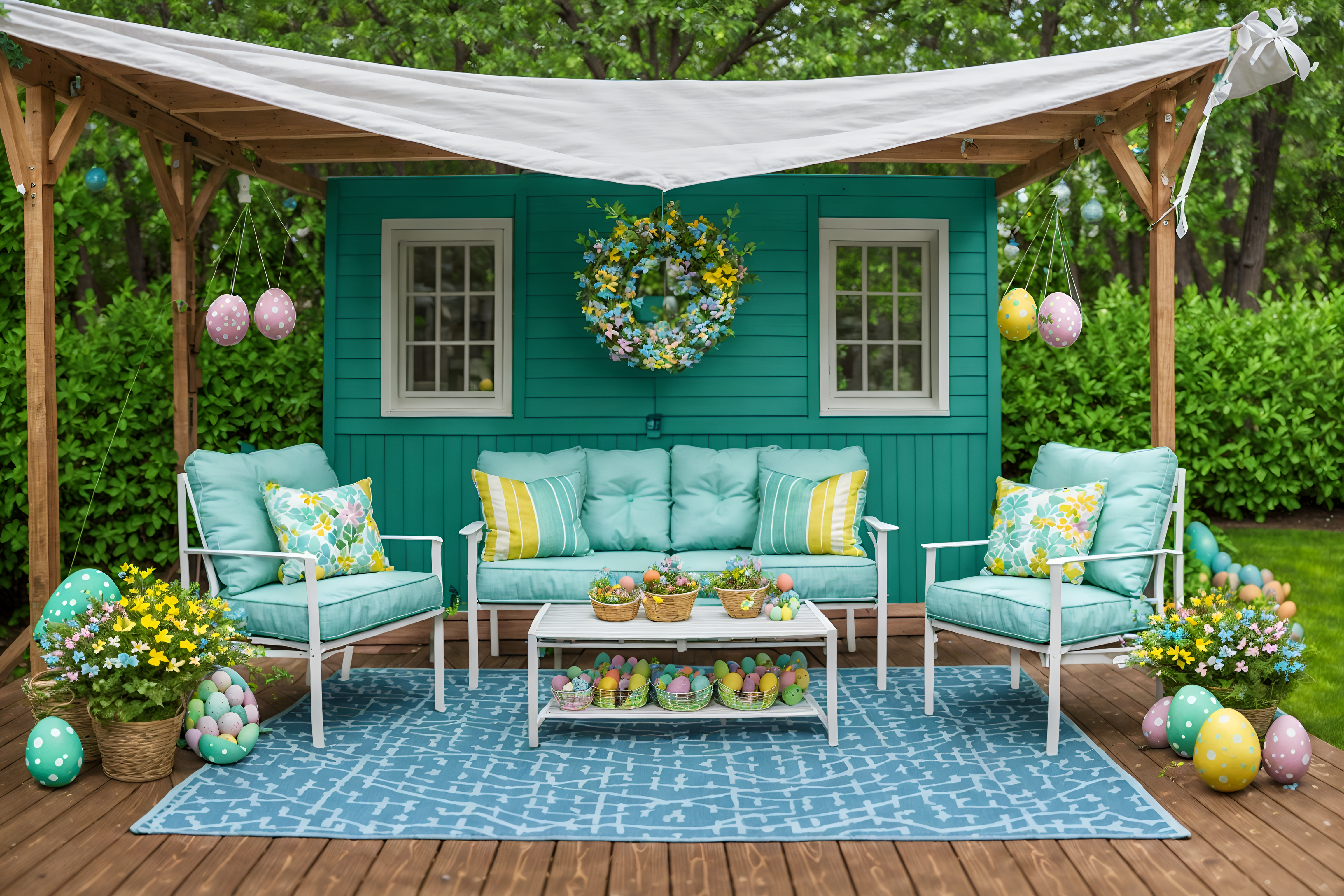 easter outdoor patiosinterior decorate this outdoor patio with easter style. . . with barbeque or grill and deck with deck chairs and grass and patio couch with pillows and plant and barbeque or grill. . with light blue colors and flowers on table and spring decorations and easter decorations and colorful easter eggs and light blue colors. . .