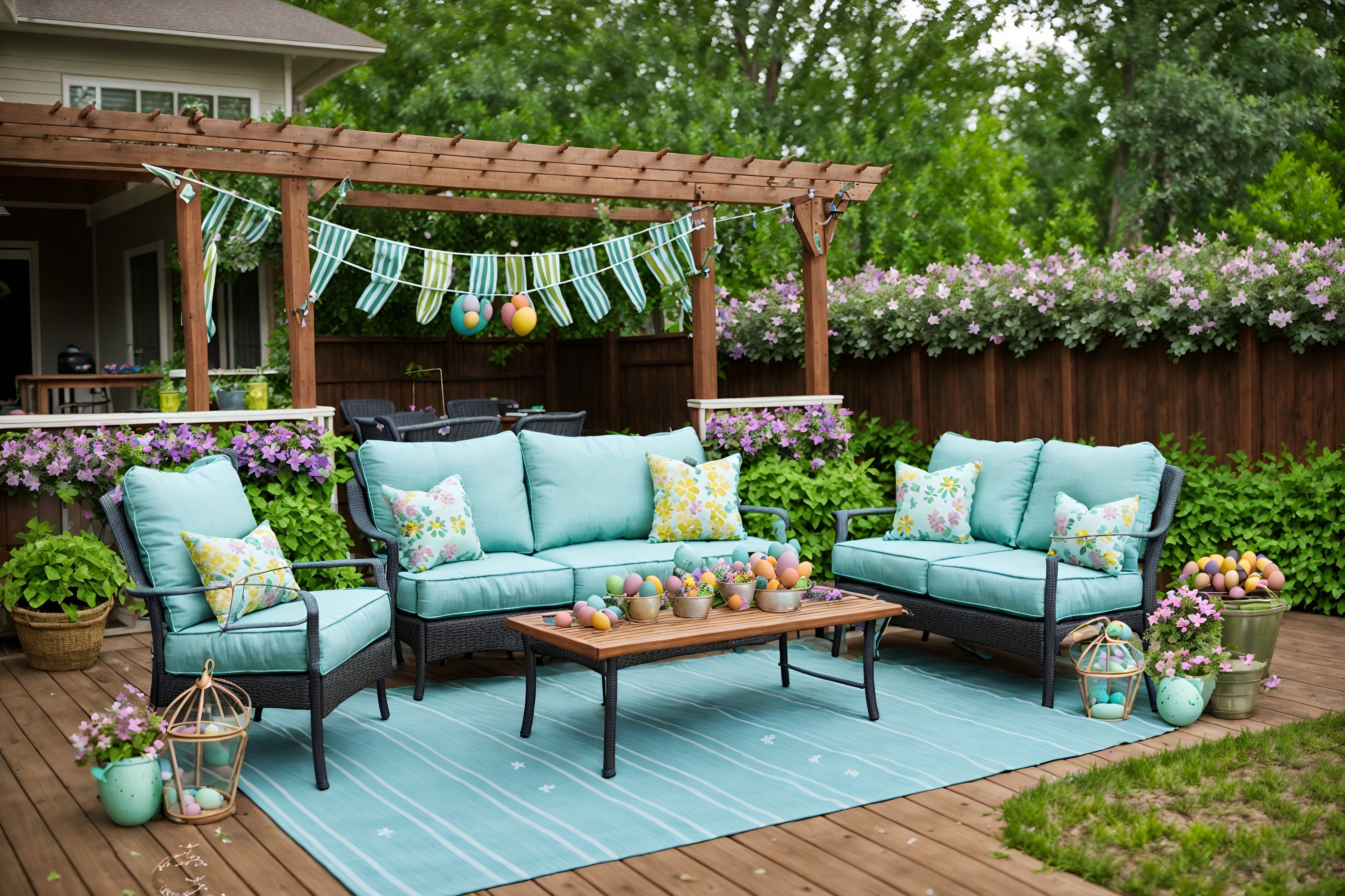 photo from pinterest of easter-style designed (outdoor patio ) with patio couch with pillows and deck with deck chairs and barbeque or grill and grass and plant and patio couch with pillows. . with easter decorations and flowers on table and spring decorations and light blue colors and colorful easter eggs and easter decorations. . cinematic photo, highly detailed, cinematic lighting, ultra-detailed, ultrarealistic, photorealism, 8k. trending on pinterest. easter design style. masterpiece, cinematic light, ultrarealistic+, photorealistic+, 8k, raw photo, realistic, sharp focus on eyes, (symmetrical eyes), (intact eyes), hyperrealistic, highest quality, best quality, , highly detailed, masterpiece, best quality, extremely detailed 8k wallpaper, masterpiece, best quality, ultra-detailed, best shadow, detailed background, detailed face, detailed eyes, high contrast, best illumination, detailed face, dulux, caustic, dynamic angle, detailed glow. dramatic lighting. highly detailed, insanely detailed hair, symmetrical, intricate details, professionally retouched, 8k high definition. strong bokeh. award winning photo.
