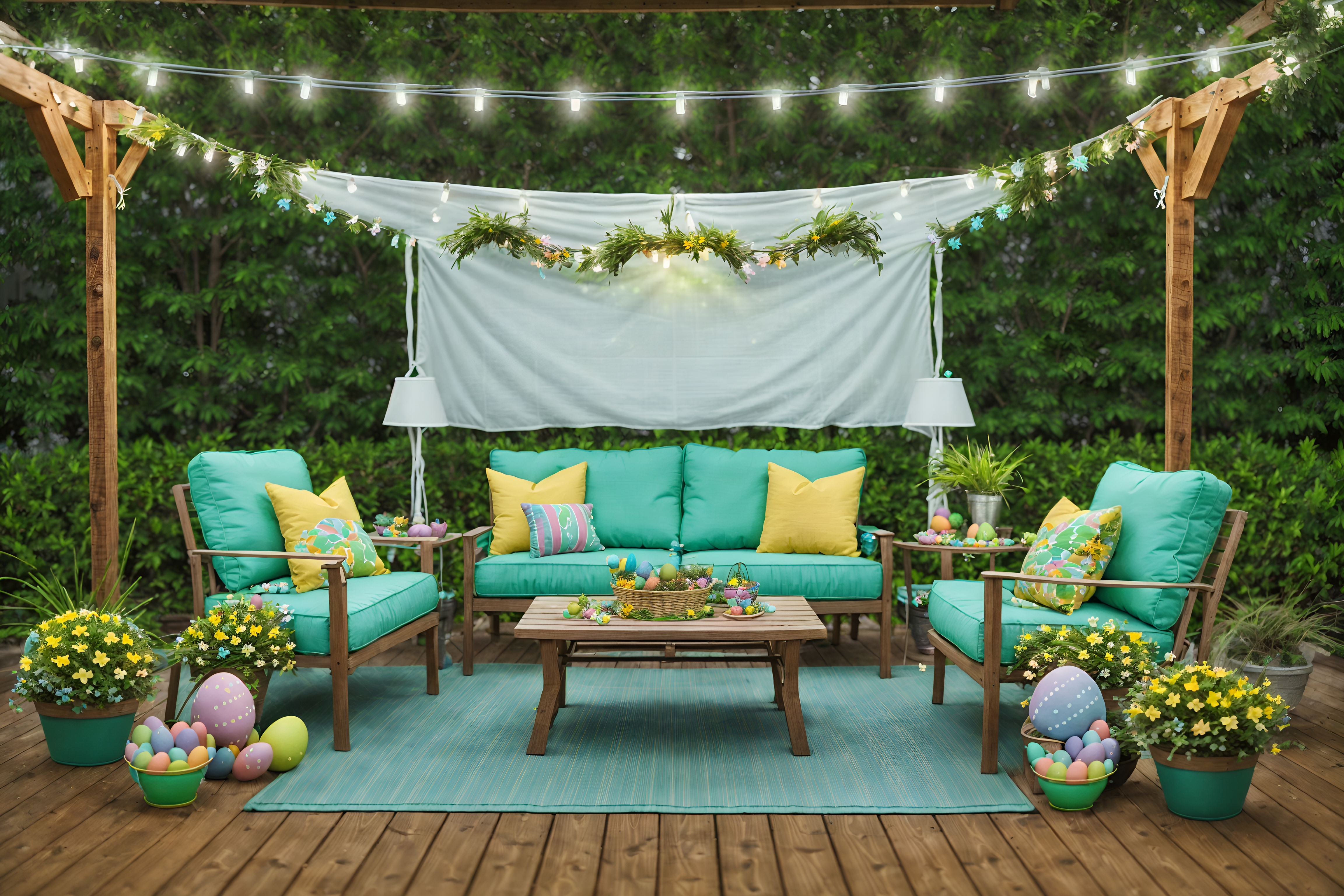 photo from pinterest of easter-style designed (outdoor patio ) with plant and grass and patio couch with pillows and deck with deck chairs and barbeque or grill and plant. . with colorful easter eggs and flowers on table and easter decorations and light blue colors and spring decorations and colorful easter eggs. . cinematic photo, highly detailed, cinematic lighting, ultra-detailed, ultrarealistic, photorealism, 8k. trending on pinterest. easter design style. masterpiece, cinematic light, ultrarealistic+, photorealistic+, 8k, raw photo, realistic, sharp focus on eyes, (symmetrical eyes), (intact eyes), hyperrealistic, highest quality, best quality, , highly detailed, masterpiece, best quality, extremely detailed 8k wallpaper, masterpiece, best quality, ultra-detailed, best shadow, detailed background, detailed face, detailed eyes, high contrast, best illumination, detailed face, dulux, caustic, dynamic angle, detailed glow. dramatic lighting. highly detailed, insanely detailed hair, symmetrical, intricate details, professionally retouched, 8k high definition. strong bokeh. award winning photo.