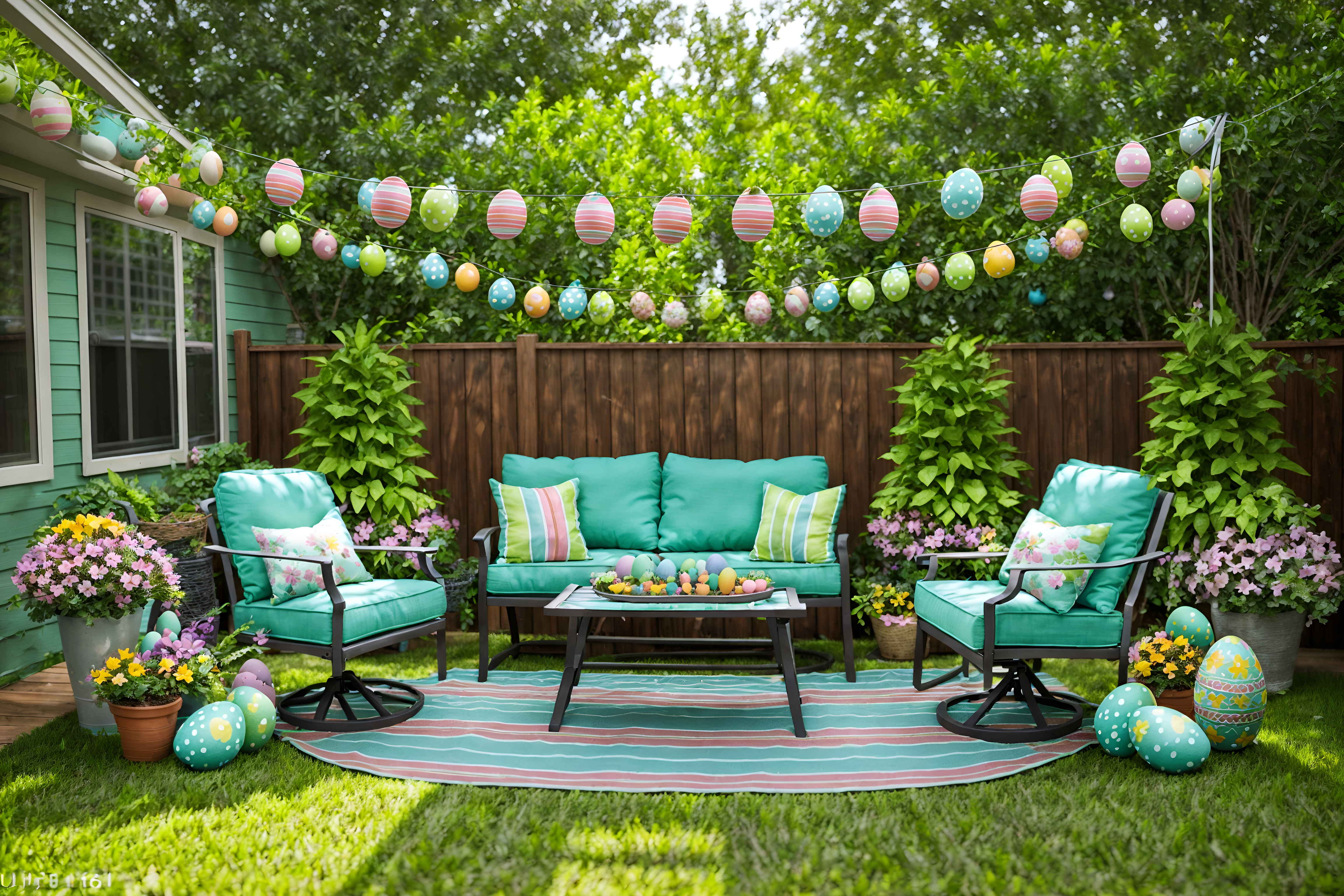 photo from pinterest of easter-style designed (outdoor patio ) with plant and grass and patio couch with pillows and deck with deck chairs and barbeque or grill and plant. . with colorful easter eggs and flowers on table and easter decorations and light blue colors and spring decorations and colorful easter eggs. . cinematic photo, highly detailed, cinematic lighting, ultra-detailed, ultrarealistic, photorealism, 8k. trending on pinterest. easter design style. masterpiece, cinematic light, ultrarealistic+, photorealistic+, 8k, raw photo, realistic, sharp focus on eyes, (symmetrical eyes), (intact eyes), hyperrealistic, highest quality, best quality, , highly detailed, masterpiece, best quality, extremely detailed 8k wallpaper, masterpiece, best quality, ultra-detailed, best shadow, detailed background, detailed face, detailed eyes, high contrast, best illumination, detailed face, dulux, caustic, dynamic angle, detailed glow. dramatic lighting. highly detailed, insanely detailed hair, symmetrical, intricate details, professionally retouched, 8k high definition. strong bokeh. award winning photo.