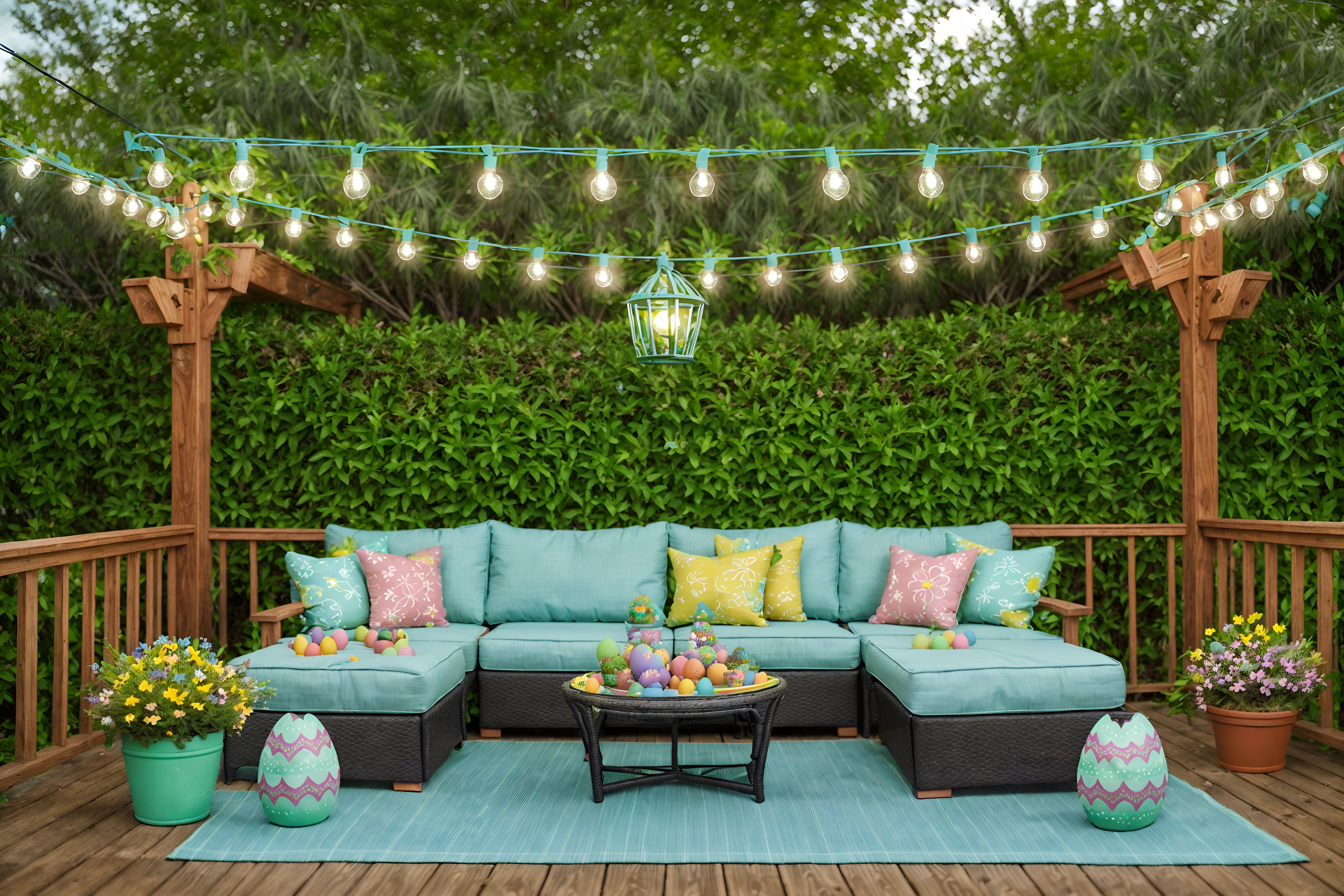 photo from pinterest of easter-style designed (outdoor patio ) with plant and grass and patio couch with pillows and deck with deck chairs and barbeque or grill and plant. . with colorful easter eggs and flowers on table and easter decorations and light blue colors and spring decorations and colorful easter eggs. . cinematic photo, highly detailed, cinematic lighting, ultra-detailed, ultrarealistic, photorealism, 8k. trending on pinterest. easter design style. masterpiece, cinematic light, ultrarealistic+, photorealistic+, 8k, raw photo, realistic, sharp focus on eyes, (symmetrical eyes), (intact eyes), hyperrealistic, highest quality, best quality, , highly detailed, masterpiece, best quality, extremely detailed 8k wallpaper, masterpiece, best quality, ultra-detailed, best shadow, detailed background, detailed face, detailed eyes, high contrast, best illumination, detailed face, dulux, caustic, dynamic angle, detailed glow. dramatic lighting. highly detailed, insanely detailed hair, symmetrical, intricate details, professionally retouched, 8k high definition. strong bokeh. award winning photo.