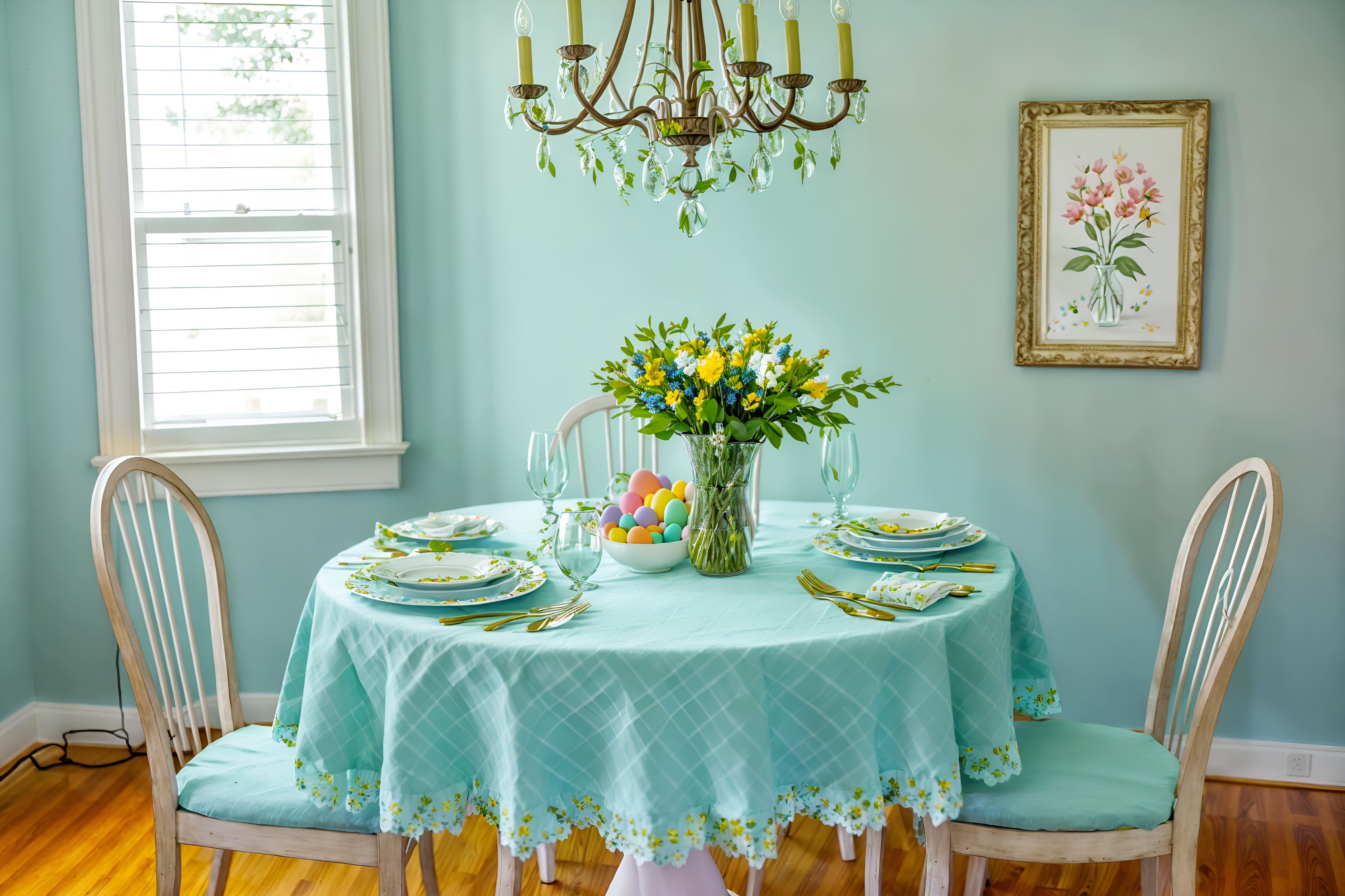 photo from pinterest of easter-style interior designed (dining room interior) with table cloth and painting or photo on wall and dining table and dining table chairs and light or chandelier and vase and plant and plates, cutlery and glasses on dining table. . with flowers on table and colorful easter eggs and light blue colors and spring decorations and easter decorations and flowers on table. . cinematic photo, highly detailed, cinematic lighting, ultra-detailed, ultrarealistic, photorealism, 8k. trending on pinterest. easter interior design style. masterpiece, cinematic light, ultrarealistic+, photorealistic+, 8k, raw photo, realistic, sharp focus on eyes, (symmetrical eyes), (intact eyes), hyperrealistic, highest quality, best quality, , highly detailed, masterpiece, best quality, extremely detailed 8k wallpaper, masterpiece, best quality, ultra-detailed, best shadow, detailed background, detailed face, detailed eyes, high contrast, best illumination, detailed face, dulux, caustic, dynamic angle, detailed glow. dramatic lighting. highly detailed, insanely detailed hair, symmetrical, intricate details, professionally retouched, 8k high definition. strong bokeh. award winning photo.