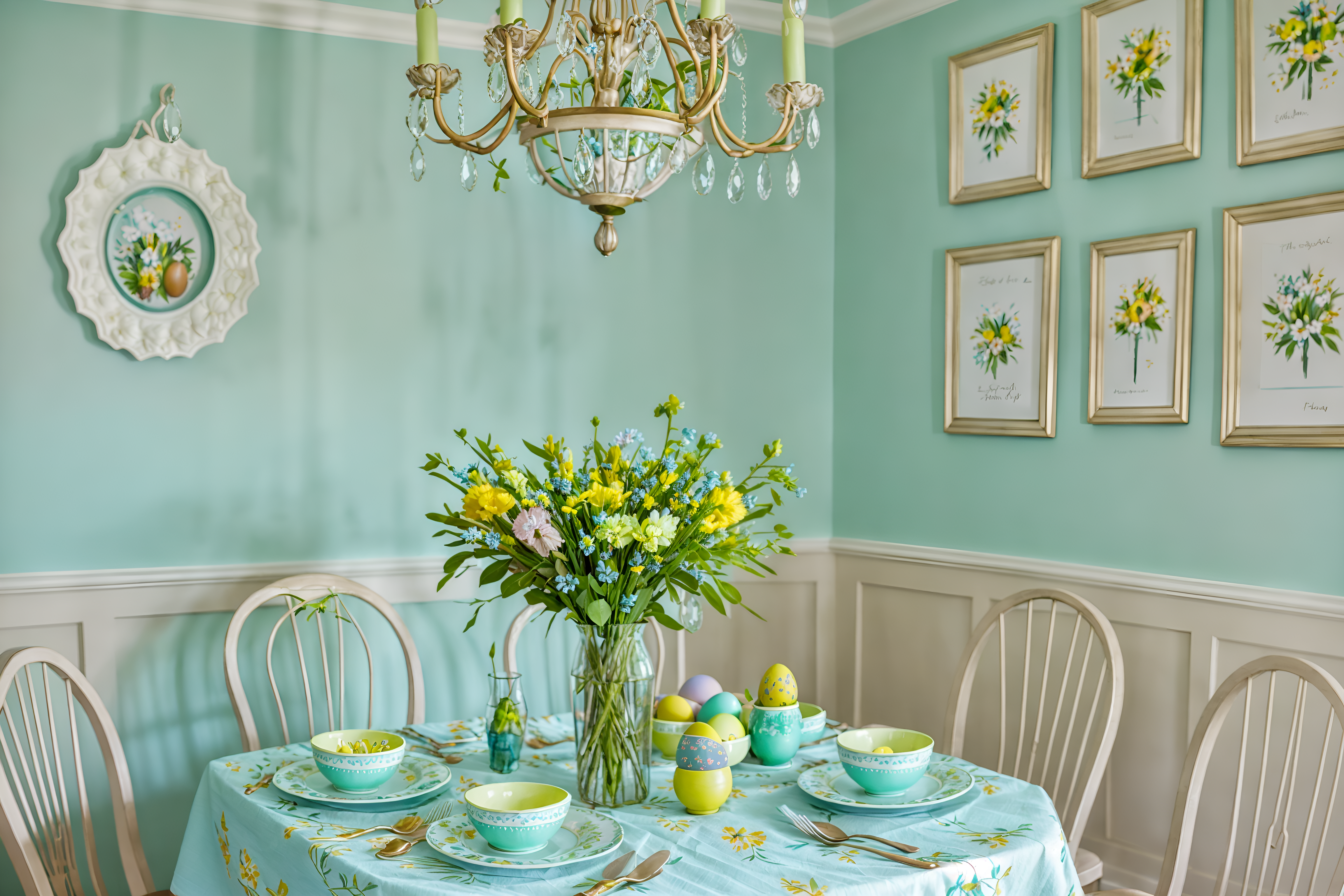 photo from pinterest of easter-style interior designed (dining room interior) with table cloth and painting or photo on wall and dining table and dining table chairs and light or chandelier and vase and plant and plates, cutlery and glasses on dining table. . with flowers on table and colorful easter eggs and light blue colors and spring decorations and easter decorations and flowers on table. . cinematic photo, highly detailed, cinematic lighting, ultra-detailed, ultrarealistic, photorealism, 8k. trending on pinterest. easter interior design style. masterpiece, cinematic light, ultrarealistic+, photorealistic+, 8k, raw photo, realistic, sharp focus on eyes, (symmetrical eyes), (intact eyes), hyperrealistic, highest quality, best quality, , highly detailed, masterpiece, best quality, extremely detailed 8k wallpaper, masterpiece, best quality, ultra-detailed, best shadow, detailed background, detailed face, detailed eyes, high contrast, best illumination, detailed face, dulux, caustic, dynamic angle, detailed glow. dramatic lighting. highly detailed, insanely detailed hair, symmetrical, intricate details, professionally retouched, 8k high definition. strong bokeh. award winning photo.