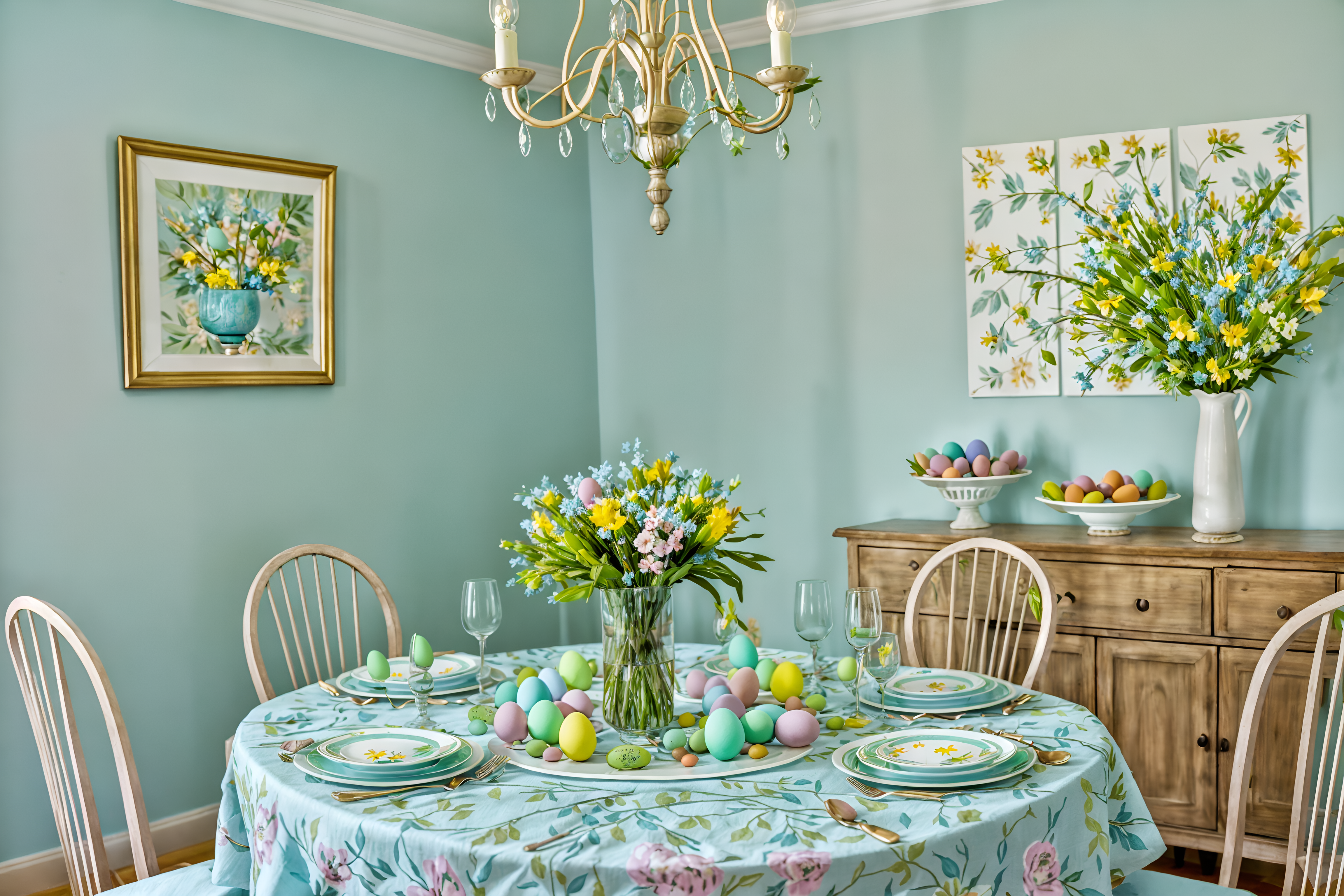 photo from pinterest of easter-style interior designed (dining room interior) with table cloth and painting or photo on wall and dining table and dining table chairs and light or chandelier and vase and plant and plates, cutlery and glasses on dining table. . with flowers on table and colorful easter eggs and light blue colors and spring decorations and easter decorations and flowers on table. . cinematic photo, highly detailed, cinematic lighting, ultra-detailed, ultrarealistic, photorealism, 8k. trending on pinterest. easter interior design style. masterpiece, cinematic light, ultrarealistic+, photorealistic+, 8k, raw photo, realistic, sharp focus on eyes, (symmetrical eyes), (intact eyes), hyperrealistic, highest quality, best quality, , highly detailed, masterpiece, best quality, extremely detailed 8k wallpaper, masterpiece, best quality, ultra-detailed, best shadow, detailed background, detailed face, detailed eyes, high contrast, best illumination, detailed face, dulux, caustic, dynamic angle, detailed glow. dramatic lighting. highly detailed, insanely detailed hair, symmetrical, intricate details, professionally retouched, 8k high definition. strong bokeh. award winning photo.