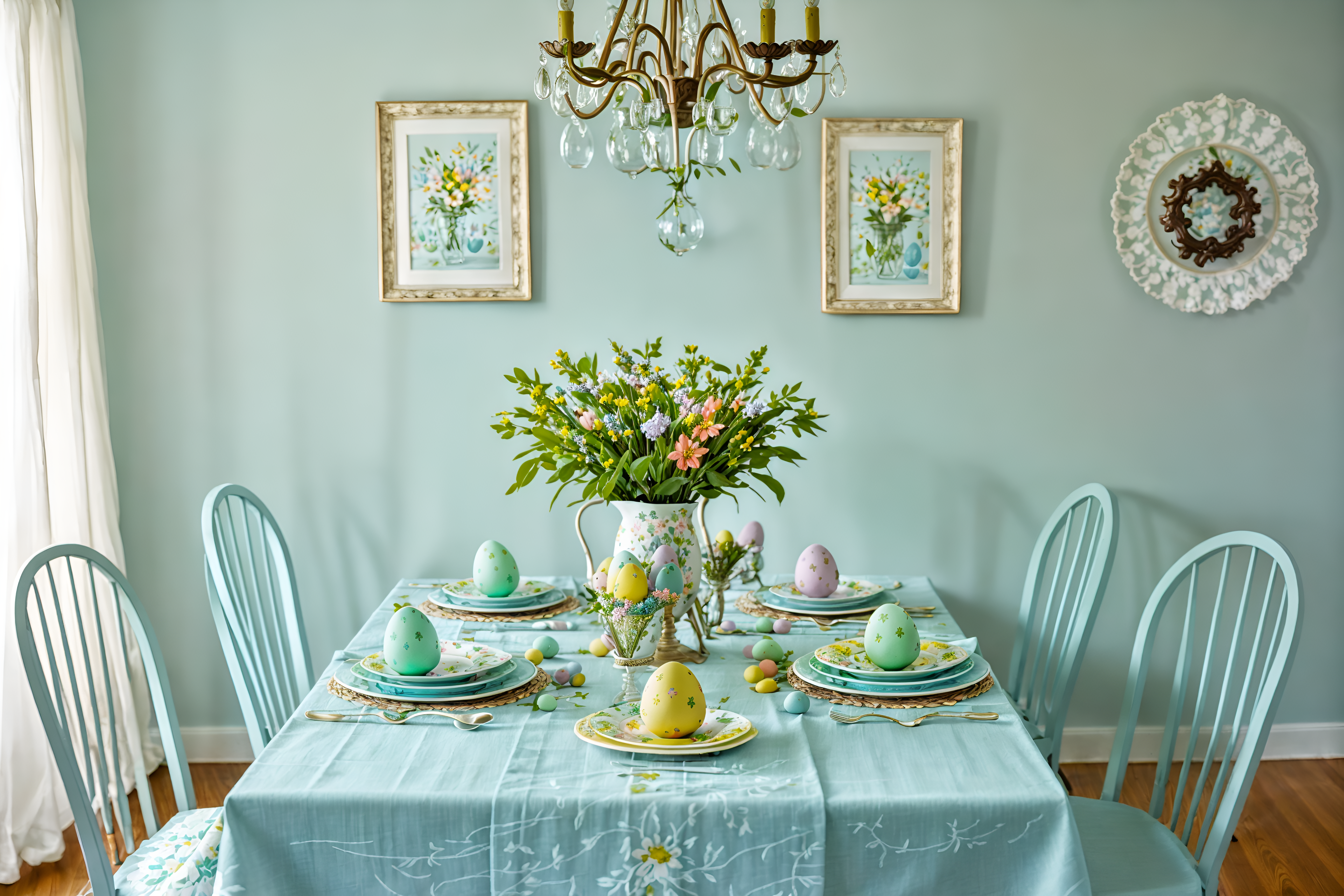 photo from pinterest of easter-style interior designed (dining room interior) with table cloth and painting or photo on wall and dining table and dining table chairs and light or chandelier and vase and plant and plates, cutlery and glasses on dining table. . with flowers on table and colorful easter eggs and light blue colors and spring decorations and easter decorations and flowers on table. . cinematic photo, highly detailed, cinematic lighting, ultra-detailed, ultrarealistic, photorealism, 8k. trending on pinterest. easter interior design style. masterpiece, cinematic light, ultrarealistic+, photorealistic+, 8k, raw photo, realistic, sharp focus on eyes, (symmetrical eyes), (intact eyes), hyperrealistic, highest quality, best quality, , highly detailed, masterpiece, best quality, extremely detailed 8k wallpaper, masterpiece, best quality, ultra-detailed, best shadow, detailed background, detailed face, detailed eyes, high contrast, best illumination, detailed face, dulux, caustic, dynamic angle, detailed glow. dramatic lighting. highly detailed, insanely detailed hair, symmetrical, intricate details, professionally retouched, 8k high definition. strong bokeh. award winning photo.