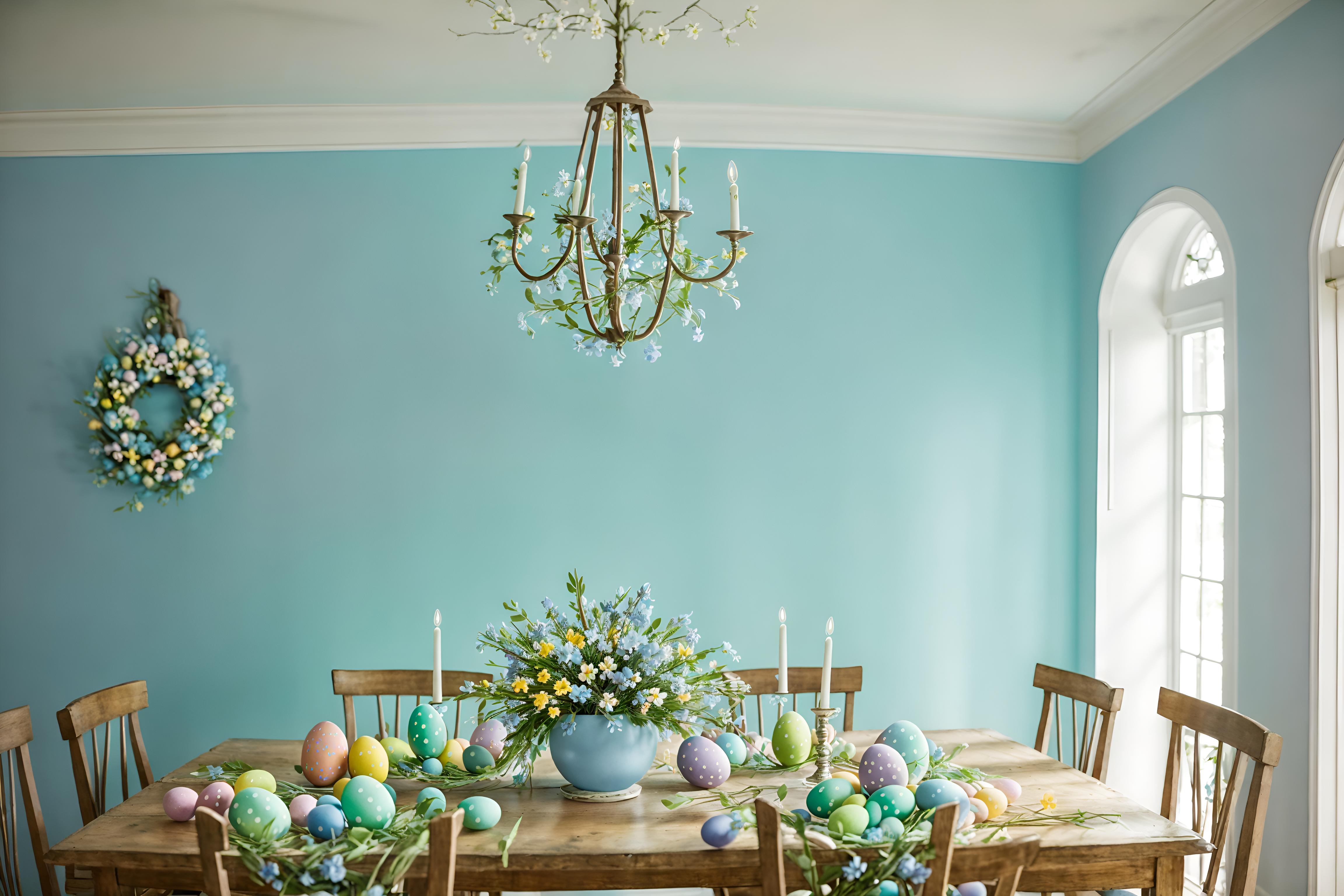 photo from pinterest of easter-style interior designed (exhibition space interior) . with easter decorations and light blue colors and flowers on table and spring decorations and colorful easter eggs and easter decorations. . cinematic photo, highly detailed, cinematic lighting, ultra-detailed, ultrarealistic, photorealism, 8k. trending on pinterest. easter interior design style. masterpiece, cinematic light, ultrarealistic+, photorealistic+, 8k, raw photo, realistic, sharp focus on eyes, (symmetrical eyes), (intact eyes), hyperrealistic, highest quality, best quality, , highly detailed, masterpiece, best quality, extremely detailed 8k wallpaper, masterpiece, best quality, ultra-detailed, best shadow, detailed background, detailed face, detailed eyes, high contrast, best illumination, detailed face, dulux, caustic, dynamic angle, detailed glow. dramatic lighting. highly detailed, insanely detailed hair, symmetrical, intricate details, professionally retouched, 8k high definition. strong bokeh. award winning photo.