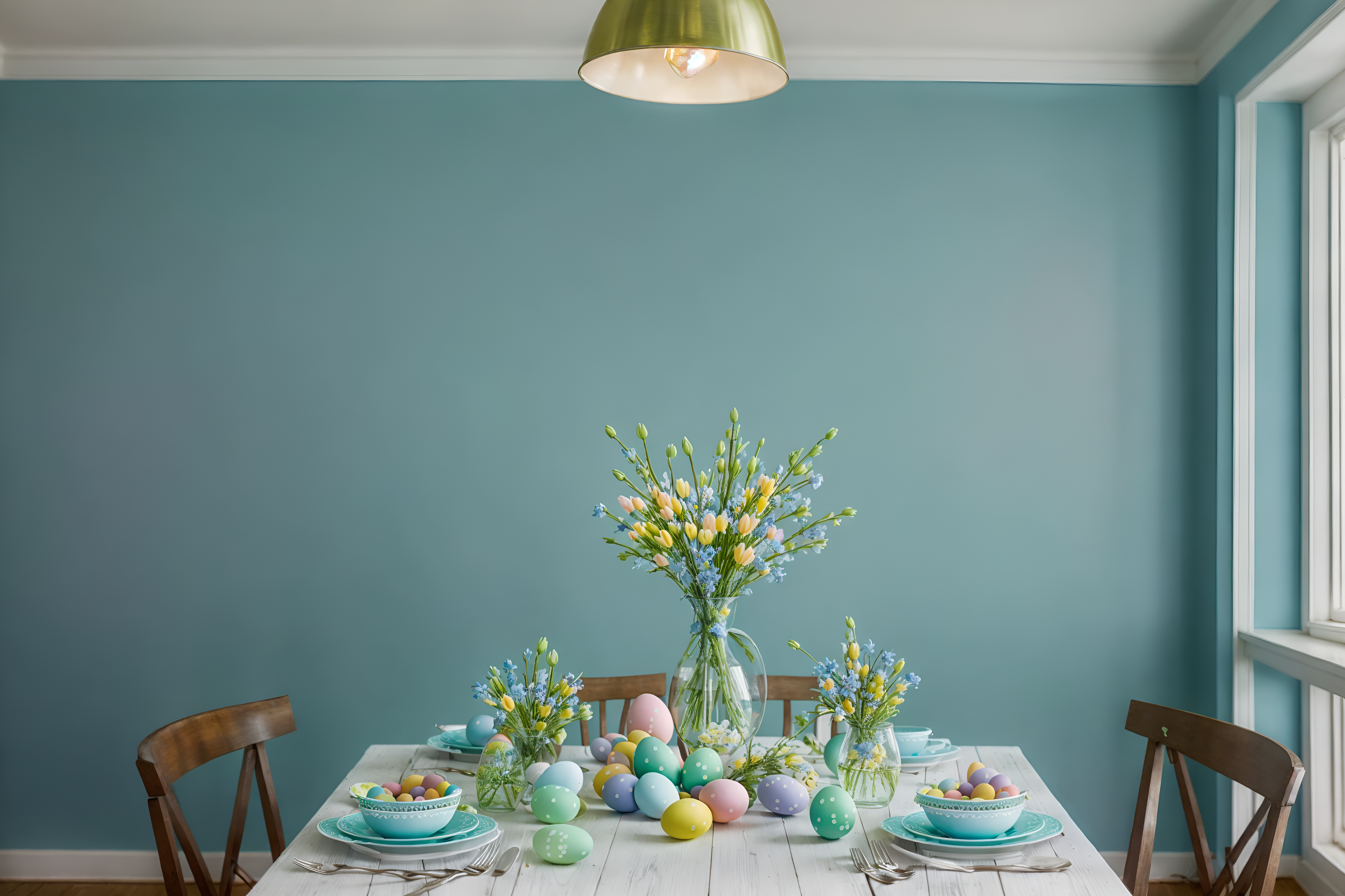 photo from pinterest of easter-style interior designed (exhibition space interior) . with easter decorations and light blue colors and flowers on table and spring decorations and colorful easter eggs and easter decorations. . cinematic photo, highly detailed, cinematic lighting, ultra-detailed, ultrarealistic, photorealism, 8k. trending on pinterest. easter interior design style. masterpiece, cinematic light, ultrarealistic+, photorealistic+, 8k, raw photo, realistic, sharp focus on eyes, (symmetrical eyes), (intact eyes), hyperrealistic, highest quality, best quality, , highly detailed, masterpiece, best quality, extremely detailed 8k wallpaper, masterpiece, best quality, ultra-detailed, best shadow, detailed background, detailed face, detailed eyes, high contrast, best illumination, detailed face, dulux, caustic, dynamic angle, detailed glow. dramatic lighting. highly detailed, insanely detailed hair, symmetrical, intricate details, professionally retouched, 8k high definition. strong bokeh. award winning photo.