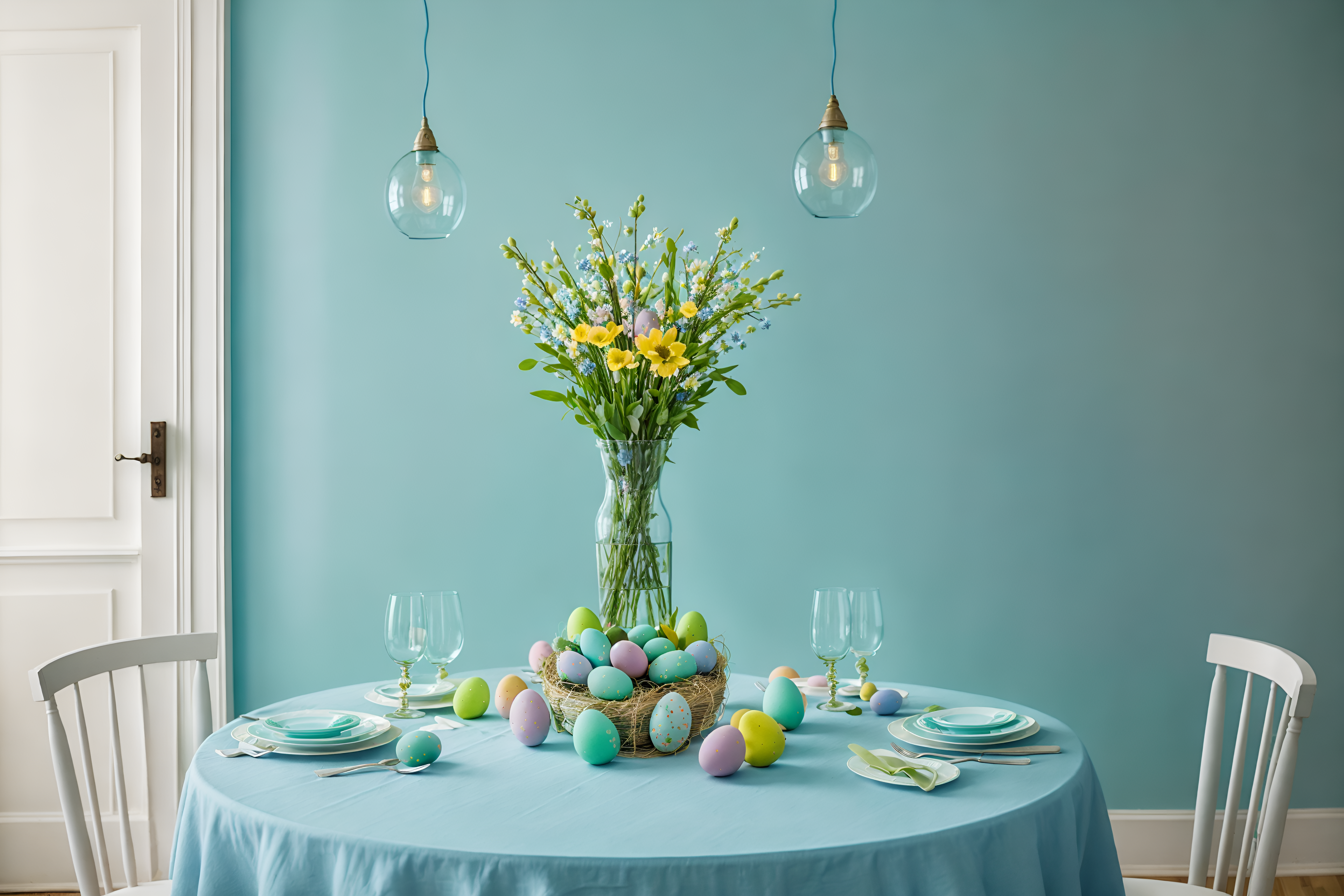 photo from pinterest of easter-style interior designed (exhibition space interior) . with easter decorations and light blue colors and flowers on table and spring decorations and colorful easter eggs and easter decorations. . cinematic photo, highly detailed, cinematic lighting, ultra-detailed, ultrarealistic, photorealism, 8k. trending on pinterest. easter interior design style. masterpiece, cinematic light, ultrarealistic+, photorealistic+, 8k, raw photo, realistic, sharp focus on eyes, (symmetrical eyes), (intact eyes), hyperrealistic, highest quality, best quality, , highly detailed, masterpiece, best quality, extremely detailed 8k wallpaper, masterpiece, best quality, ultra-detailed, best shadow, detailed background, detailed face, detailed eyes, high contrast, best illumination, detailed face, dulux, caustic, dynamic angle, detailed glow. dramatic lighting. highly detailed, insanely detailed hair, symmetrical, intricate details, professionally retouched, 8k high definition. strong bokeh. award winning photo.