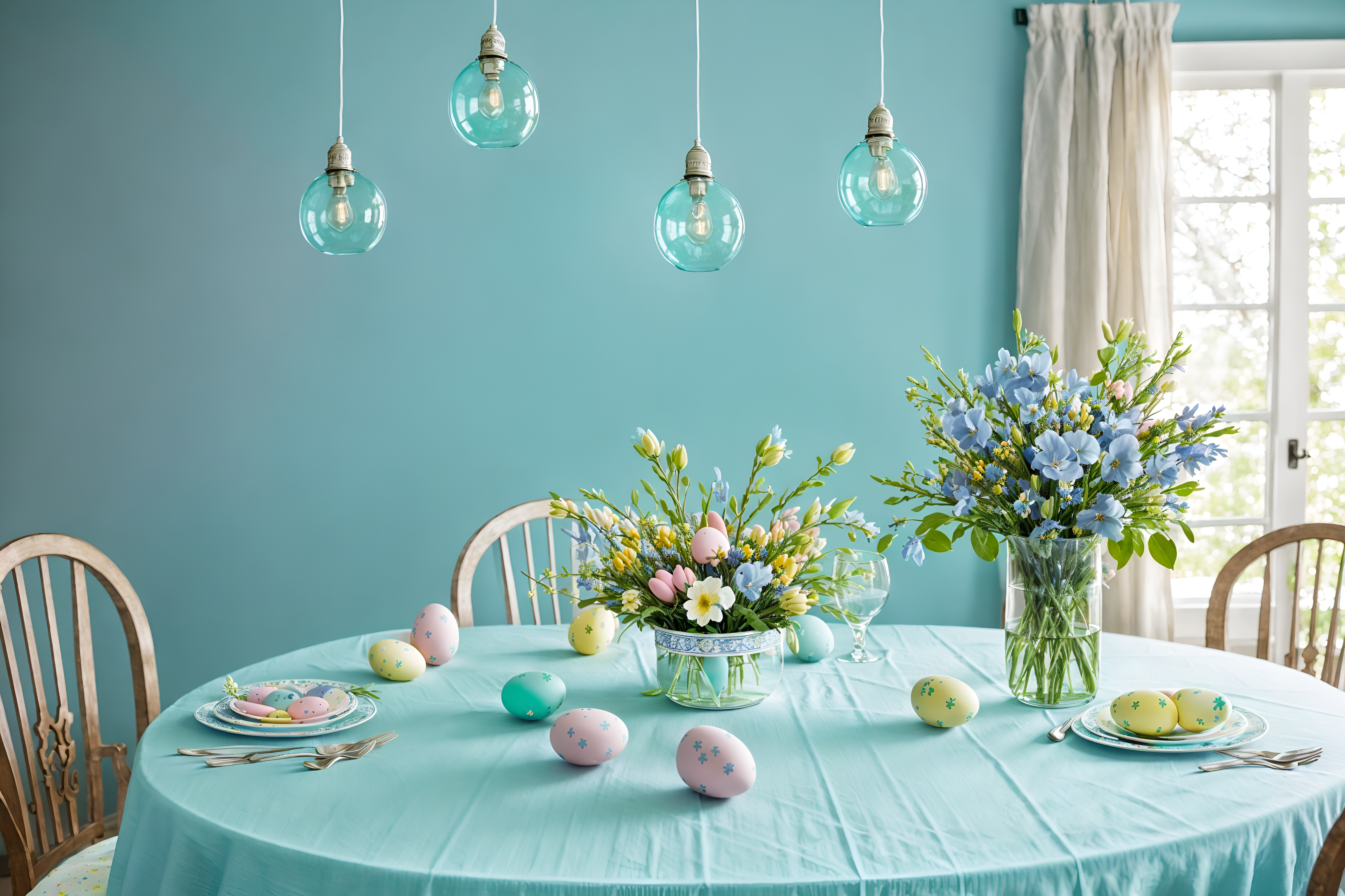 photo from pinterest of easter-style interior designed (exhibition space interior) . with easter decorations and light blue colors and flowers on table and spring decorations and colorful easter eggs and easter decorations. . cinematic photo, highly detailed, cinematic lighting, ultra-detailed, ultrarealistic, photorealism, 8k. trending on pinterest. easter interior design style. masterpiece, cinematic light, ultrarealistic+, photorealistic+, 8k, raw photo, realistic, sharp focus on eyes, (symmetrical eyes), (intact eyes), hyperrealistic, highest quality, best quality, , highly detailed, masterpiece, best quality, extremely detailed 8k wallpaper, masterpiece, best quality, ultra-detailed, best shadow, detailed background, detailed face, detailed eyes, high contrast, best illumination, detailed face, dulux, caustic, dynamic angle, detailed glow. dramatic lighting. highly detailed, insanely detailed hair, symmetrical, intricate details, professionally retouched, 8k high definition. strong bokeh. award winning photo.