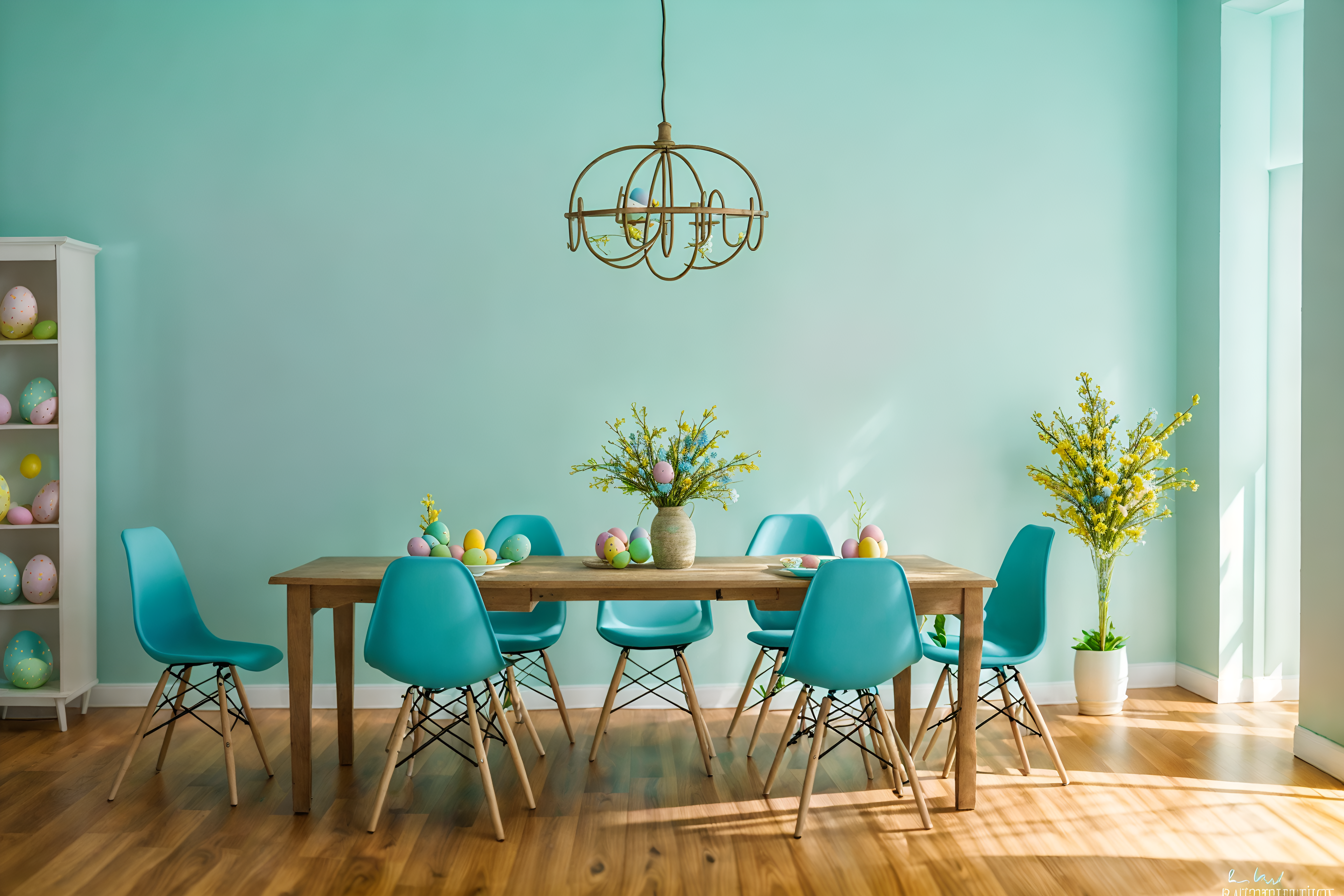 photo from pinterest of easter-style interior designed (exhibition space interior) . with easter decorations and light blue colors and flowers on table and spring decorations and colorful easter eggs and easter decorations. . cinematic photo, highly detailed, cinematic lighting, ultra-detailed, ultrarealistic, photorealism, 8k. trending on pinterest. easter interior design style. masterpiece, cinematic light, ultrarealistic+, photorealistic+, 8k, raw photo, realistic, sharp focus on eyes, (symmetrical eyes), (intact eyes), hyperrealistic, highest quality, best quality, , highly detailed, masterpiece, best quality, extremely detailed 8k wallpaper, masterpiece, best quality, ultra-detailed, best shadow, detailed background, detailed face, detailed eyes, high contrast, best illumination, detailed face, dulux, caustic, dynamic angle, detailed glow. dramatic lighting. highly detailed, insanely detailed hair, symmetrical, intricate details, professionally retouched, 8k high definition. strong bokeh. award winning photo.