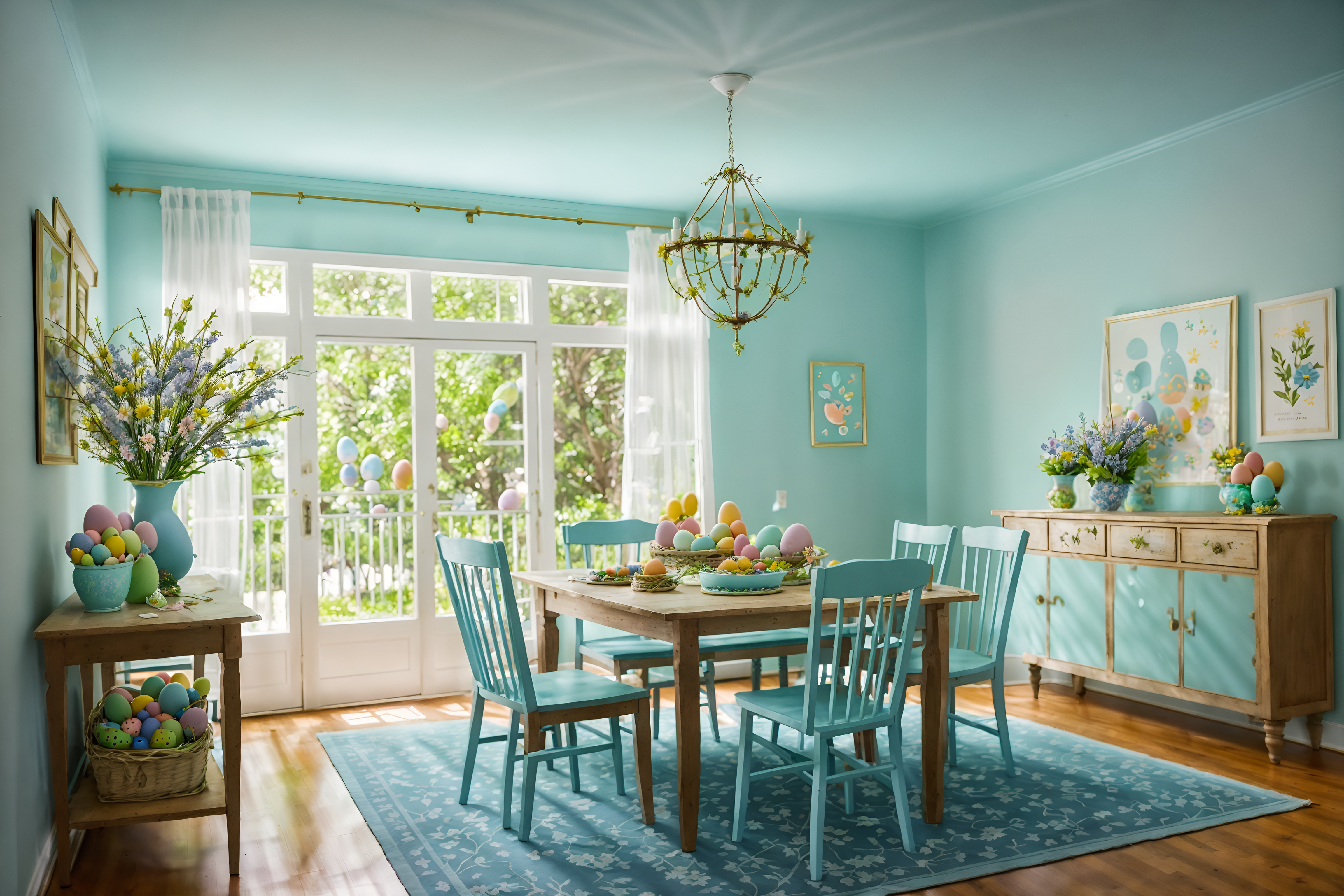 photo from pinterest of easter-style interior designed (exhibition space interior) . with easter decorations and light blue colors and flowers on table and colorful easter eggs and spring decorations and easter decorations. . cinematic photo, highly detailed, cinematic lighting, ultra-detailed, ultrarealistic, photorealism, 8k. trending on pinterest. easter interior design style. masterpiece, cinematic light, ultrarealistic+, photorealistic+, 8k, raw photo, realistic, sharp focus on eyes, (symmetrical eyes), (intact eyes), hyperrealistic, highest quality, best quality, , highly detailed, masterpiece, best quality, extremely detailed 8k wallpaper, masterpiece, best quality, ultra-detailed, best shadow, detailed background, detailed face, detailed eyes, high contrast, best illumination, detailed face, dulux, caustic, dynamic angle, detailed glow. dramatic lighting. highly detailed, insanely detailed hair, symmetrical, intricate details, professionally retouched, 8k high definition. strong bokeh. award winning photo.