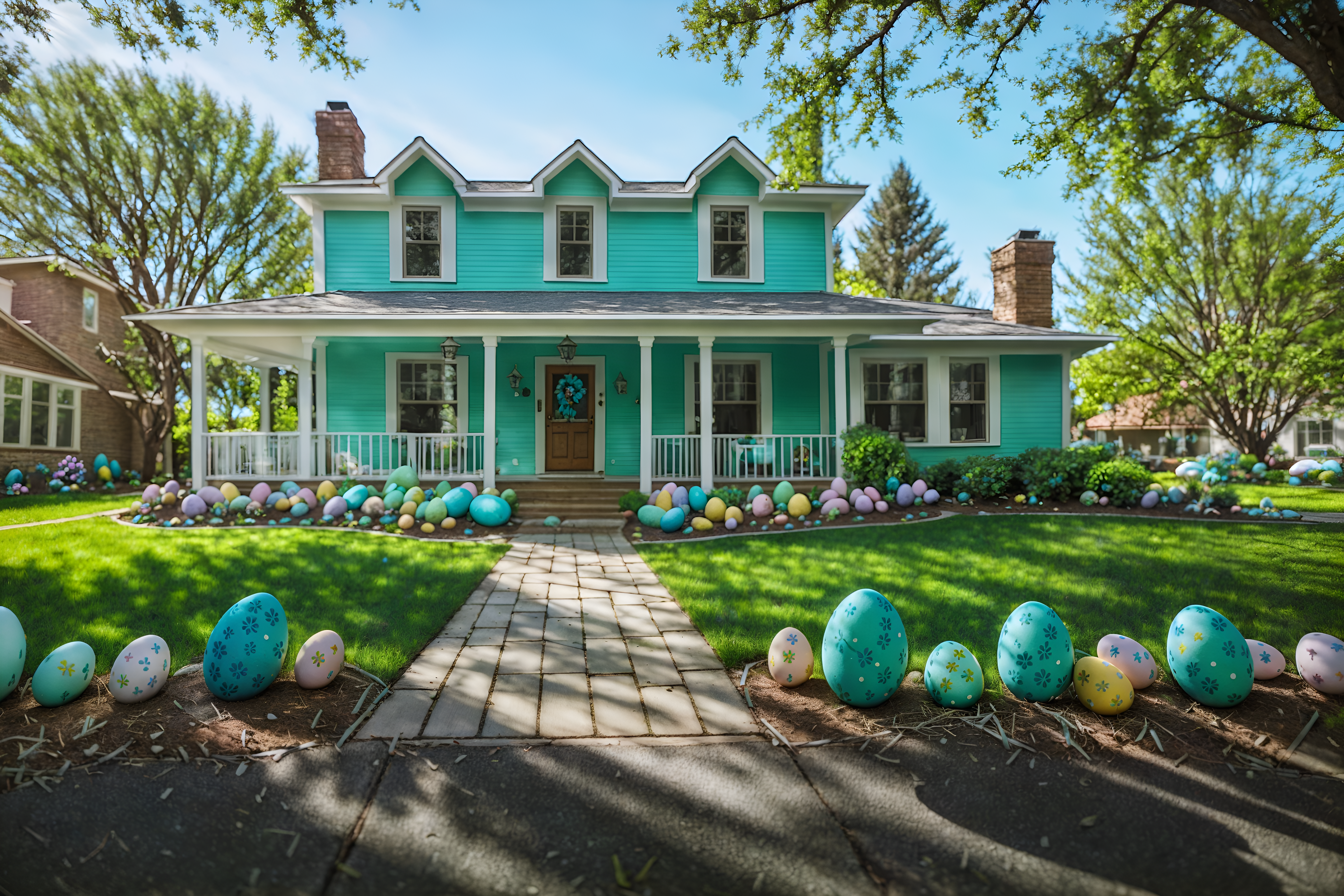 photo from pinterest of easter-style exterior designed (house exterior exterior) . with light blue colors and spring decorations and colorful easter eggs and flowers on table and easter decorations and light blue colors. . cinematic photo, highly detailed, cinematic lighting, ultra-detailed, ultrarealistic, photorealism, 8k. trending on pinterest. easter exterior design style. masterpiece, cinematic light, ultrarealistic+, photorealistic+, 8k, raw photo, realistic, sharp focus on eyes, (symmetrical eyes), (intact eyes), hyperrealistic, highest quality, best quality, , highly detailed, masterpiece, best quality, extremely detailed 8k wallpaper, masterpiece, best quality, ultra-detailed, best shadow, detailed background, detailed face, detailed eyes, high contrast, best illumination, detailed face, dulux, caustic, dynamic angle, detailed glow. dramatic lighting. highly detailed, insanely detailed hair, symmetrical, intricate details, professionally retouched, 8k high definition. strong bokeh. award winning photo.