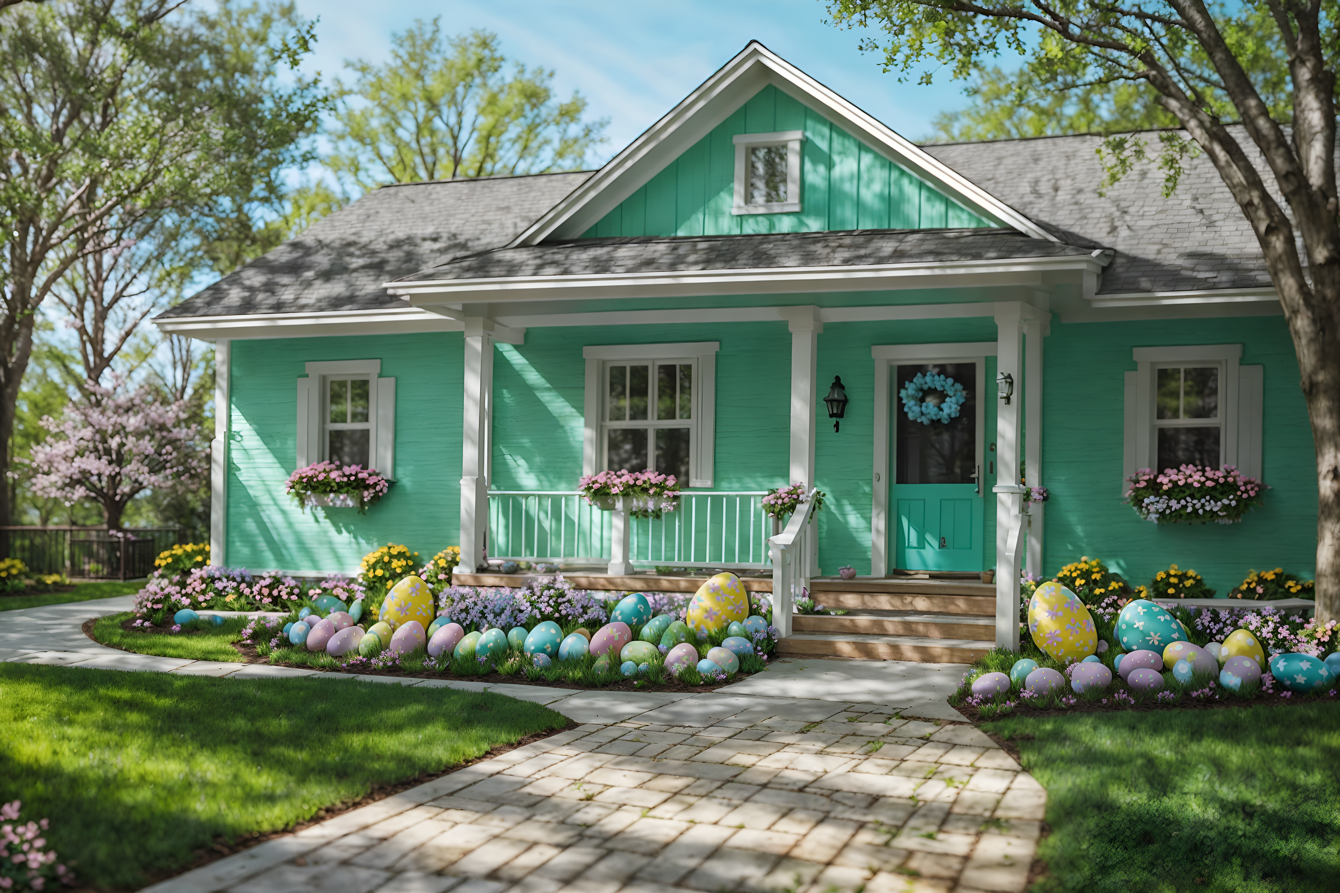 photo from pinterest of easter-style exterior designed (house exterior exterior) . with spring decorations and colorful easter eggs and light blue colors and easter decorations and flowers on table and spring decorations. . cinematic photo, highly detailed, cinematic lighting, ultra-detailed, ultrarealistic, photorealism, 8k. trending on pinterest. easter exterior design style. masterpiece, cinematic light, ultrarealistic+, photorealistic+, 8k, raw photo, realistic, sharp focus on eyes, (symmetrical eyes), (intact eyes), hyperrealistic, highest quality, best quality, , highly detailed, masterpiece, best quality, extremely detailed 8k wallpaper, masterpiece, best quality, ultra-detailed, best shadow, detailed background, detailed face, detailed eyes, high contrast, best illumination, detailed face, dulux, caustic, dynamic angle, detailed glow. dramatic lighting. highly detailed, insanely detailed hair, symmetrical, intricate details, professionally retouched, 8k high definition. strong bokeh. award winning photo.