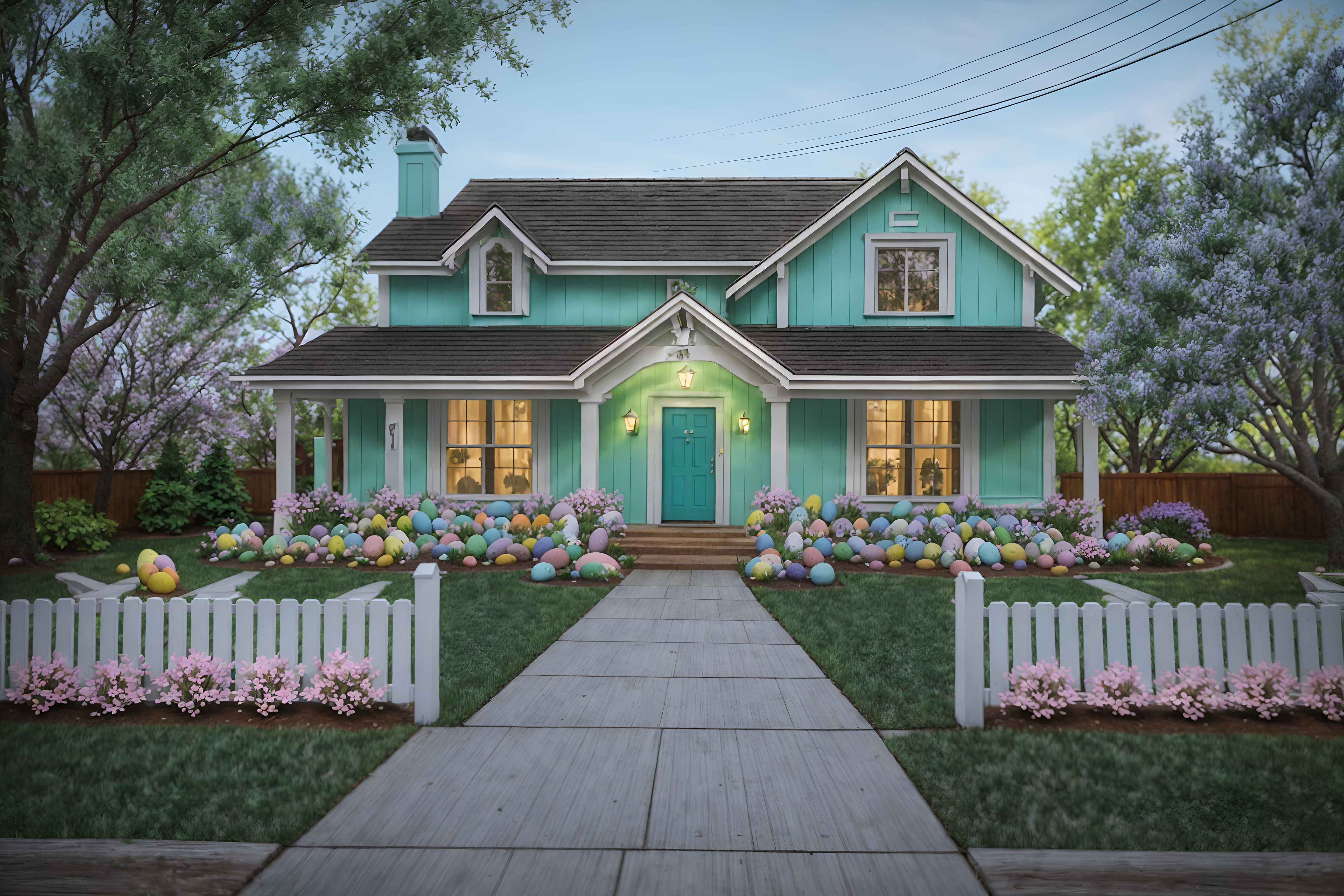 photo from pinterest of easter-style exterior designed (house exterior exterior) . with spring decorations and colorful easter eggs and light blue colors and easter decorations and flowers on table and spring decorations. . cinematic photo, highly detailed, cinematic lighting, ultra-detailed, ultrarealistic, photorealism, 8k. trending on pinterest. easter exterior design style. masterpiece, cinematic light, ultrarealistic+, photorealistic+, 8k, raw photo, realistic, sharp focus on eyes, (symmetrical eyes), (intact eyes), hyperrealistic, highest quality, best quality, , highly detailed, masterpiece, best quality, extremely detailed 8k wallpaper, masterpiece, best quality, ultra-detailed, best shadow, detailed background, detailed face, detailed eyes, high contrast, best illumination, detailed face, dulux, caustic, dynamic angle, detailed glow. dramatic lighting. highly detailed, insanely detailed hair, symmetrical, intricate details, professionally retouched, 8k high definition. strong bokeh. award winning photo.