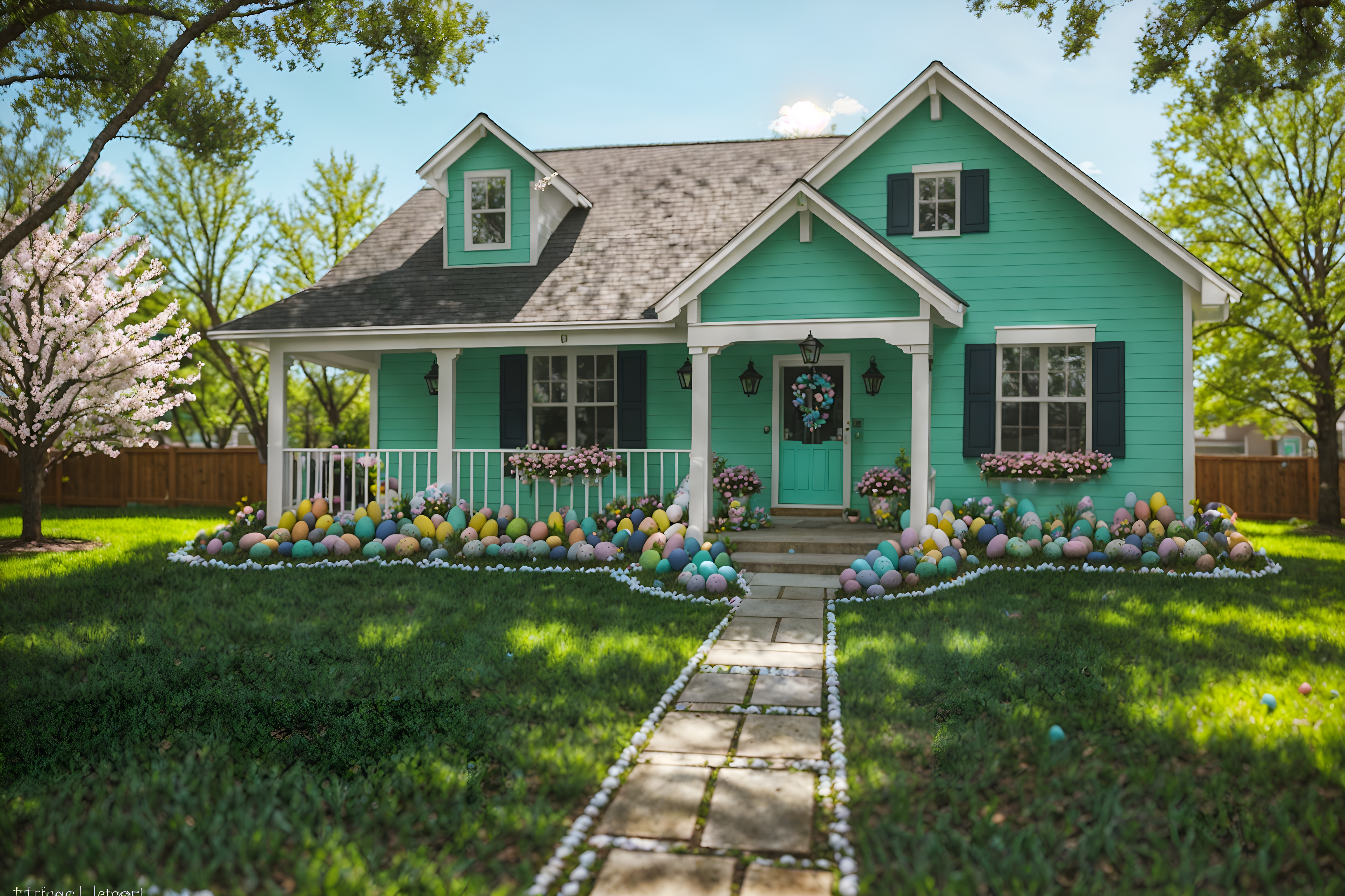 photo from pinterest of easter-style exterior designed (house exterior exterior) . with spring decorations and colorful easter eggs and light blue colors and easter decorations and flowers on table and spring decorations. . cinematic photo, highly detailed, cinematic lighting, ultra-detailed, ultrarealistic, photorealism, 8k. trending on pinterest. easter exterior design style. masterpiece, cinematic light, ultrarealistic+, photorealistic+, 8k, raw photo, realistic, sharp focus on eyes, (symmetrical eyes), (intact eyes), hyperrealistic, highest quality, best quality, , highly detailed, masterpiece, best quality, extremely detailed 8k wallpaper, masterpiece, best quality, ultra-detailed, best shadow, detailed background, detailed face, detailed eyes, high contrast, best illumination, detailed face, dulux, caustic, dynamic angle, detailed glow. dramatic lighting. highly detailed, insanely detailed hair, symmetrical, intricate details, professionally retouched, 8k high definition. strong bokeh. award winning photo.