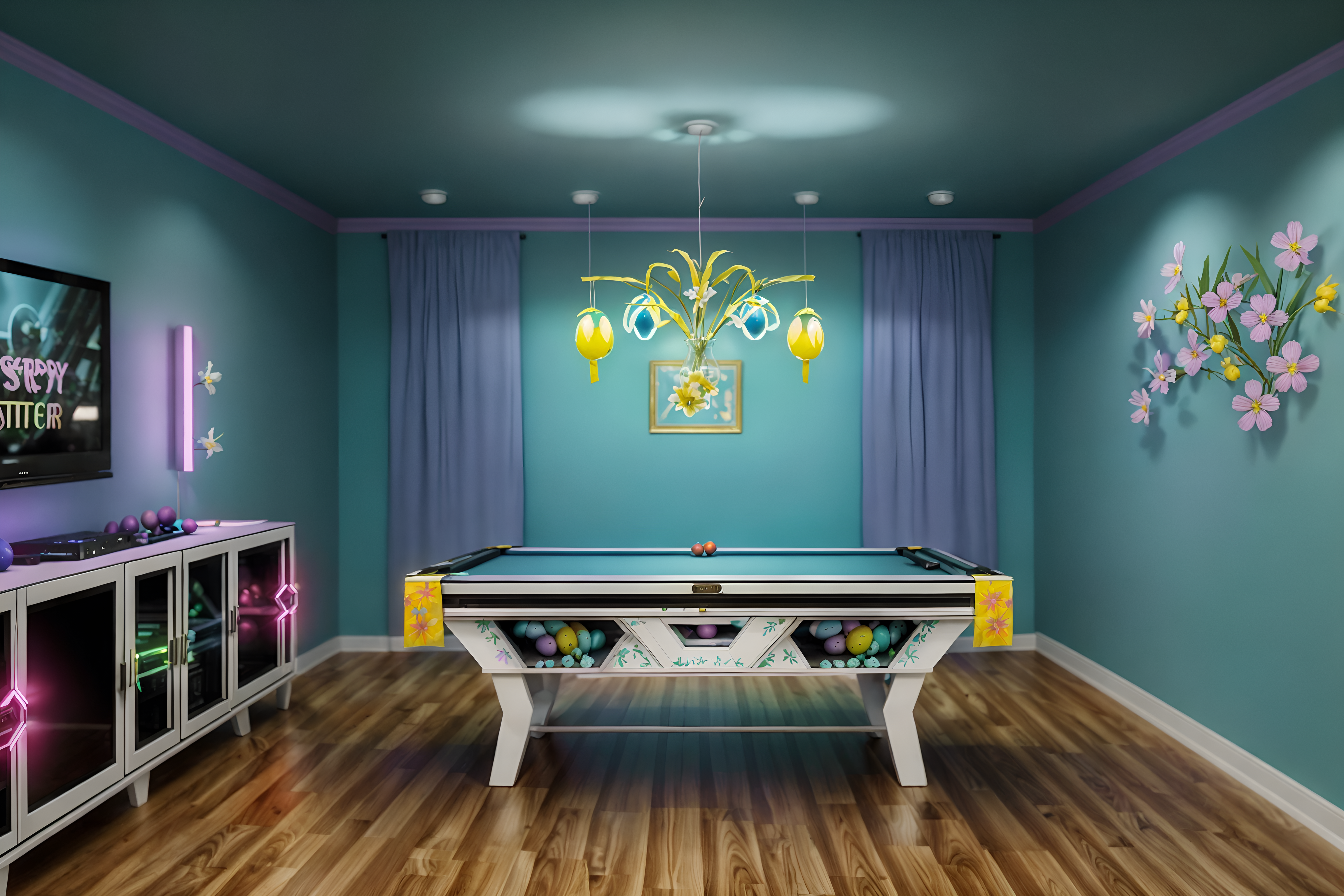 photo from pinterest of easter-style interior designed (gaming room interior) . with colorful easter eggs and light blue colors and easter decorations and flowers on table and spring decorations and colorful easter eggs. . cinematic photo, highly detailed, cinematic lighting, ultra-detailed, ultrarealistic, photorealism, 8k. trending on pinterest. easter interior design style. masterpiece, cinematic light, ultrarealistic+, photorealistic+, 8k, raw photo, realistic, sharp focus on eyes, (symmetrical eyes), (intact eyes), hyperrealistic, highest quality, best quality, , highly detailed, masterpiece, best quality, extremely detailed 8k wallpaper, masterpiece, best quality, ultra-detailed, best shadow, detailed background, detailed face, detailed eyes, high contrast, best illumination, detailed face, dulux, caustic, dynamic angle, detailed glow. dramatic lighting. highly detailed, insanely detailed hair, symmetrical, intricate details, professionally retouched, 8k high definition. strong bokeh. award winning photo.