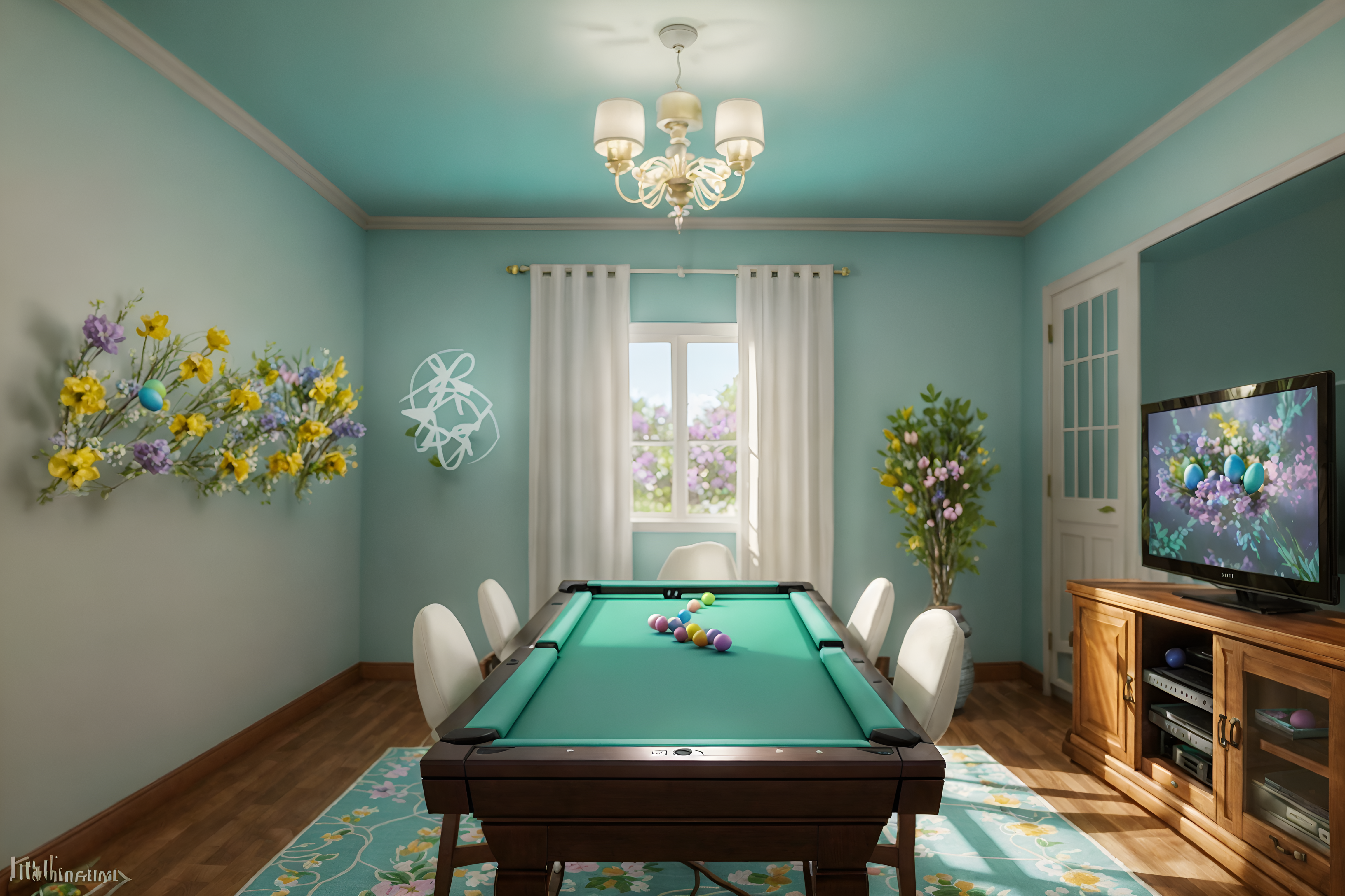 photo from pinterest of easter-style interior designed (gaming room interior) . with colorful easter eggs and light blue colors and easter decorations and flowers on table and spring decorations and colorful easter eggs. . cinematic photo, highly detailed, cinematic lighting, ultra-detailed, ultrarealistic, photorealism, 8k. trending on pinterest. easter interior design style. masterpiece, cinematic light, ultrarealistic+, photorealistic+, 8k, raw photo, realistic, sharp focus on eyes, (symmetrical eyes), (intact eyes), hyperrealistic, highest quality, best quality, , highly detailed, masterpiece, best quality, extremely detailed 8k wallpaper, masterpiece, best quality, ultra-detailed, best shadow, detailed background, detailed face, detailed eyes, high contrast, best illumination, detailed face, dulux, caustic, dynamic angle, detailed glow. dramatic lighting. highly detailed, insanely detailed hair, symmetrical, intricate details, professionally retouched, 8k high definition. strong bokeh. award winning photo.