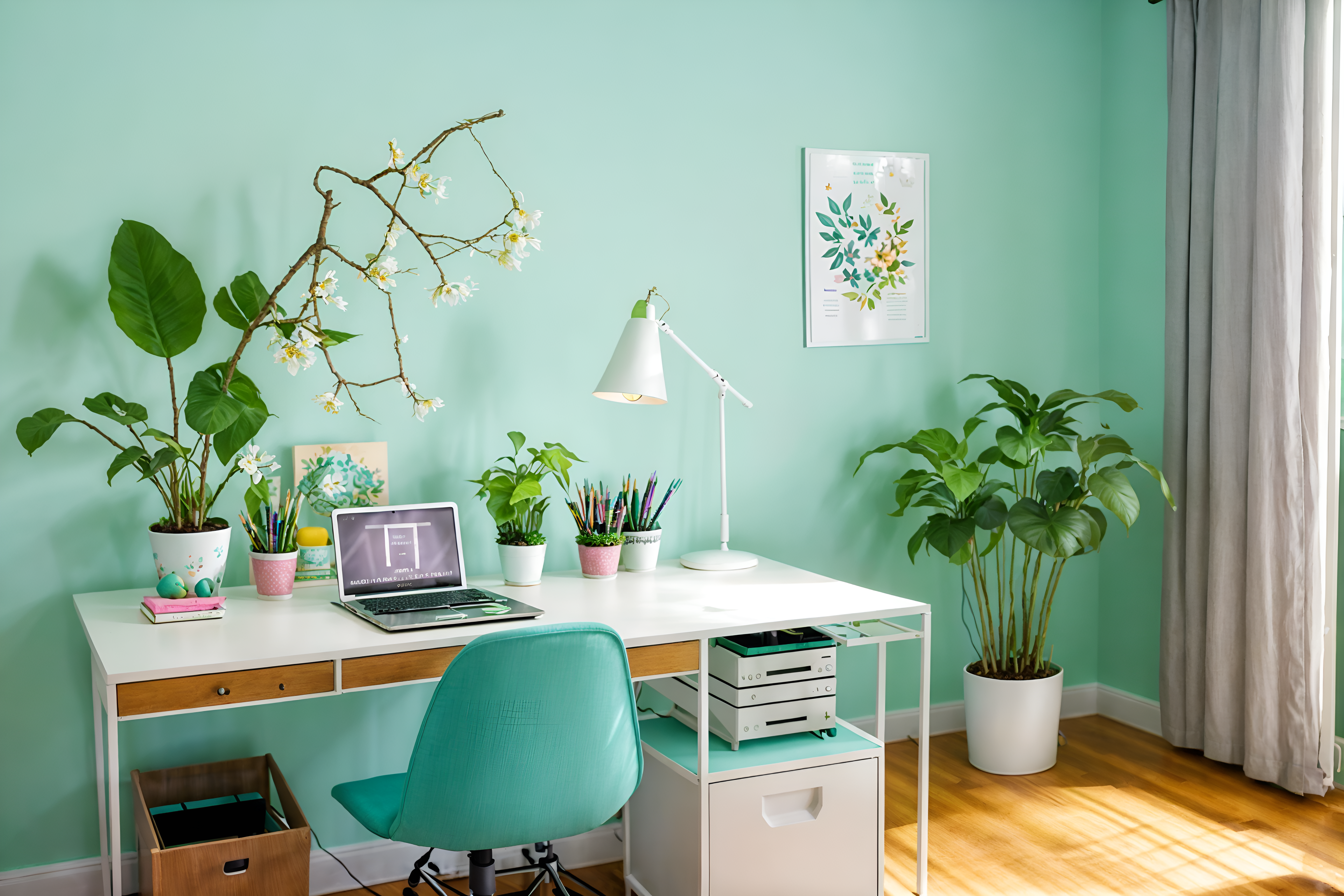 photo from pinterest of easter-style interior designed (home office interior) with plant and cabinets and computer desk and desk lamp and office chair and plant. . with flowers on table and easter decorations and spring decorations and colorful easter eggs and light blue colors and flowers on table. . cinematic photo, highly detailed, cinematic lighting, ultra-detailed, ultrarealistic, photorealism, 8k. trending on pinterest. easter interior design style. masterpiece, cinematic light, ultrarealistic+, photorealistic+, 8k, raw photo, realistic, sharp focus on eyes, (symmetrical eyes), (intact eyes), hyperrealistic, highest quality, best quality, , highly detailed, masterpiece, best quality, extremely detailed 8k wallpaper, masterpiece, best quality, ultra-detailed, best shadow, detailed background, detailed face, detailed eyes, high contrast, best illumination, detailed face, dulux, caustic, dynamic angle, detailed glow. dramatic lighting. highly detailed, insanely detailed hair, symmetrical, intricate details, professionally retouched, 8k high definition. strong bokeh. award winning photo.