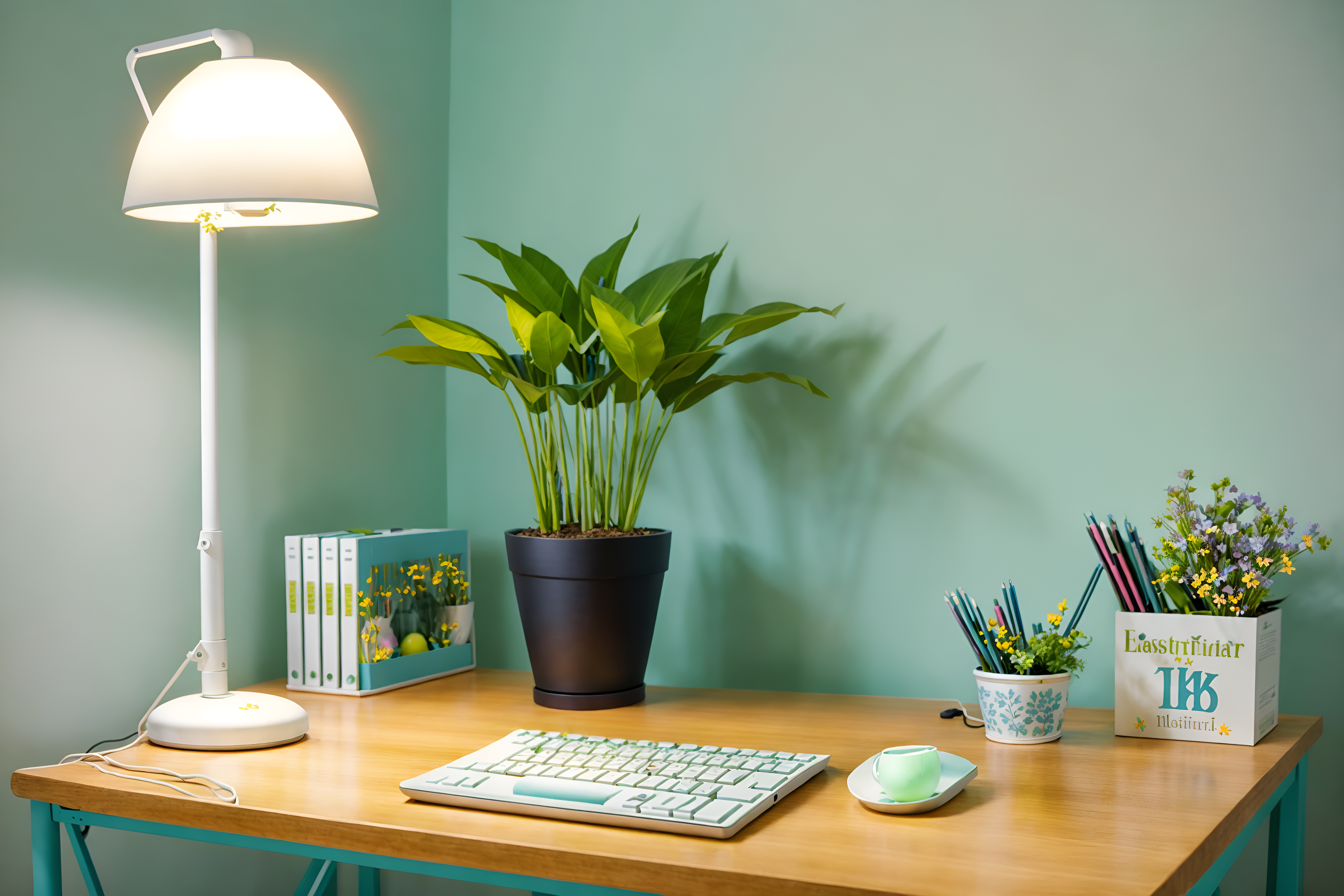 easter home officesinterior decorate this home office with easter style. . . with cabinets and desk lamp and office chair and plant and computer desk and cabinets. . with spring decorations and flowers on table and easter decorations and colorful easter eggs and light blue colors and spring decorations. . .