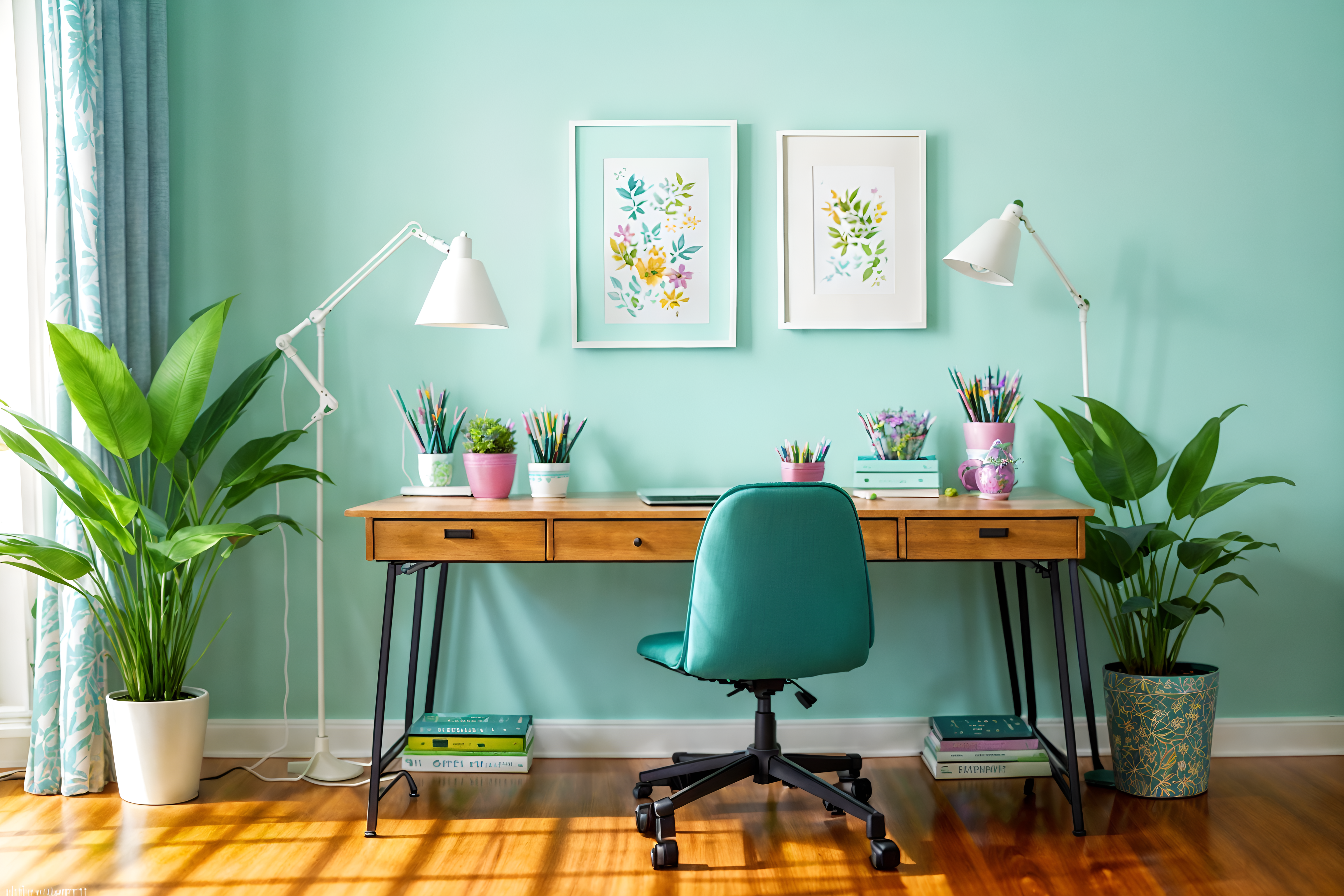 photo from pinterest of easter-style interior designed (home office interior) with plant and cabinets and computer desk and desk lamp and office chair and plant. . with flowers on table and easter decorations and spring decorations and colorful easter eggs and light blue colors and flowers on table. . cinematic photo, highly detailed, cinematic lighting, ultra-detailed, ultrarealistic, photorealism, 8k. trending on pinterest. easter interior design style. masterpiece, cinematic light, ultrarealistic+, photorealistic+, 8k, raw photo, realistic, sharp focus on eyes, (symmetrical eyes), (intact eyes), hyperrealistic, highest quality, best quality, , highly detailed, masterpiece, best quality, extremely detailed 8k wallpaper, masterpiece, best quality, ultra-detailed, best shadow, detailed background, detailed face, detailed eyes, high contrast, best illumination, detailed face, dulux, caustic, dynamic angle, detailed glow. dramatic lighting. highly detailed, insanely detailed hair, symmetrical, intricate details, professionally retouched, 8k high definition. strong bokeh. award winning photo.