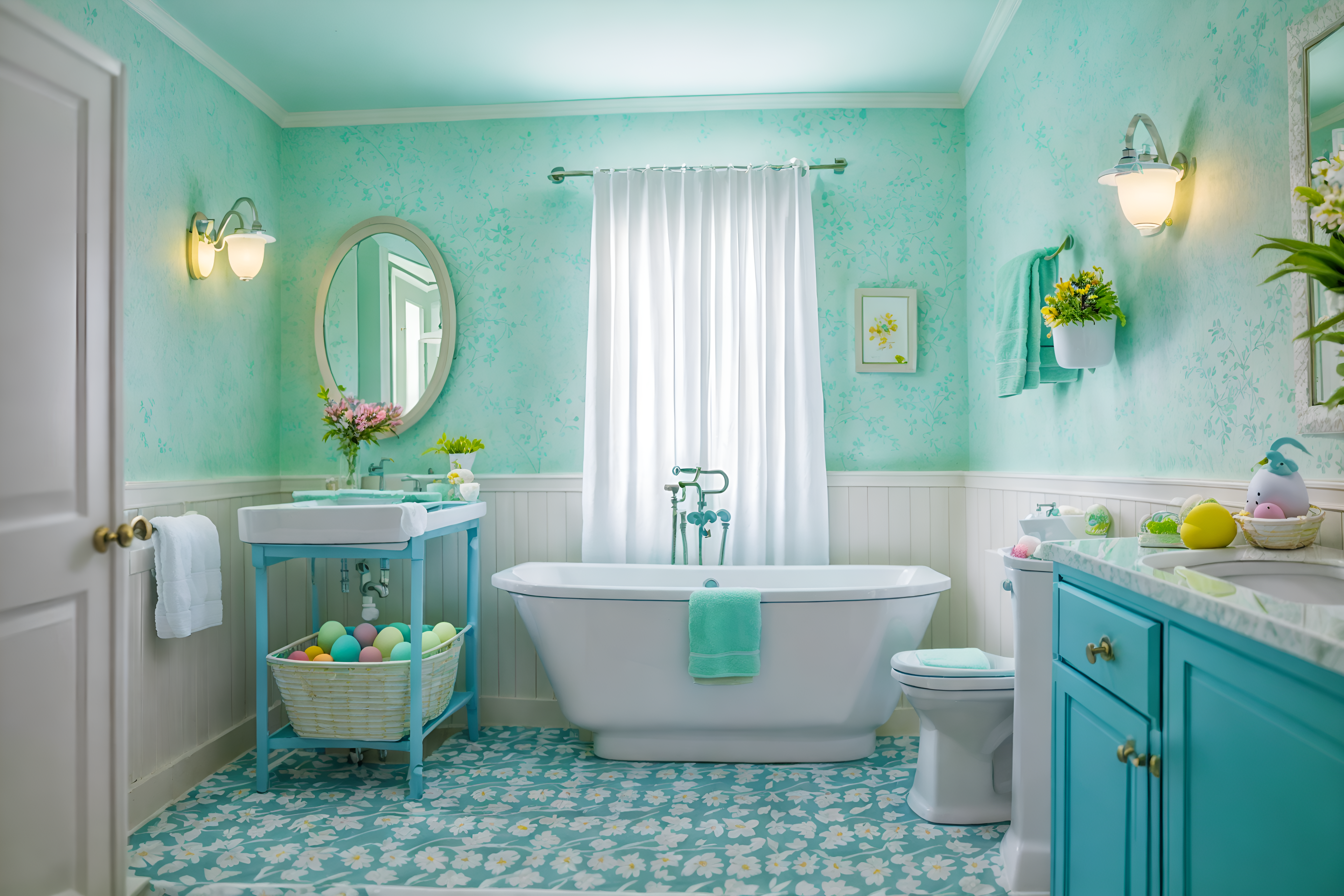 photo from pinterest of easter-style interior designed (hotel bathroom interior) with toilet seat and bathroom sink with faucet and bathtub and waste basket and bathroom cabinet and plant and bath rail and shower. . with light blue colors and spring decorations and flowers on table and colorful easter eggs and easter decorations and light blue colors. . cinematic photo, highly detailed, cinematic lighting, ultra-detailed, ultrarealistic, photorealism, 8k. trending on pinterest. easter interior design style. masterpiece, cinematic light, ultrarealistic+, photorealistic+, 8k, raw photo, realistic, sharp focus on eyes, (symmetrical eyes), (intact eyes), hyperrealistic, highest quality, best quality, , highly detailed, masterpiece, best quality, extremely detailed 8k wallpaper, masterpiece, best quality, ultra-detailed, best shadow, detailed background, detailed face, detailed eyes, high contrast, best illumination, detailed face, dulux, caustic, dynamic angle, detailed glow. dramatic lighting. highly detailed, insanely detailed hair, symmetrical, intricate details, professionally retouched, 8k high definition. strong bokeh. award winning photo.
